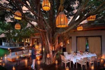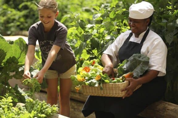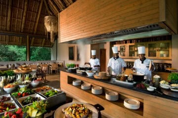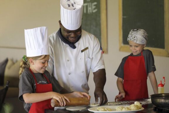 The dining area surrounds an interactive kitchen and vegetable garden, making food an integral part of the safari experience.