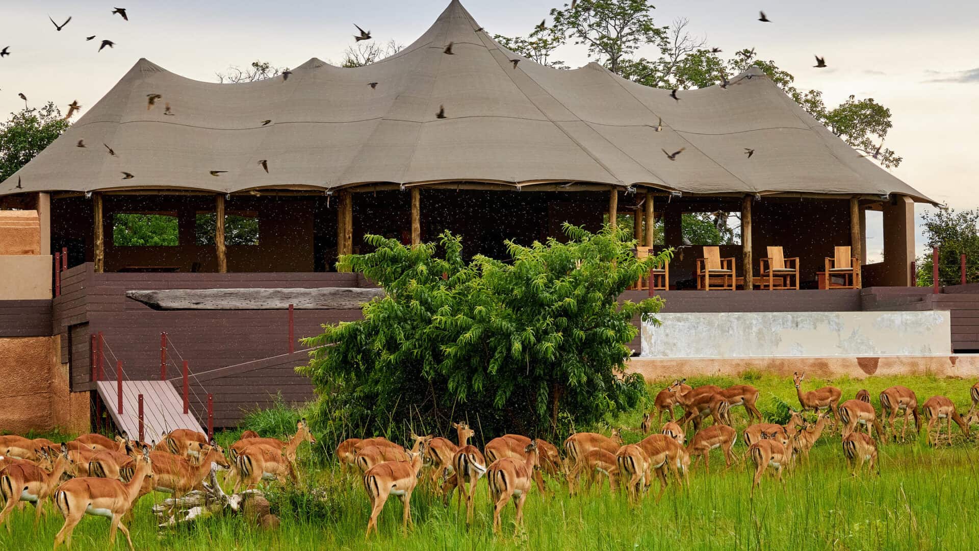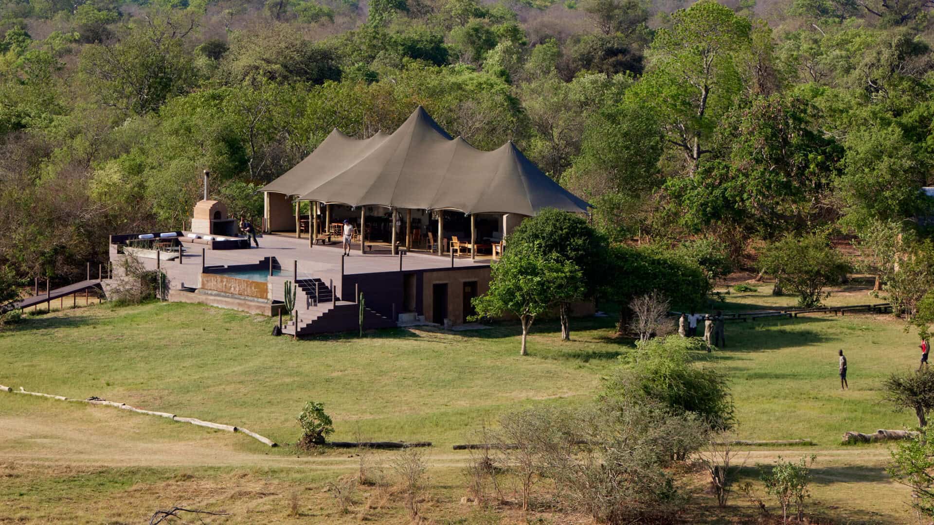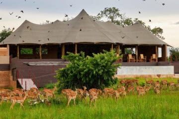 With no surrounding fence, Konkamoya Lodge integrates seamlessly into the surrounding bush deep in the heart of Kafue National Park.