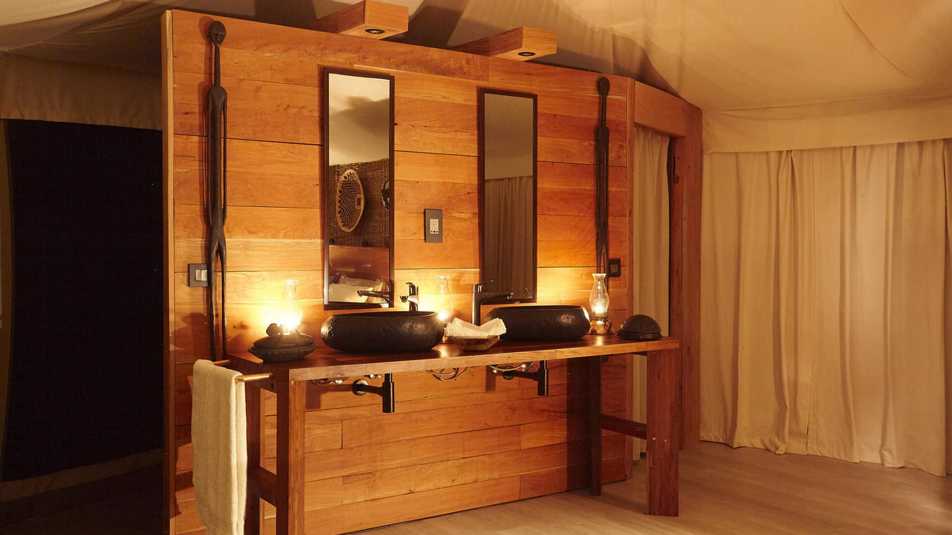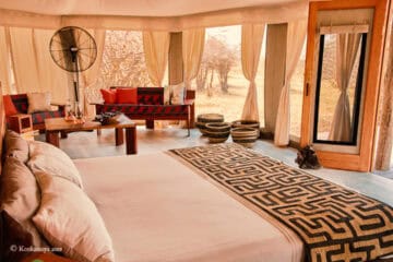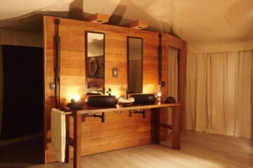Each of the four tents is located on a wooden platform a metre above the ground to deter unwanted guests, while inside accommodation mimics a small apartment, complete with bedroom, sitting room, and bathroom with hot and cold running water and shower: comfort and elegance in nature.