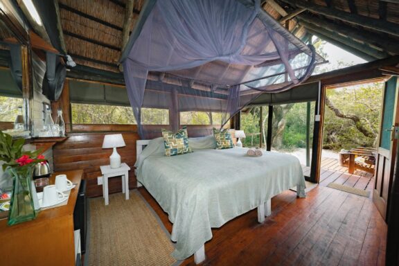 A lovely sweeping pool overlooks Lake Shengeza where one can relax on the viewing deck in the shade of Umdoni trees while watching hippos & flamingoes in the lake.