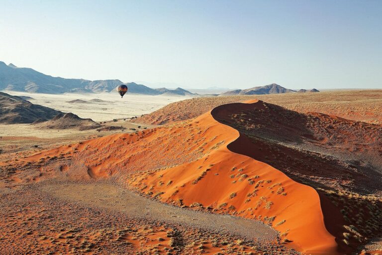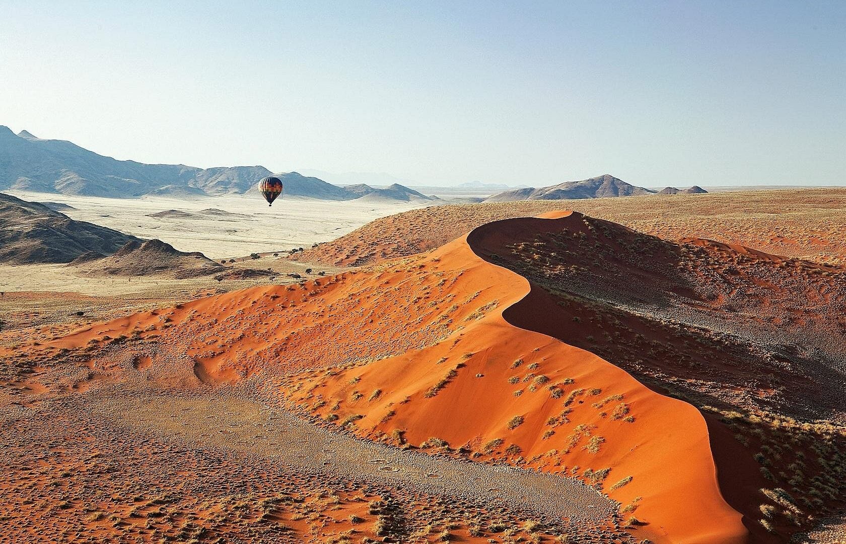The large clay pan near the famed Sossusvlei flanks the iconic red dunes that stand out vividly against the blue sky.