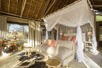 Six light and stylish safari rooms are complete with comfortable beds, en-suite indoor and outdoor bucket and flushing loos. The family tent has two en-suite bedrooms and an adjoining corridor which is zipped up at night to make it safe for little ones to reach their parents should they need to. They rest amongst the trees with views over the African bush.