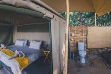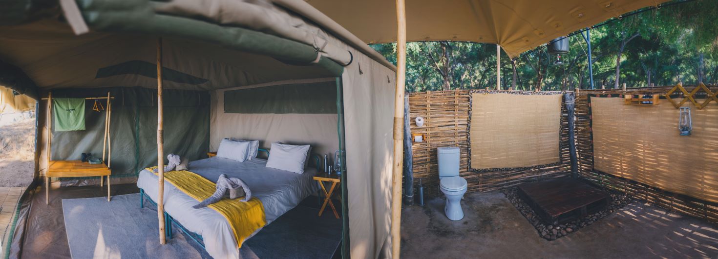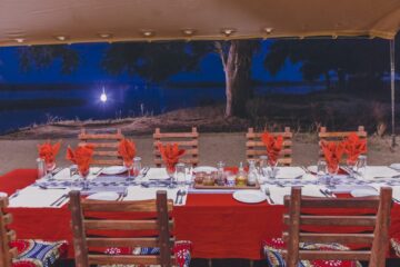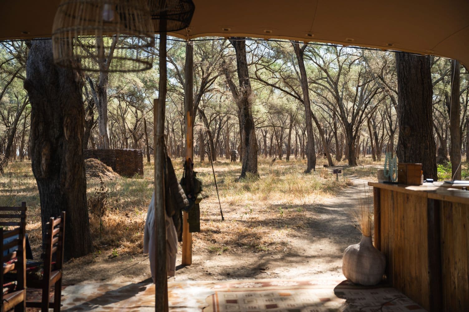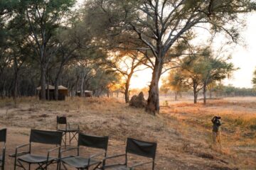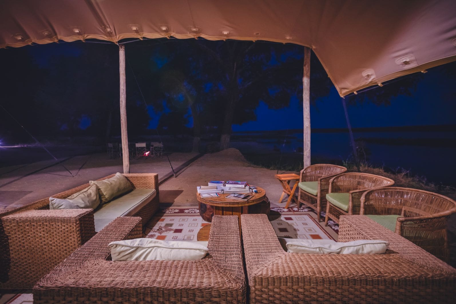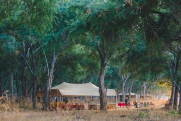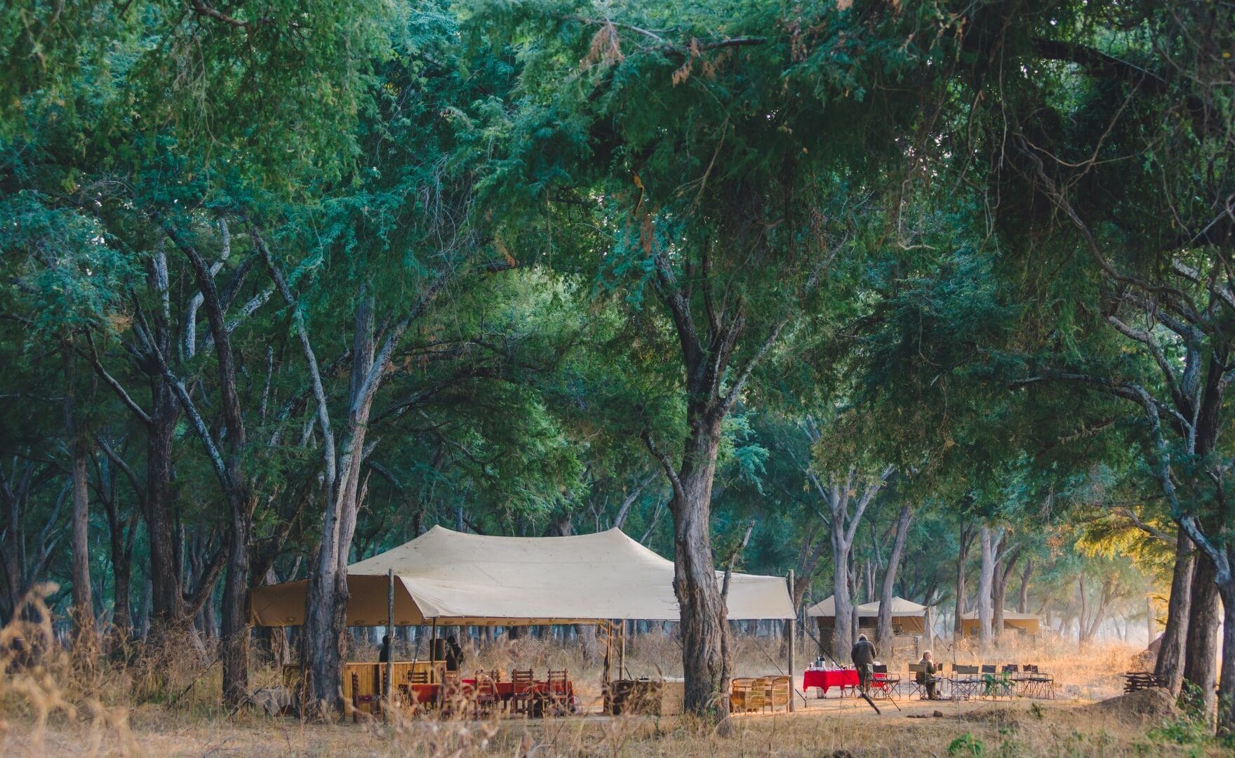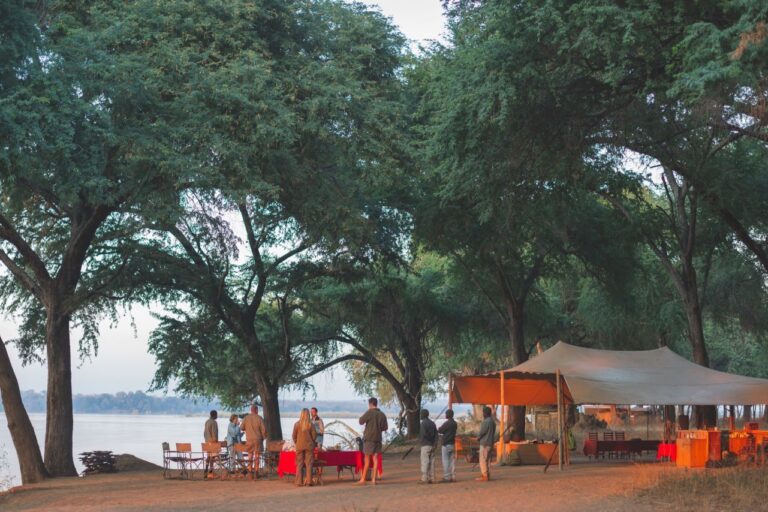 Each tent is designed for comfort and positioned to offer stunning views across the Zambezi River. The camp’s main area, nestled under towering winter thorn trees, provides a perfect setting for meals, wildlife watching, and relaxation.