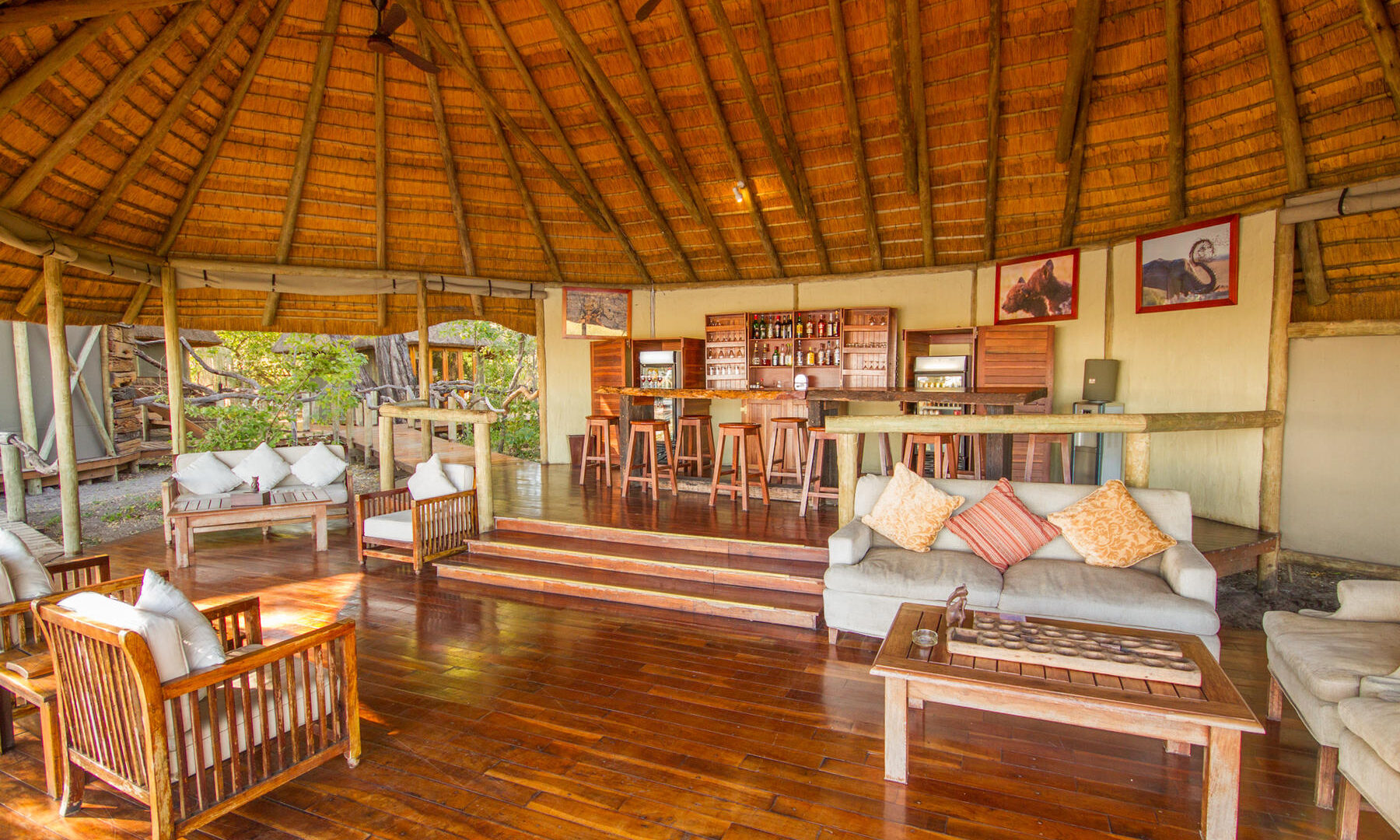 The main thatched areas of the camp include a bar/lounge, dining area, curio shop and second-level library overlooking the river.