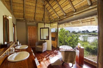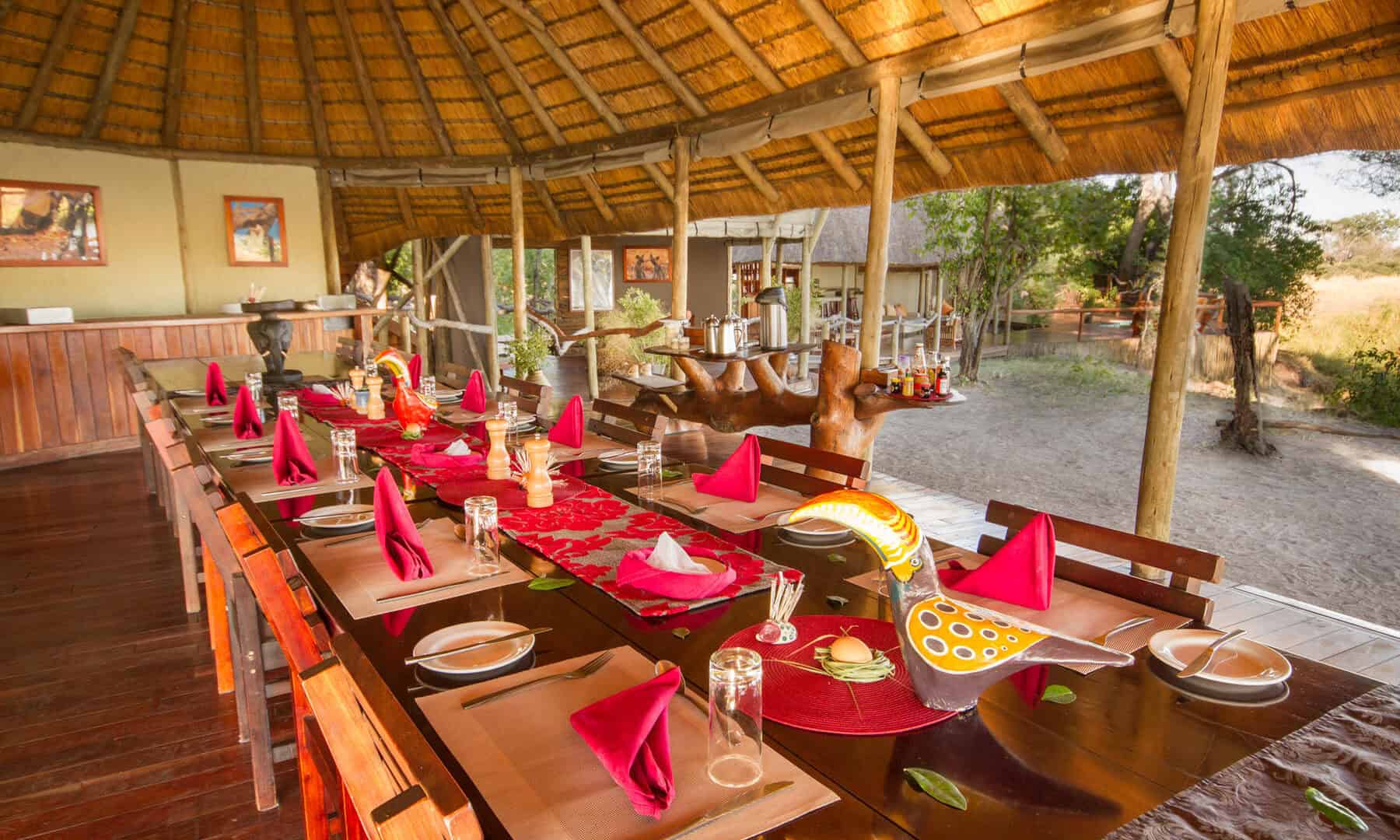 The main thatched areas of the camp include a bar/lounge, dining area, curio shop and second-level library overlooking the river.