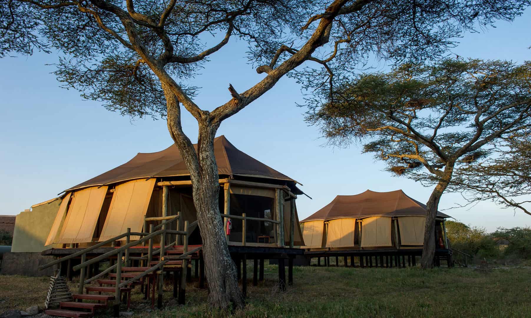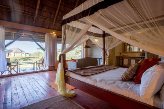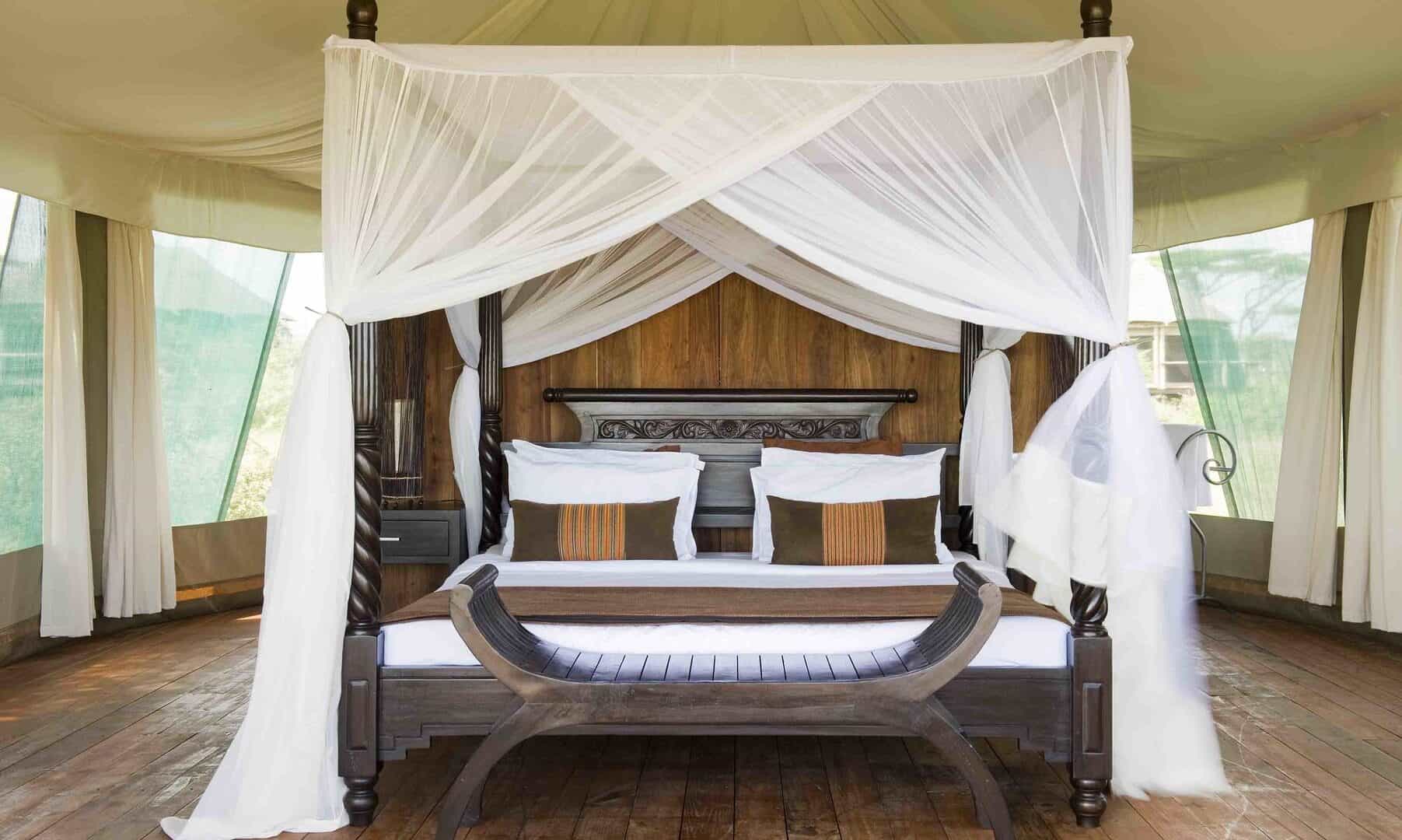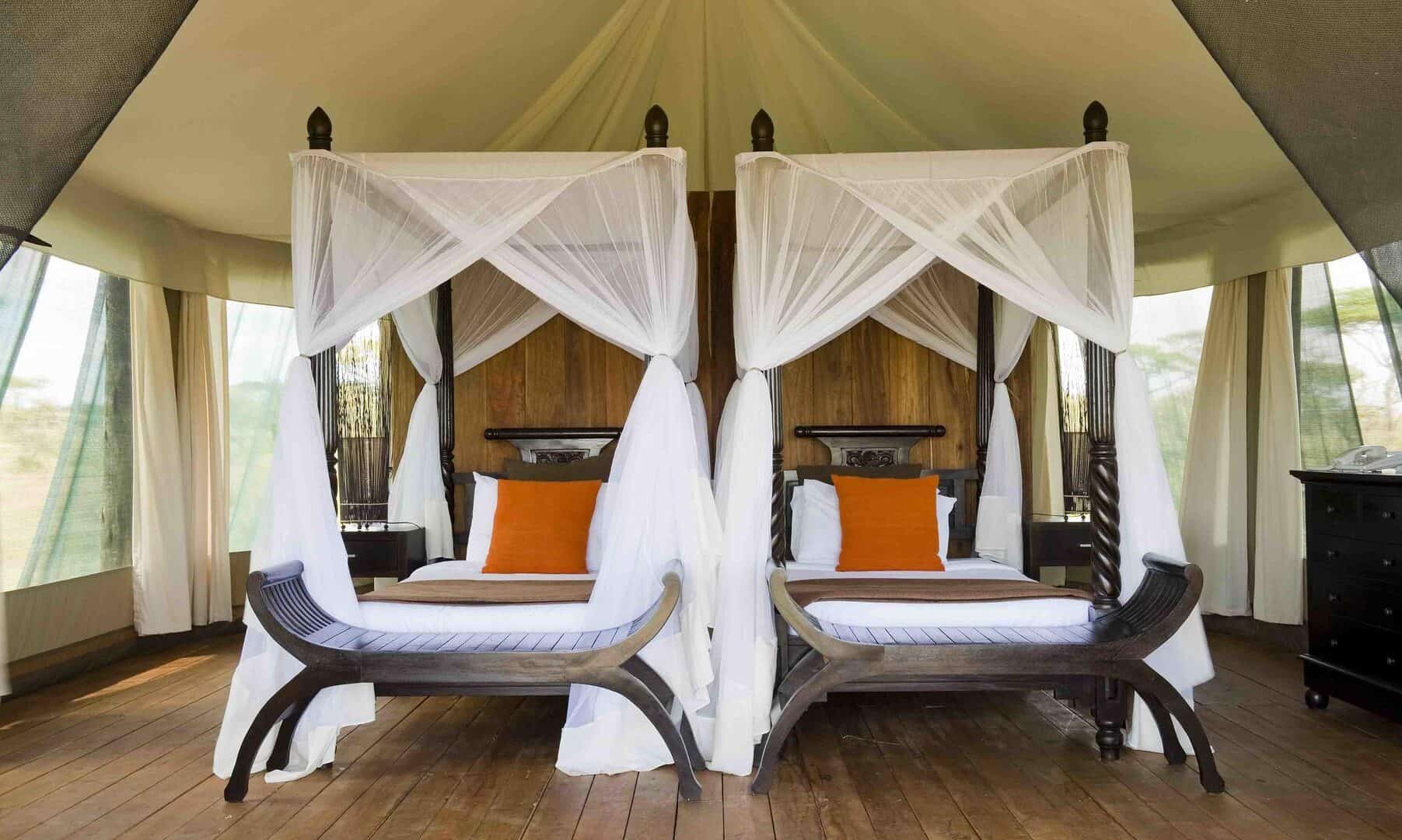 Guest accommodations feature 30 luxury tents with en suite facilities and either king sized beds, twins or triple beds. Each tent is built on a raised wooden platform with a veranda from which guests can observe the wildlife visiting Lake Masek.
