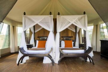 Guest accommodations feature 30 luxury tents with en suite facilities and either king sized beds, twins or triple beds. Each tent is built on a raised wooden platform with a veranda from which guests can observe the wildlife visiting Lake Masek.