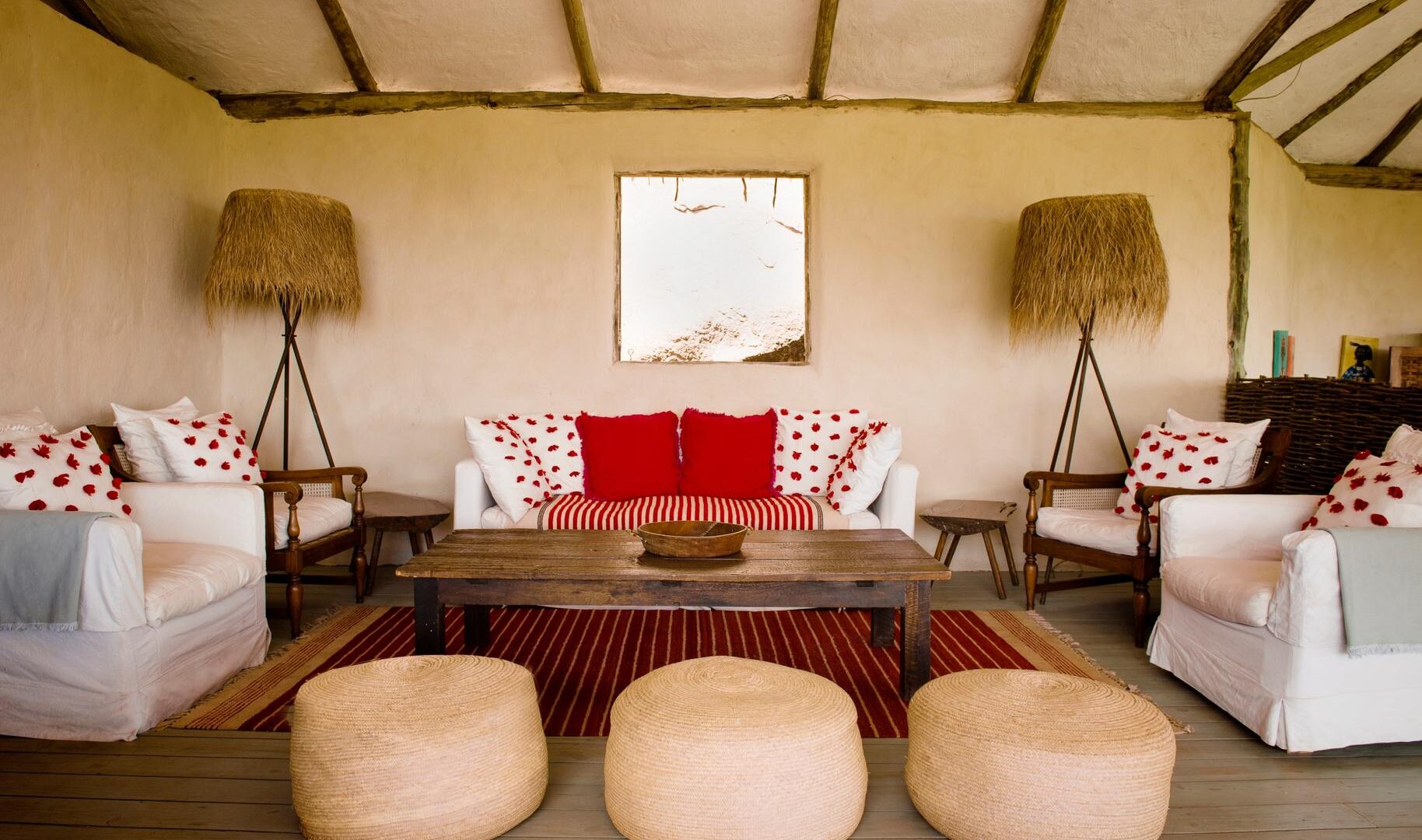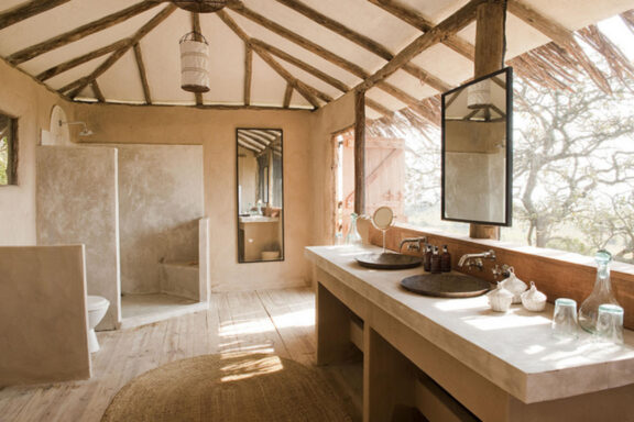 Each of the rooms is designed to fit into the complex geometry of the kopje and to make the most of this sensational location, its views and its natural space and light. The rooms are a blend of canvas, plaster and natural poles.