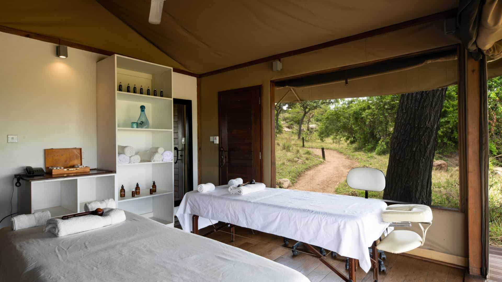 The central area includes an inviting lounge, bar, and outdoor deck with a fire, as well as an indoor heated pool to relax between safaris. Dining is flexible, with the option of a private catered lunch on the crater floor—perfect for those wishing to extend their game drives through the day.