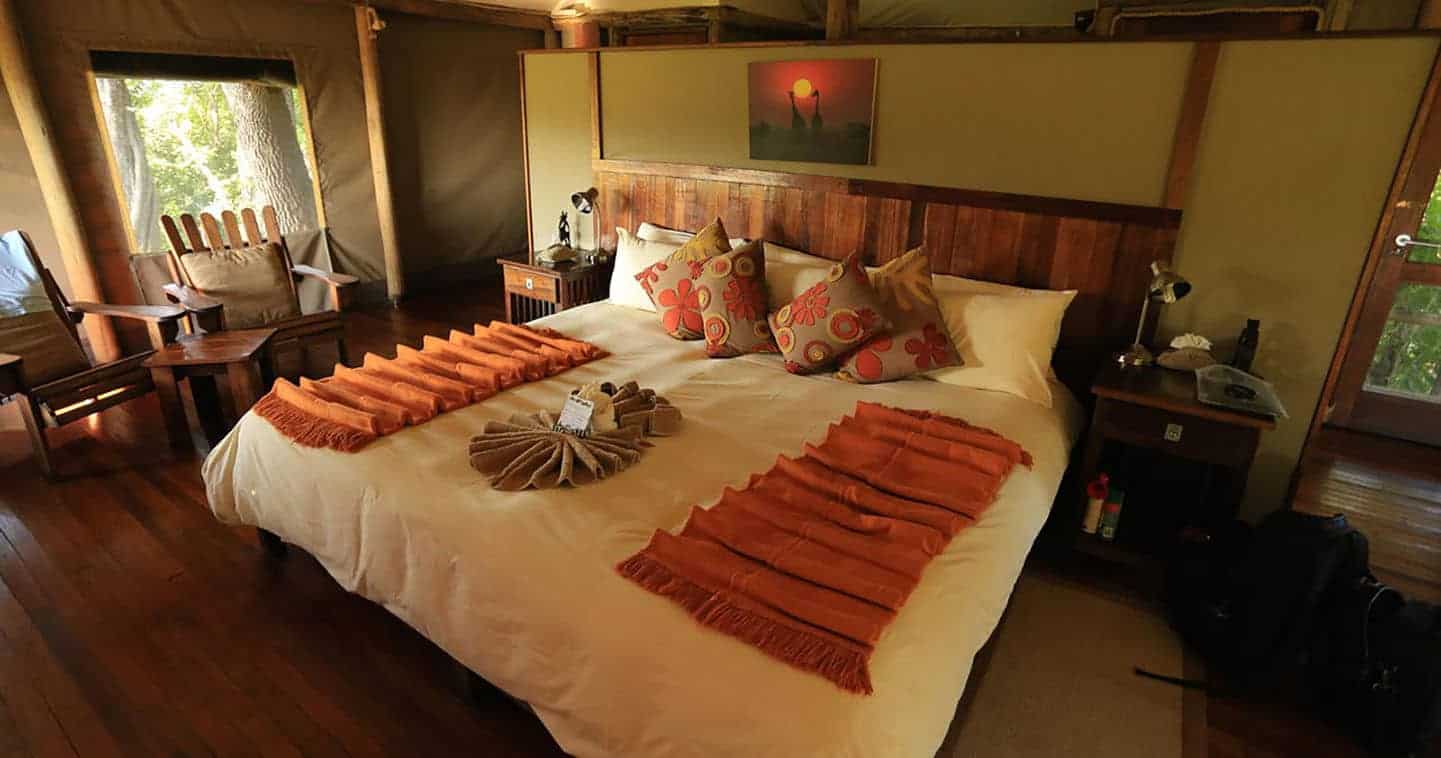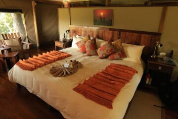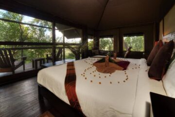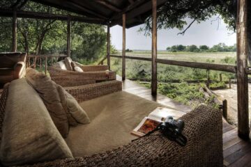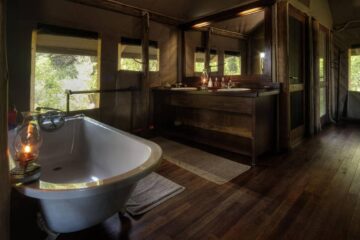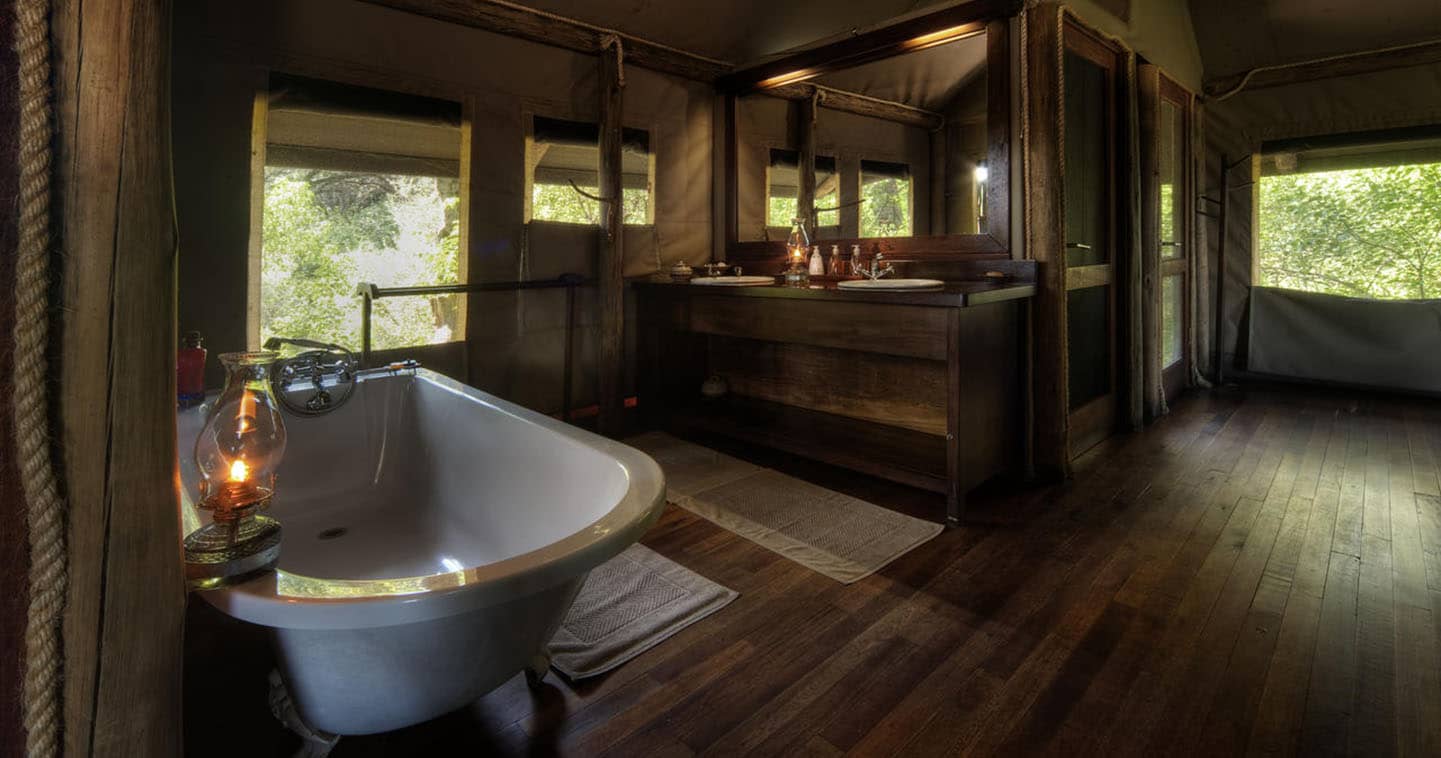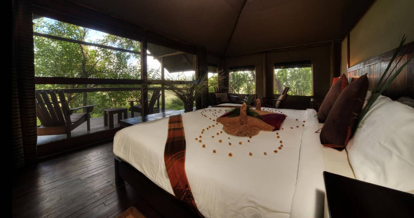 Little Kwara Camp features just five luxury tented suites raised on wooden decks to provide sweeping views of the surrounding floodplains. Your spacious accommodation captures the essence of a classic safari, complete with an en-suite bathroom that boasts both indoor and outdoor showers.