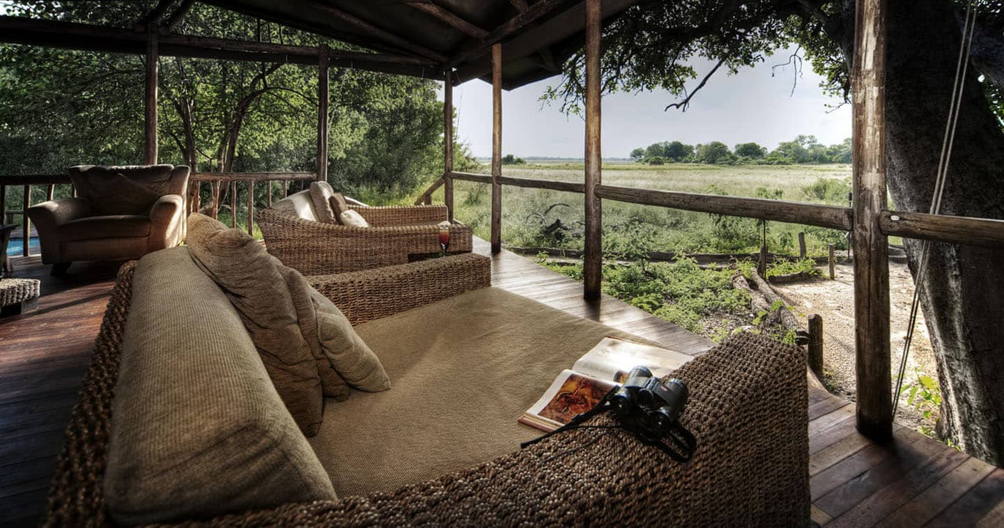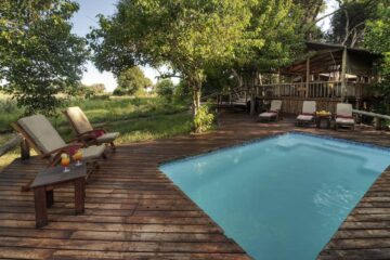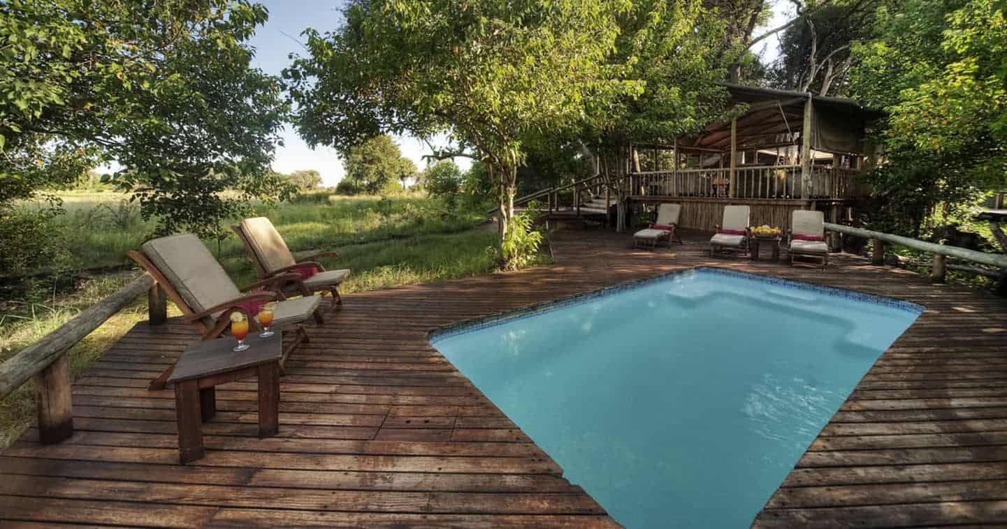 The main area serves as a relaxing hub where you can unwind in the open-sided lounge, dine on the deck, or cool off in the pool during the heat of the day. With access to both dry land and permanent water, you are offered a diverse range of activities, including day and night game drives, nature walks, boat cruises, and mokoro excursions through the channels.