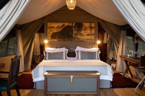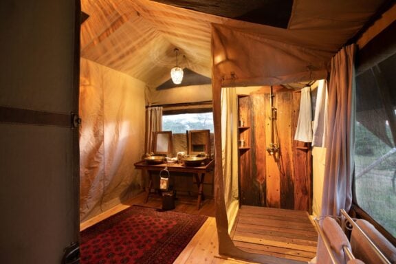 Mara Expedition Camp is safari chic, with six light and airy, spacious canvas tents, each with en-suite bathrooms where you can enjoy piping hot water from huge brass safari showers. It is set down low, hidden from lights and noise from other camps, properties, or any sign of mankind.