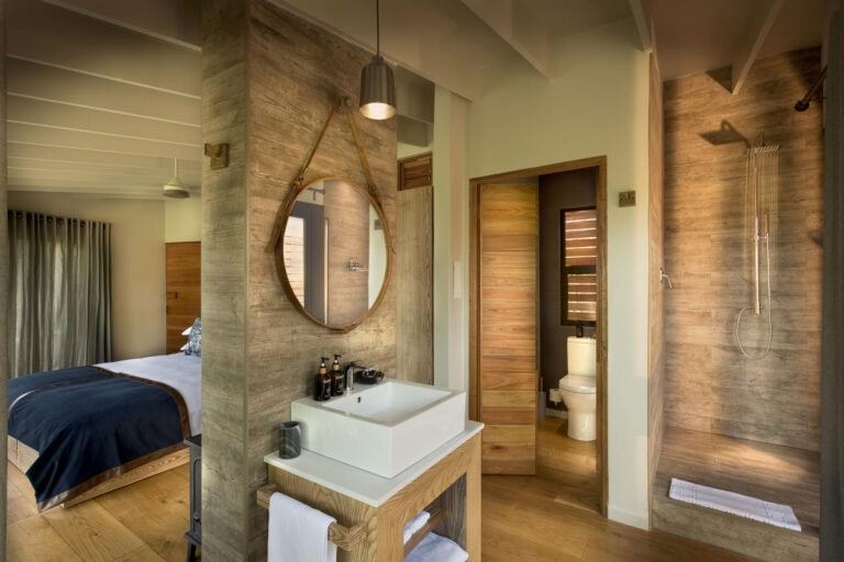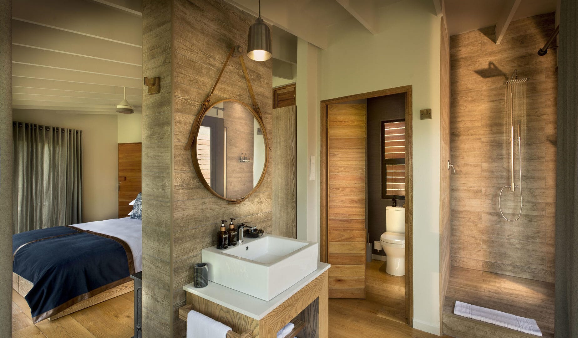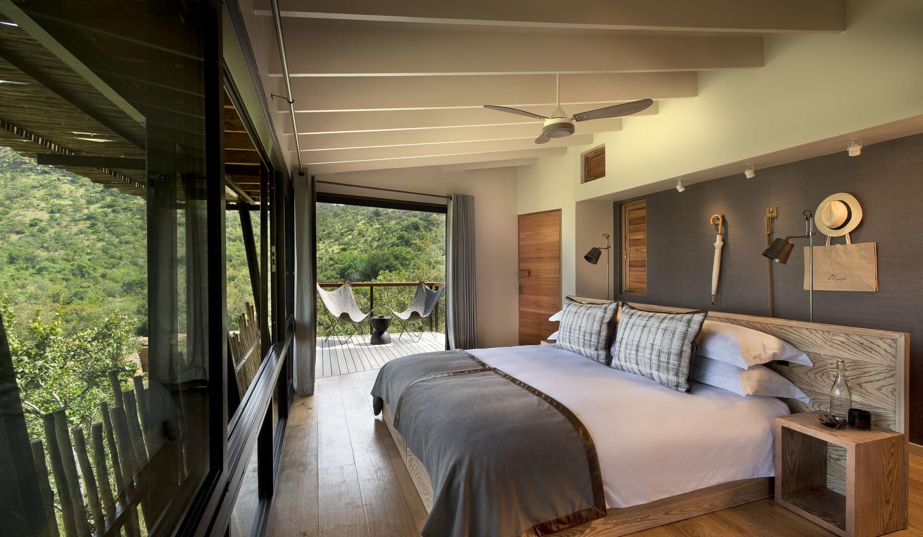 The five Luxury Rooms, each with a king-sized bed, personal mini bar, Nespresso machine, wood-burning fireplace, en-suite rain shower, and shaded viewing deck, provide a refined and simple space to take in the breathtaking views of the Waterfall Valley.