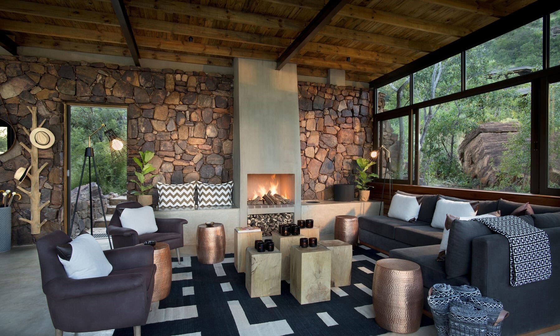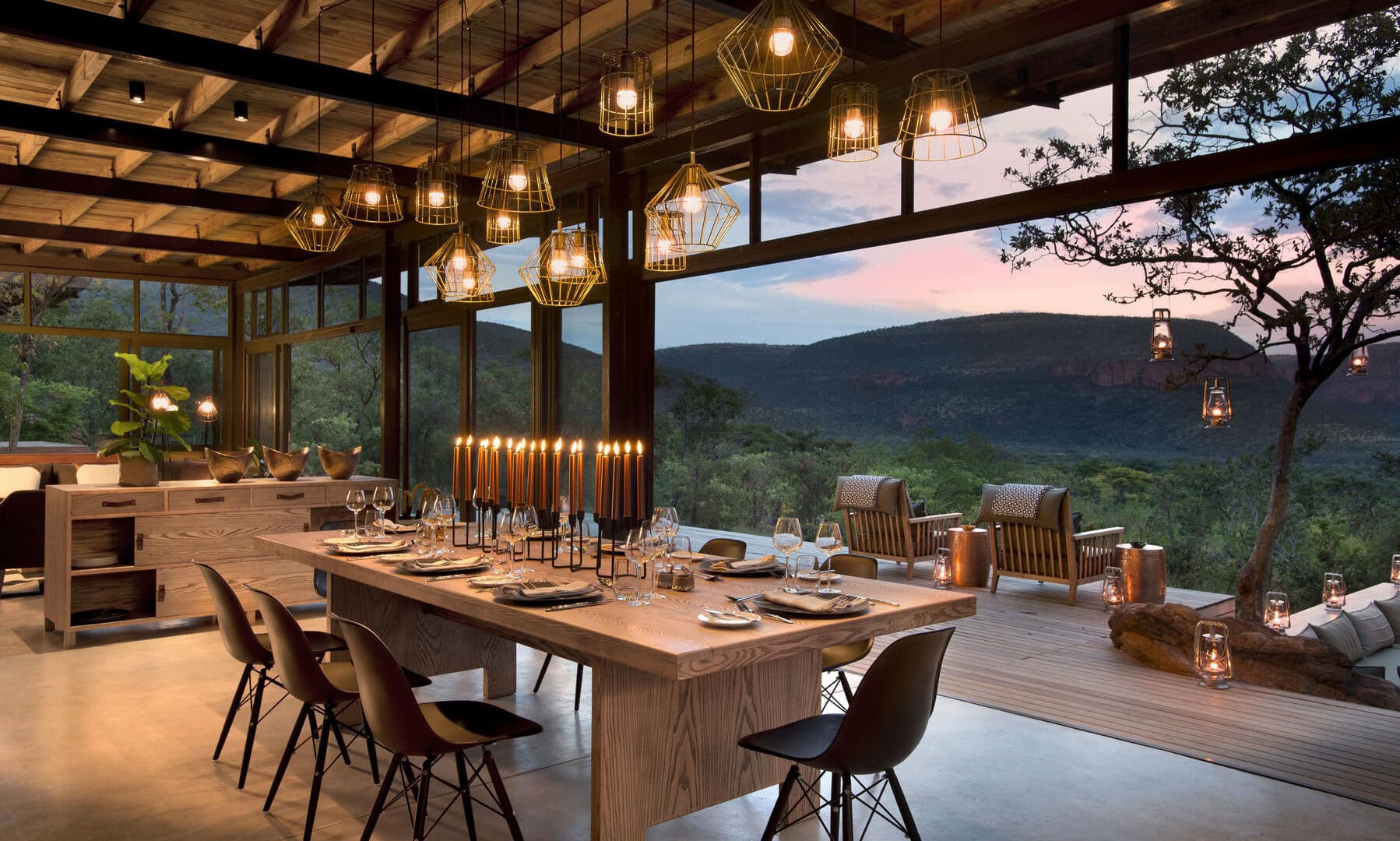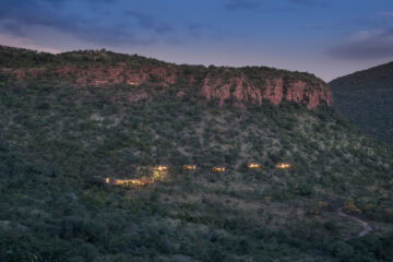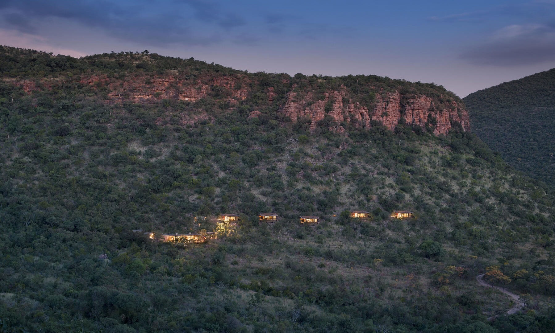 The lodge’s seclusion within the Waterberg Mountain range, solar-powered and eco-friendly design, and minimalist Scandi-style architecture seamlessly blend with the dramatic natural backdrop.