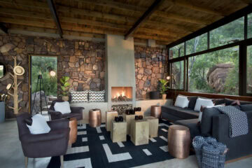 The lodge’s seclusion within the Waterberg Mountain range, solar-powered and eco-friendly design, and minimalist Scandi-style architecture seamlessly blend with the dramatic natural backdrop.