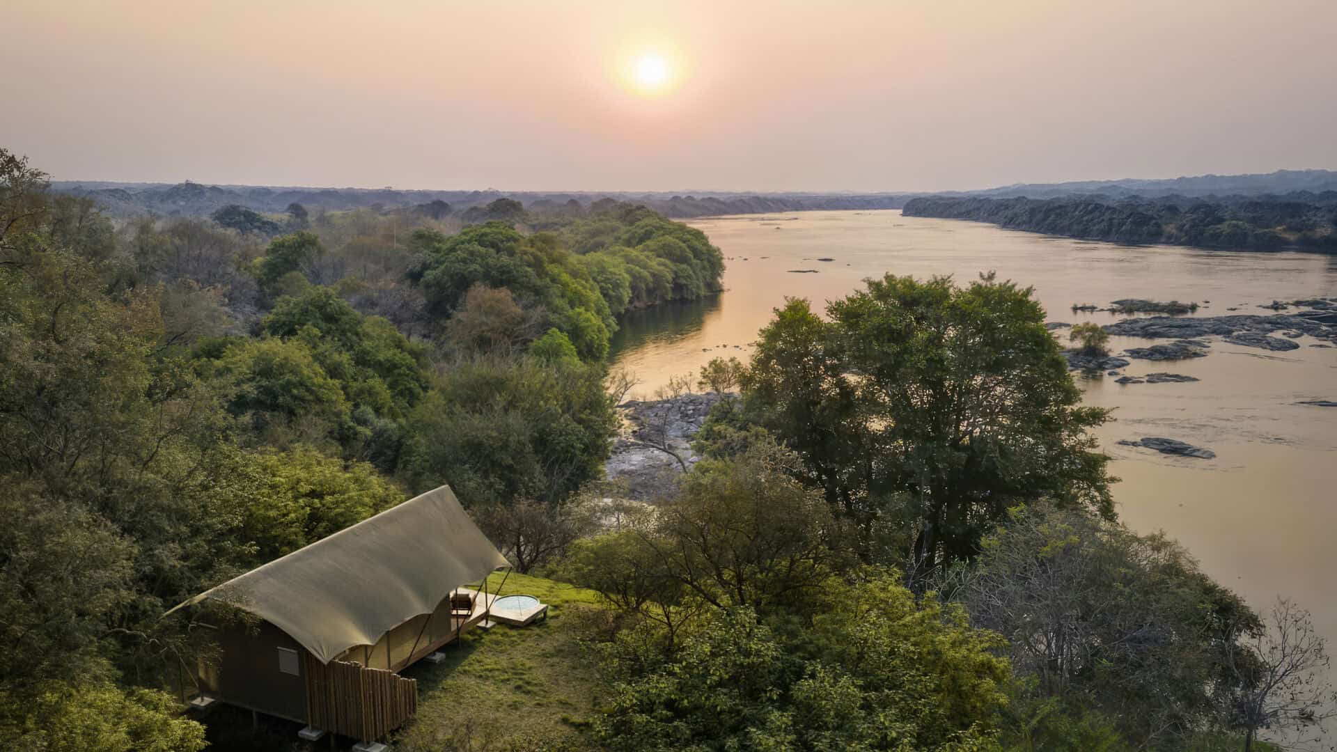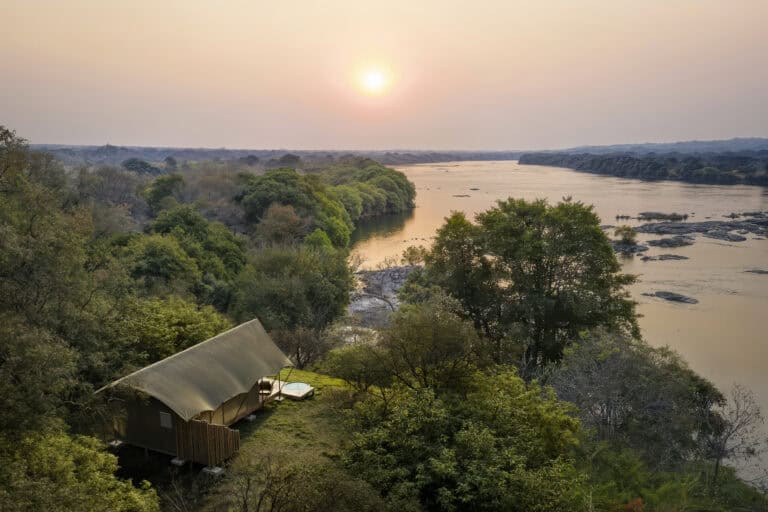 Opening in April 2026, MAWIMBI Bush Camp sits on the west banks of the Kafue River in Zambia’s Kafue National Park. Positioned between the flowing water and a lush natural wetland, this secluded camp provides a serene base for a remote Zambia safari.