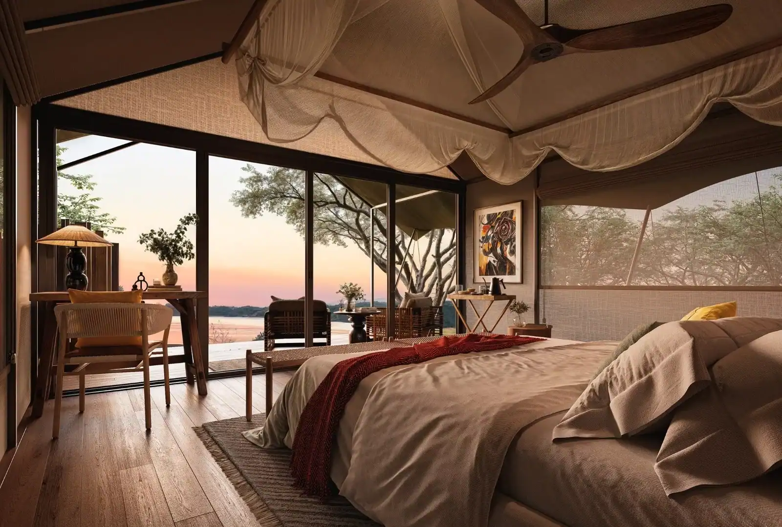 Opening in September 2025, Mawimbi Bush Camp is situated between the Kafue River and a dambo wetland, offering a secluded retreat in Kafue National Park. This camp features four river-view tented suites – which can be booked on an exclusive basis – offering a quiet and private safari experience.