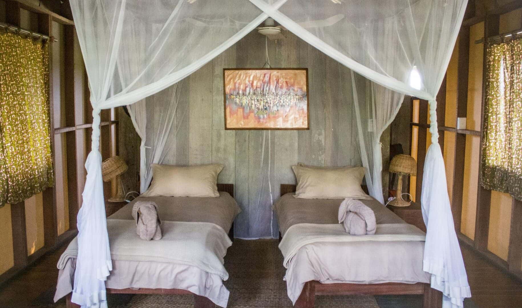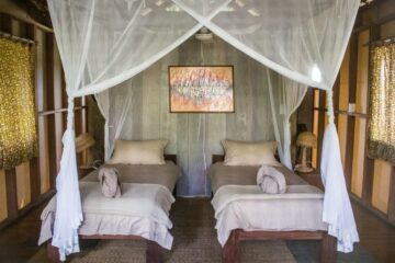 The Mboko camp accommodation consists of six spacious, canvas-sided bungalows tucked under the trees along a gentle brook. Designed for comfort and contemplation, each features works by local artisans and a private, screened-in porch or verandah, serenaded by the burbling water – a truly peaceful spot for reflection.