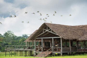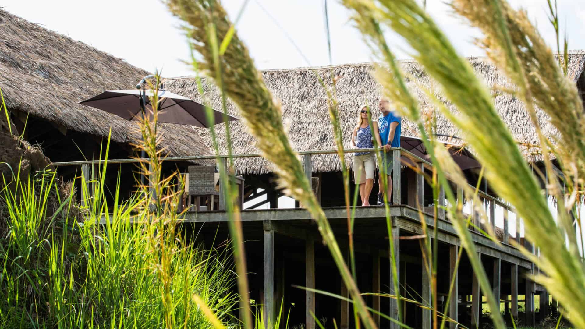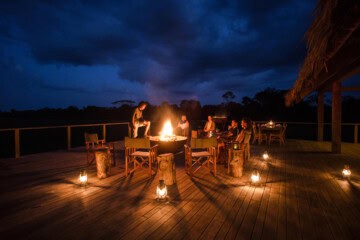 The heart of the lodge is a large, elevated pavilion with commanding views over the savannah, where you can enjoy exquisitely prepared cuisine around a stunning table carved from petrified wood. Mboko Lodge experiences focus on water and plains exploration: you can explore the nearby waterways by silent kayak or motor cruiser, or relax on the deck and take a refreshing dip in the gentle Lékéni River.