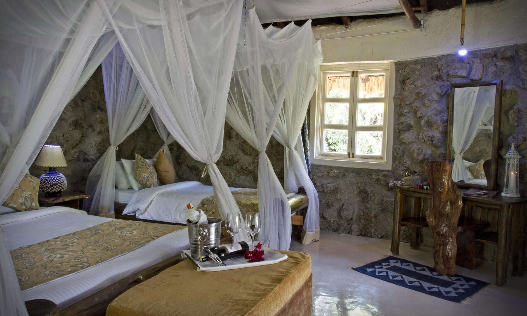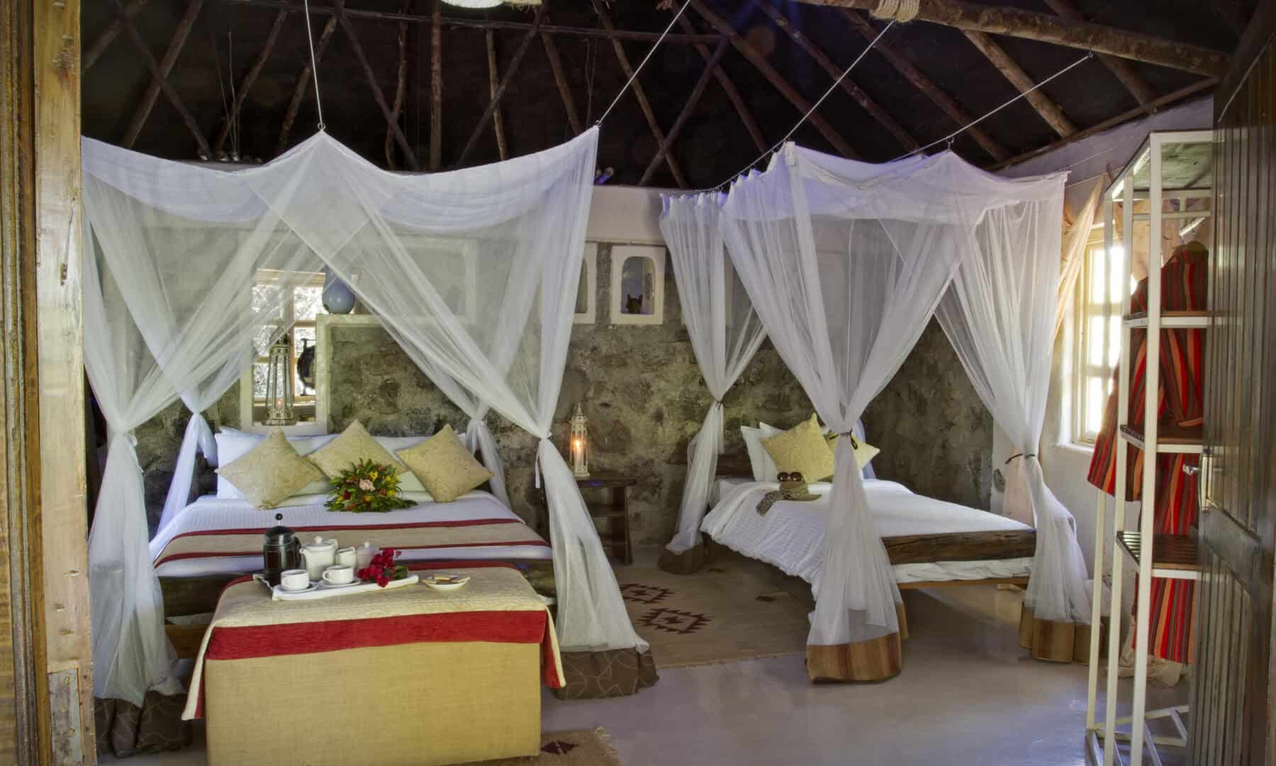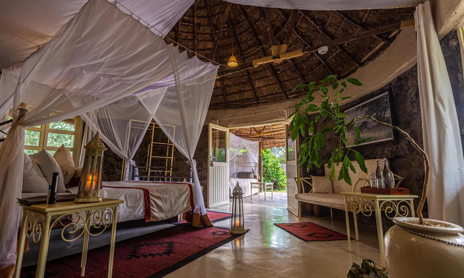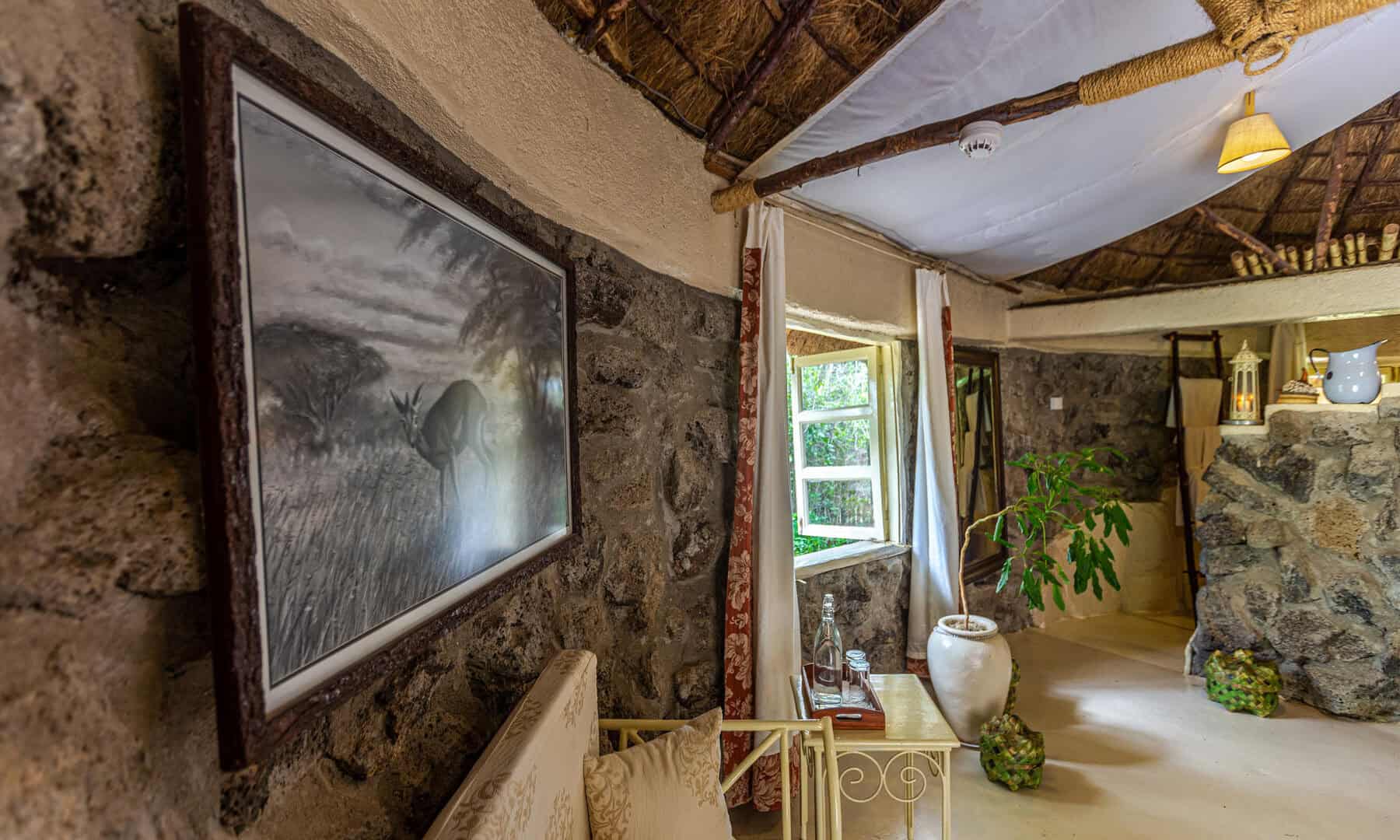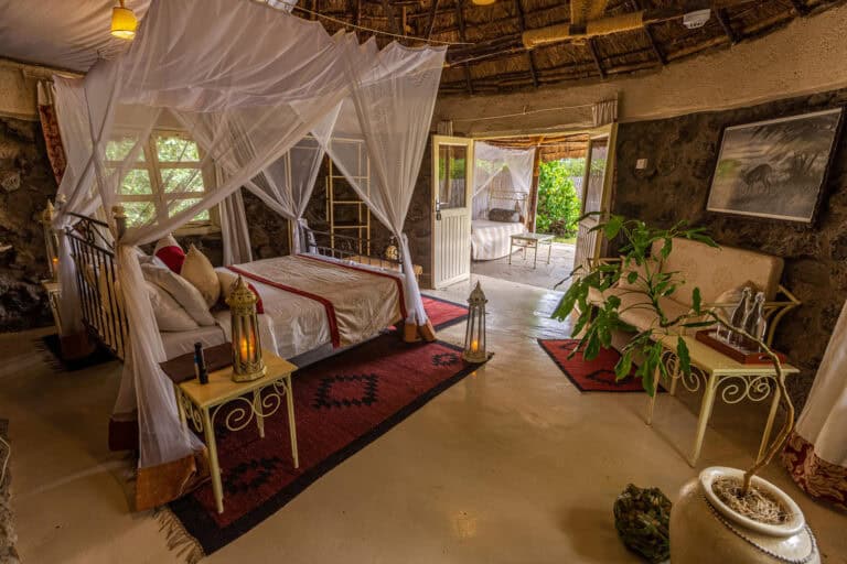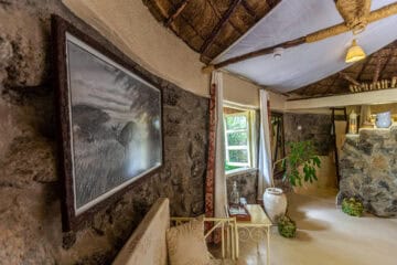 10 Rustic lava-stone cottages with thatched roofs are surrounded by euphorbia candelabra, yellow barked acacia and other indigenous trees. Mbweha Camp is only a few hours from Nairobi, yet feels right away from it all with its relaxed atmosphere. Being situated outside a National Park allows many activities, including walking, mountain biking and night game drives. Guests can also enjoy day trips into Nakuru National Park with the option of a gourmet bush lunch with spectacular views of the Lake and the National Park.