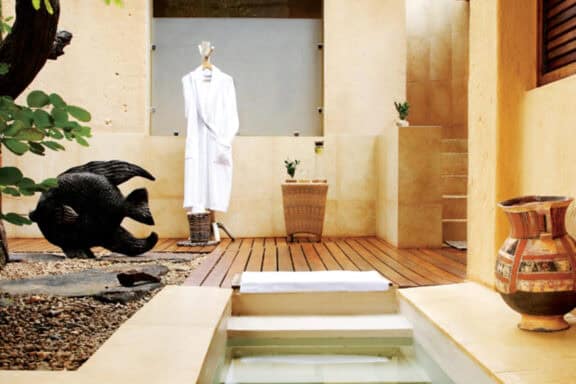 Wooden decks lead out from the suites to private swimming pools and outdoor shower. Each suite has an outdoor lounge area, with ceiling fan and luxurious daybed.