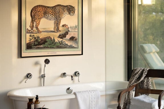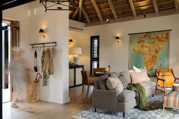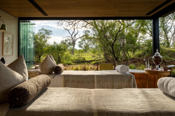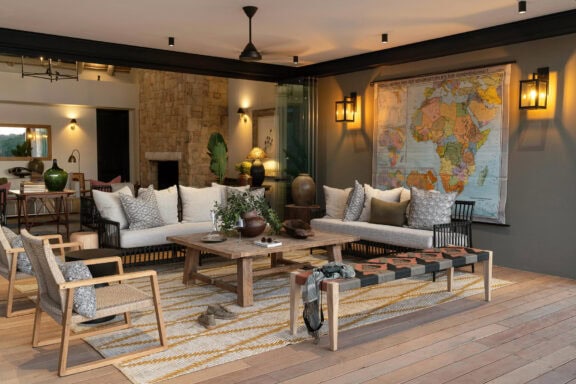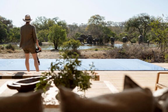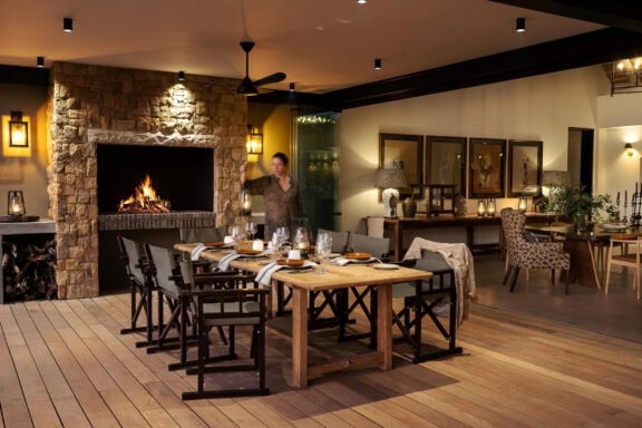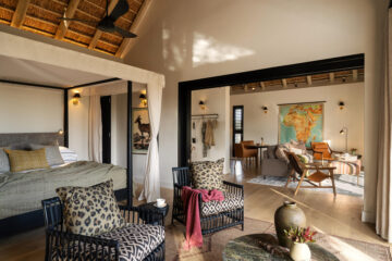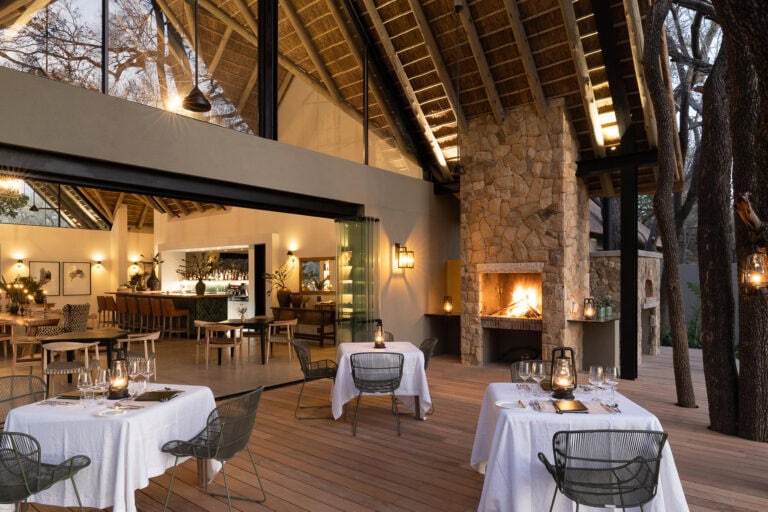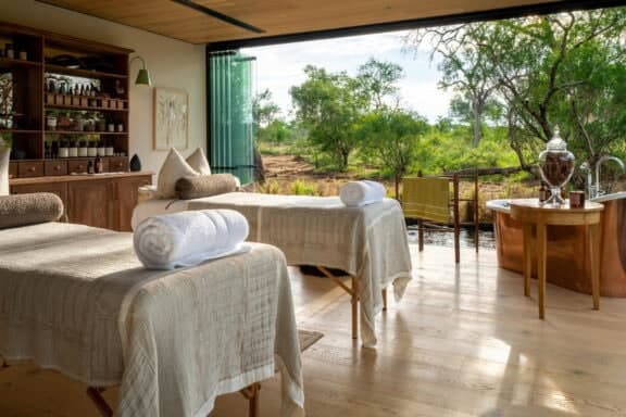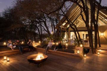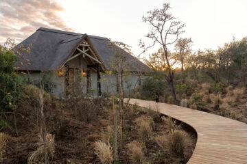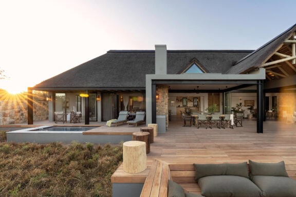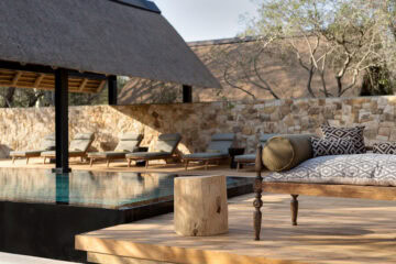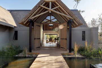 The lodge’s facilities include a lounge, bar, wine cellar, wraparound wooden deck, pool area, gym, spa, and safari boutique.
