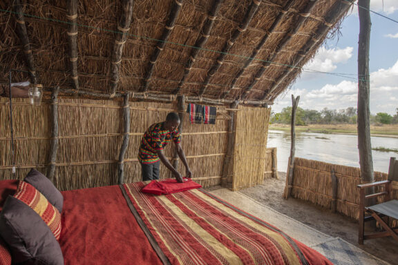 The camp provides a genuine sense of solitude and seclusion, with only four thatched chalets rebuilt annually from natural materials, en suite bathrooms open to the stars, and uninterrupted views of the spectacular Mwaleshi River. Life in camp is relaxing yet refreshingly simple.