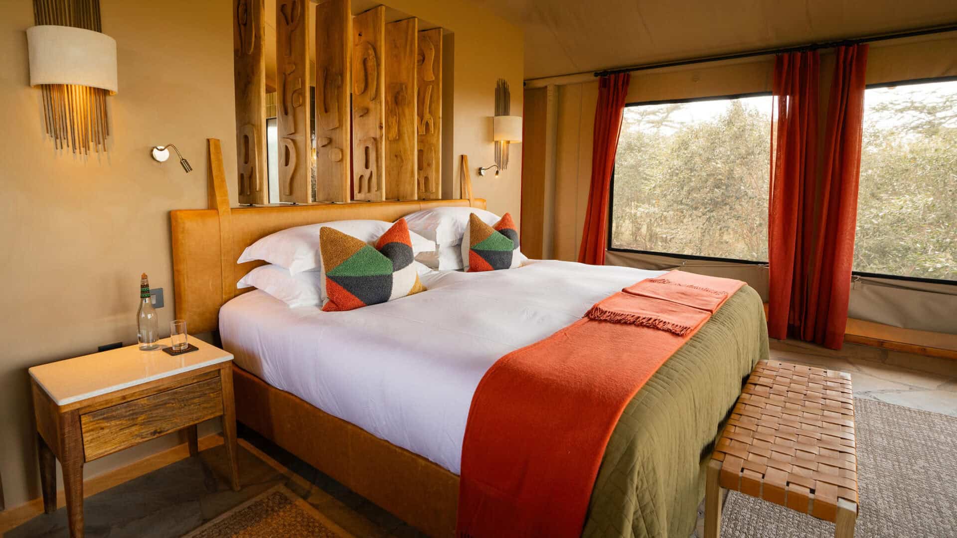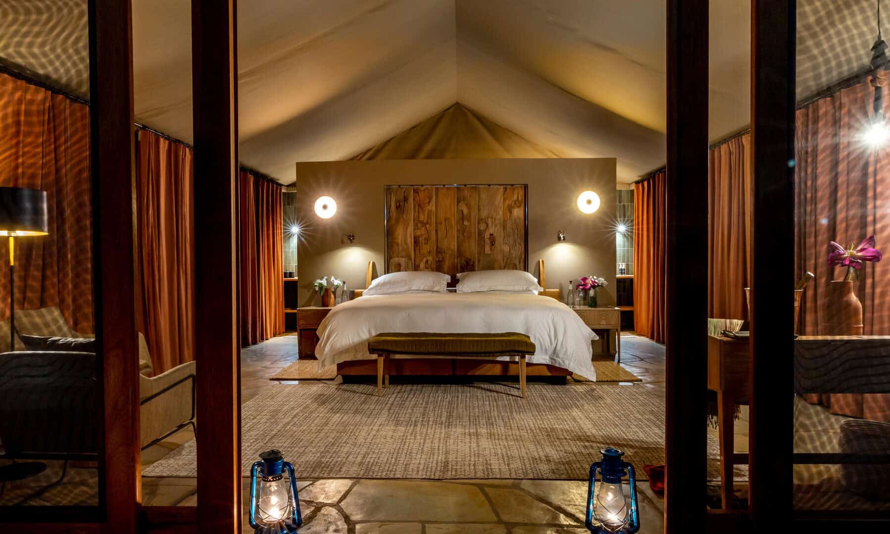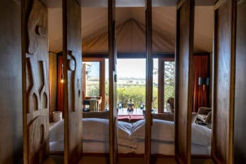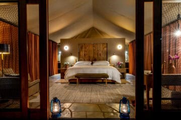 The camp’s nine spacious tented suites create an intimate safari experience, blending comfort with immersion in the bush. Each tent feels open and airy, with private verandas that allow you to take in the sounds and sights of the surrounding wilderness. Facilities include a central lounge, a dining area, and a small swimming pool, providing moments of relaxation between safaris. Guided game drives, walking safaris, and night drives offer different ways to encounter wildlife.