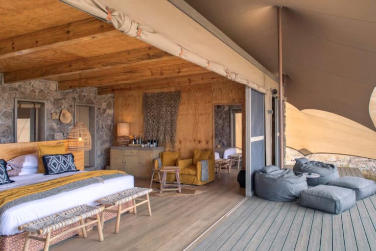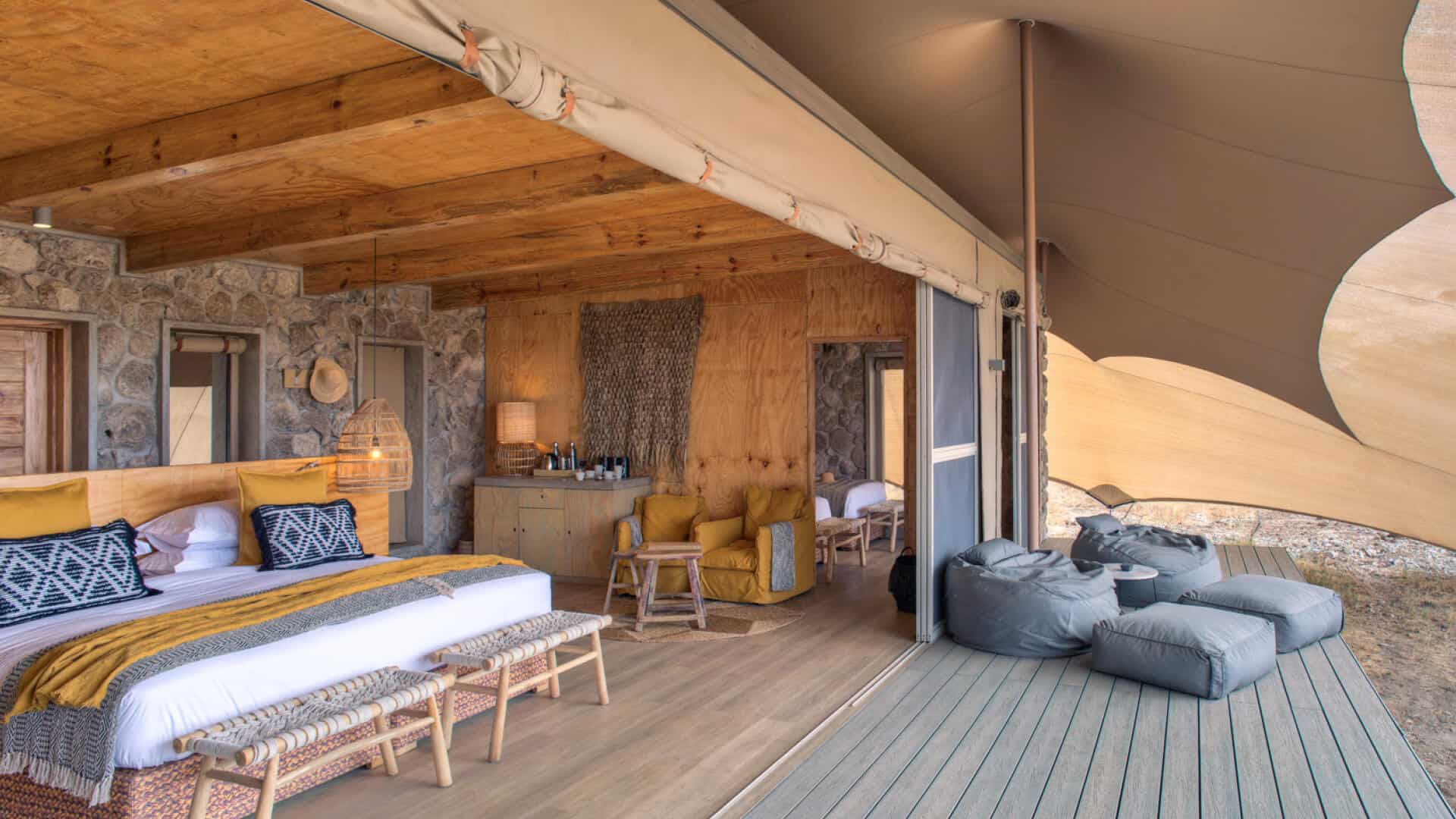 Each suite blends canvas and stone, with en-suite bathrooms, indoor and outdoor showers, private verandas, and large viewing windows. The tents are spaced well apart for privacy and furnished with natural materials and soothing tones. Solar power, generator backup, and thoughtful eco-design help maintain comfort in this remote setting.
