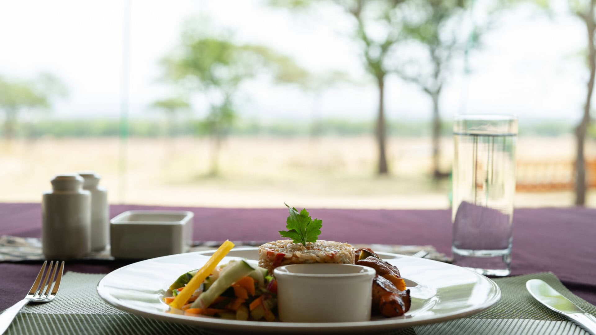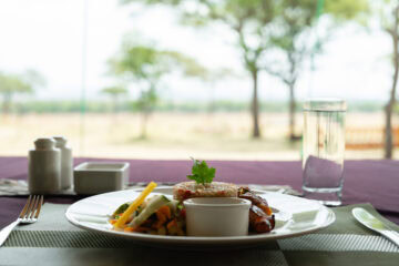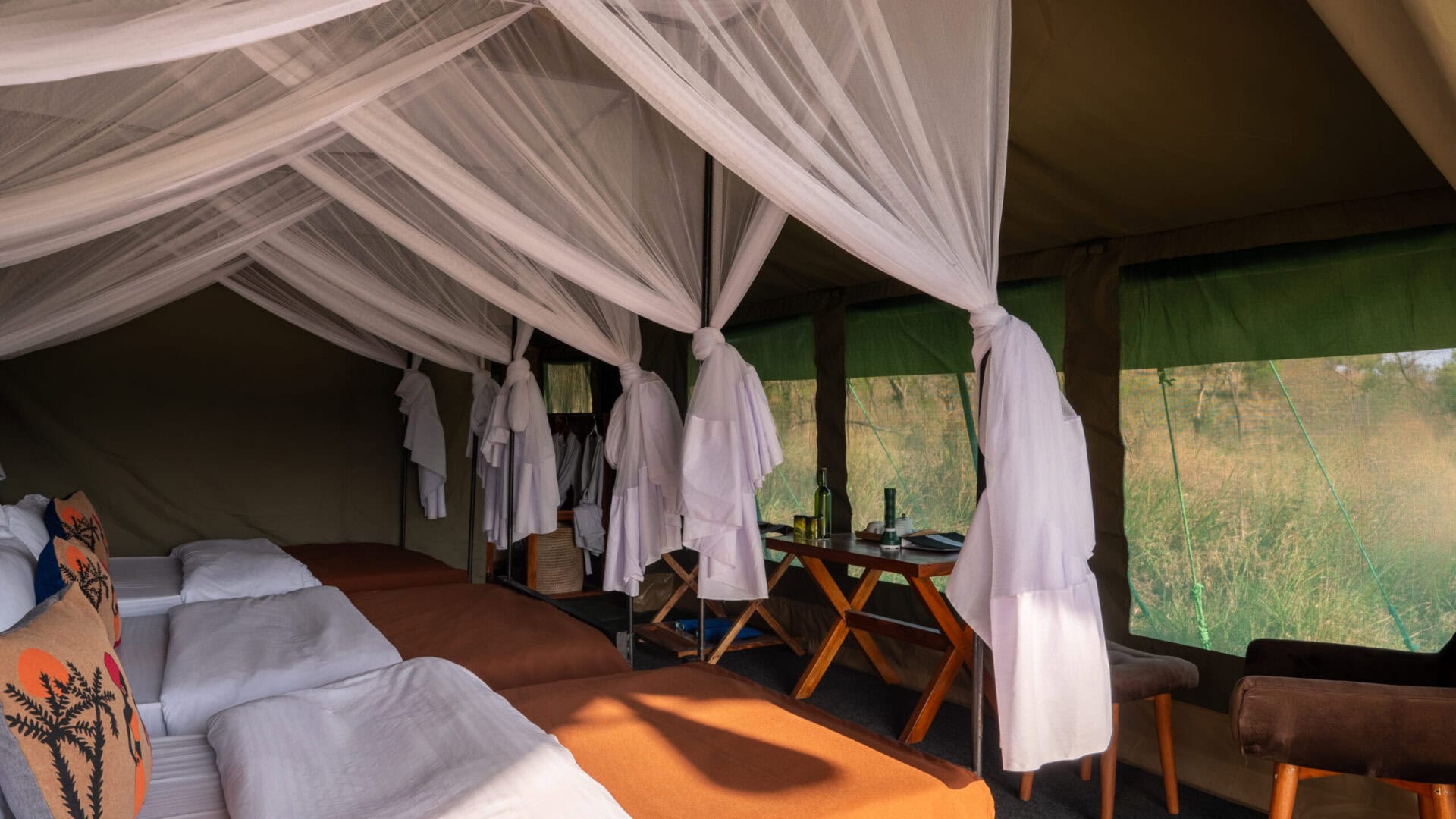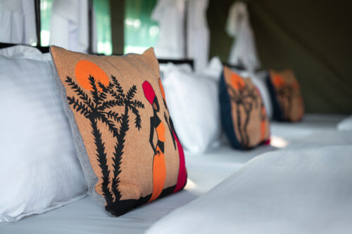 Each tent is made from heavy-duty safari rip-stop canvas with shade clothing for cooling. A private patio with chairs and a table offers a relaxing space. Inside you will find handcrafted furniture, a tea station, comfortable netted beds, and an ensuite bathroom with bucket shower.