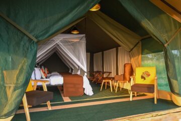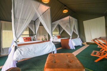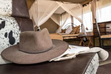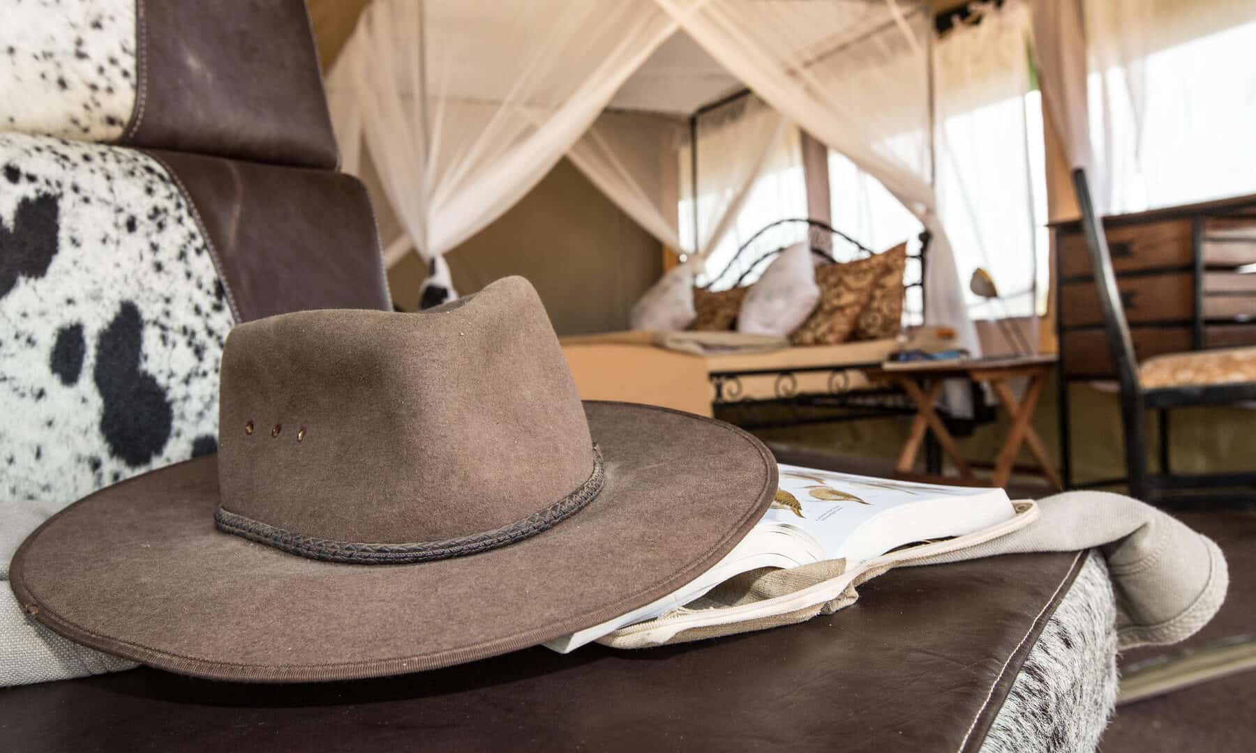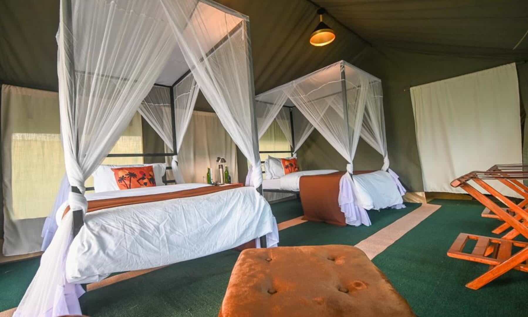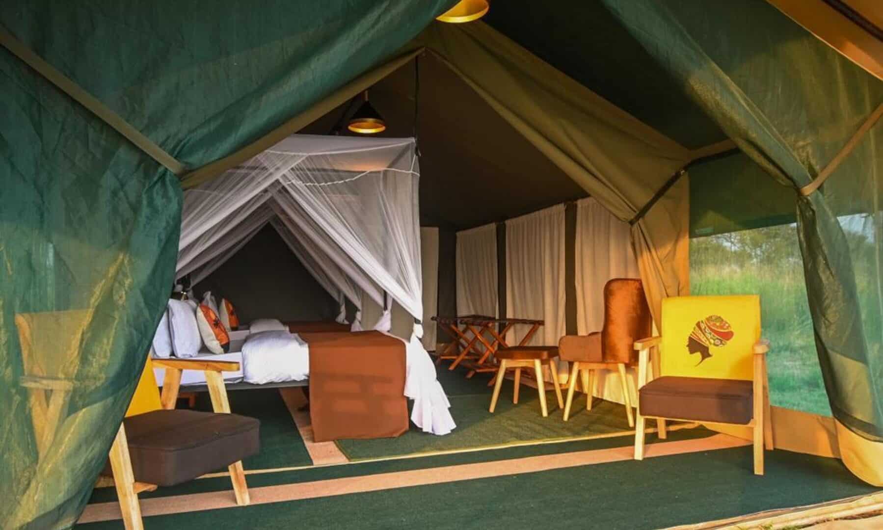 The camp consists of 11 mobile tents, designed to maintain an intimate and exclusive safari experience while remaining responsible tourism principles. Each tent features handmade furniture, including an armchair and footrest, a coffee station, and beds arranged according to guest needs. The beds are fully netted for mosquito and insect protection and furnished with white cotton sheets and double pillows.