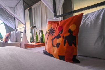 The camp consists of 11 mobile tents, designed to maintain an intimate and exclusive safari experience while remaining responsible tourism principles. Each tent features handmade furniture, including an armchair and footrest, a coffee station, and beds arranged according to guest needs. The beds are fully netted for mosquito and insect protection and furnished with white cotton sheets and double pillows.