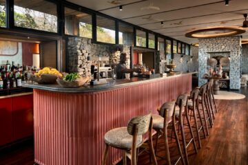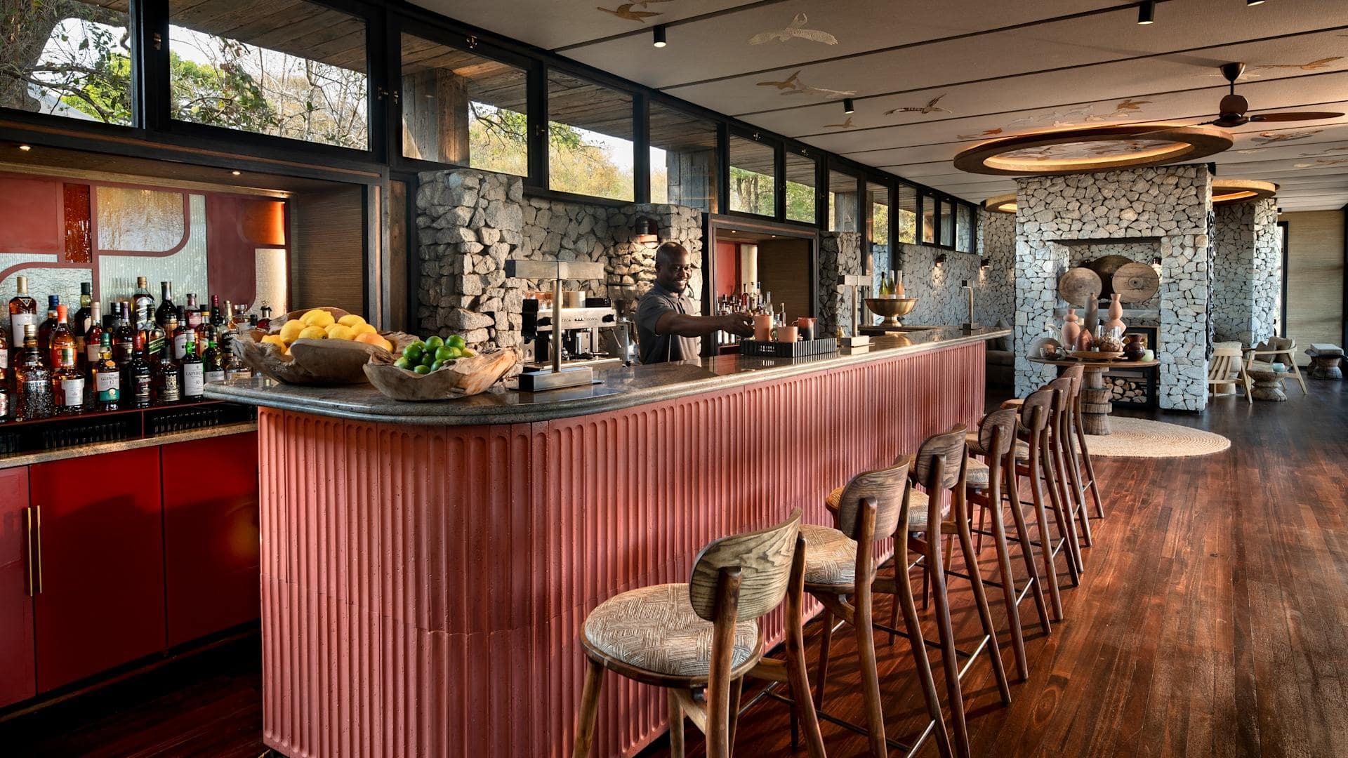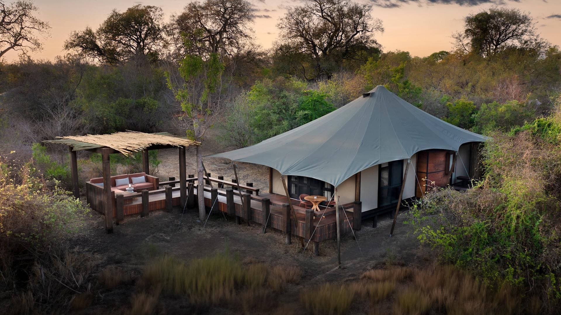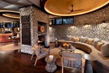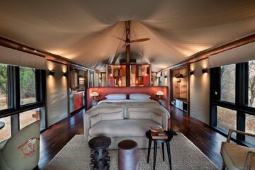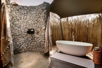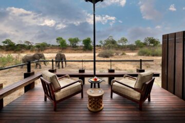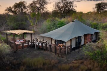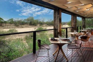 The stylish guest areas overlook the seasonal Timbavati River, providing a tranquil space for relaxation. Interiors combine Shangaan-inspired mid-century design with regional textiles, set against granite stone and canvas. Expansive decks offer dining options with views of the riverbed.