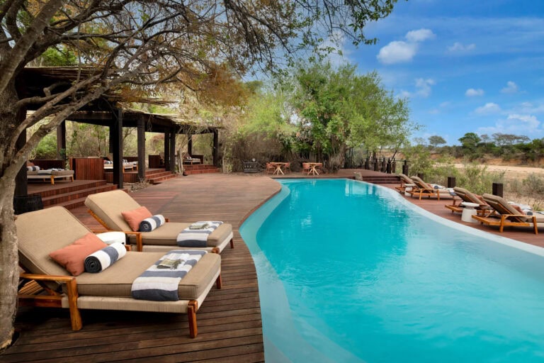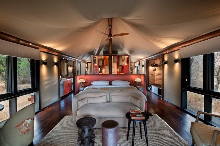 A deck with stunning views surrounds the camp’s rim-flow pool. Secluded salas offer poolside lounging and casual dining, while a dedicated massage sala and gym cater to wellness needs. andBeyond Ngala Tented Camp is an intimate retreat, welcoming children over 12 years old for a peaceful, luxurious escape.