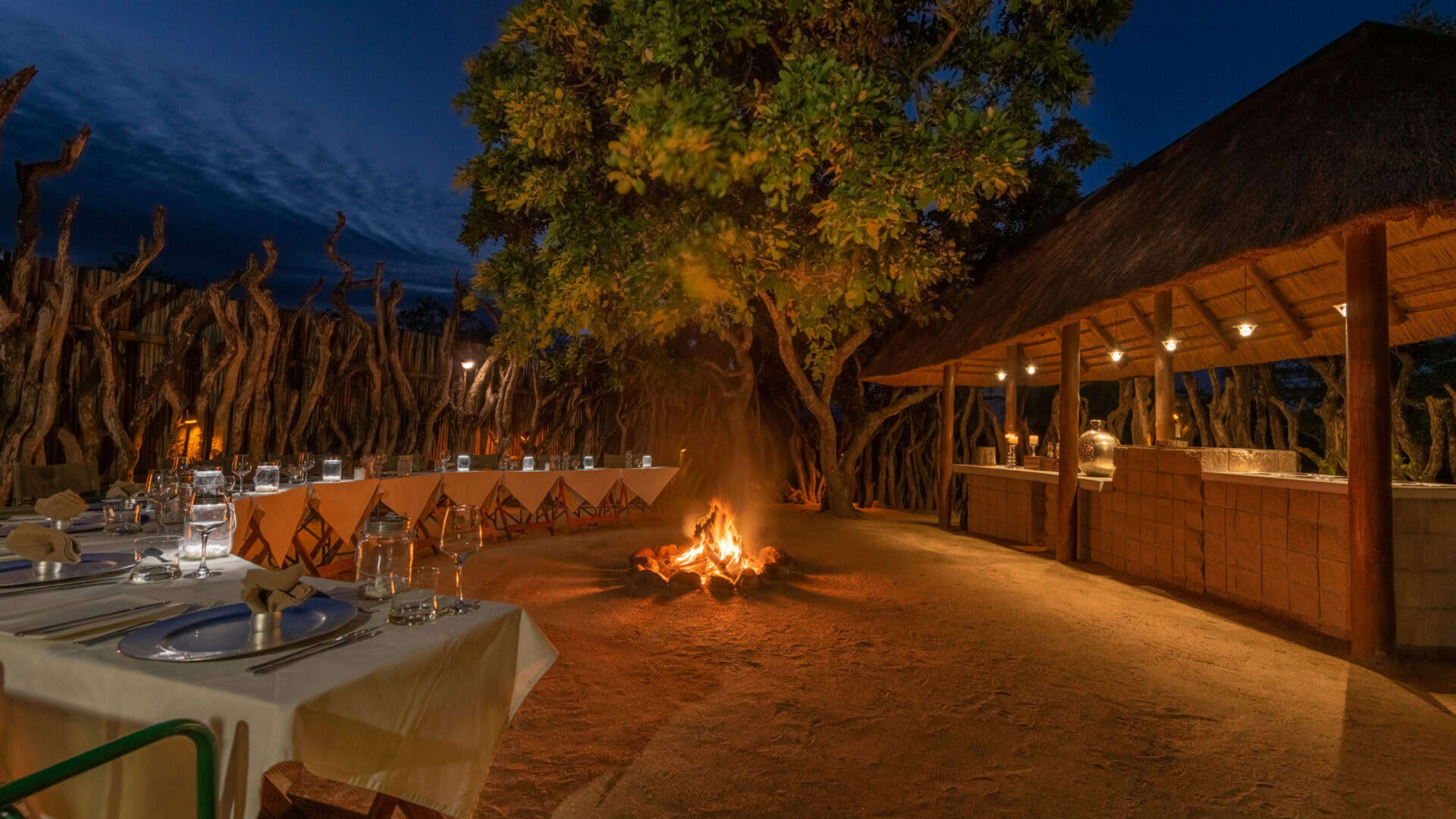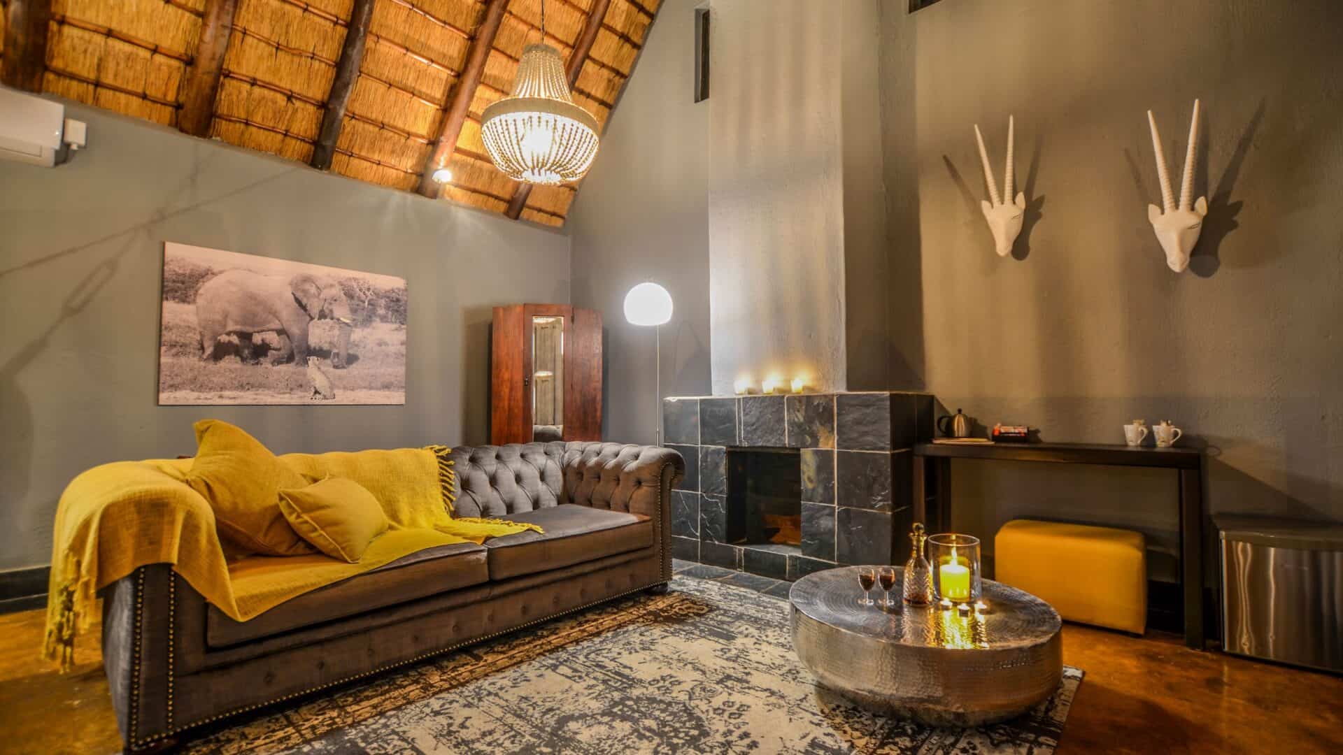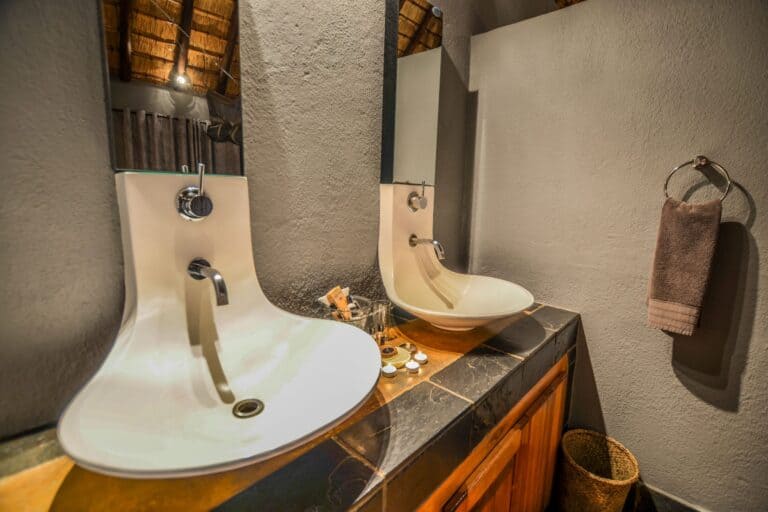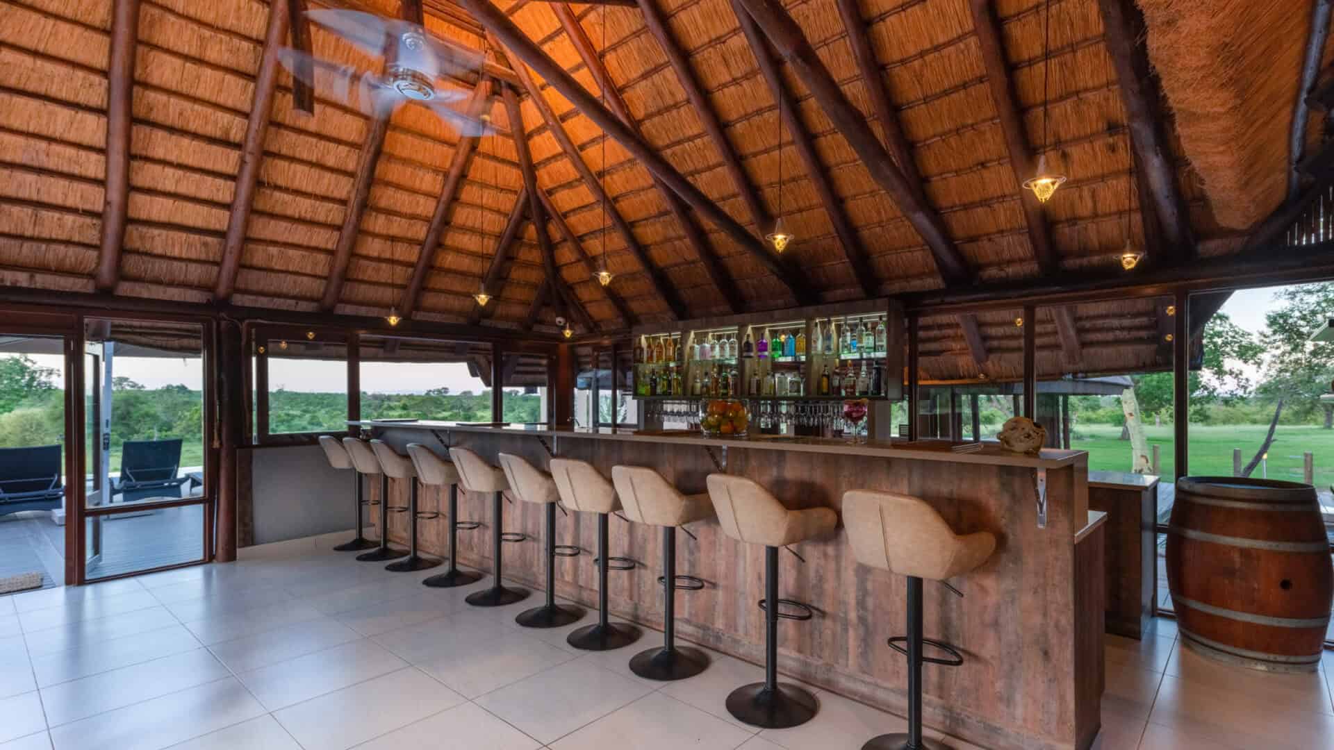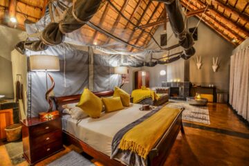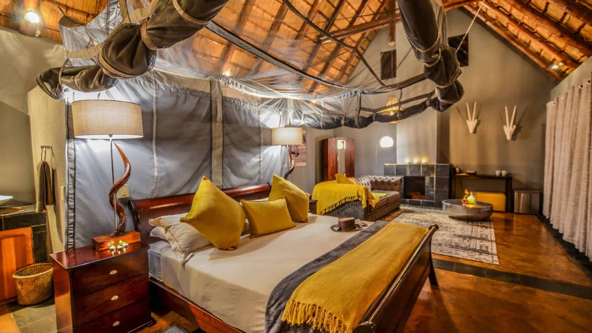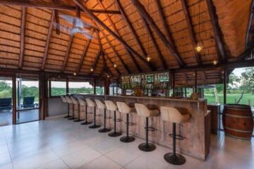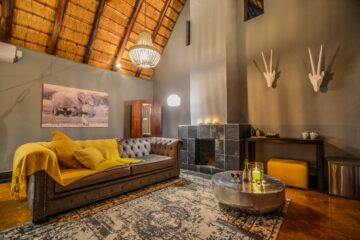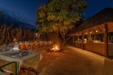 Dining is a central part of the experience, with hearty breakfasts served on the deck and traditional dinners enjoyed around a crackling fire in the leadwood boma. The lodge also features a cosy lounge and bar area, as well as a curio shop.