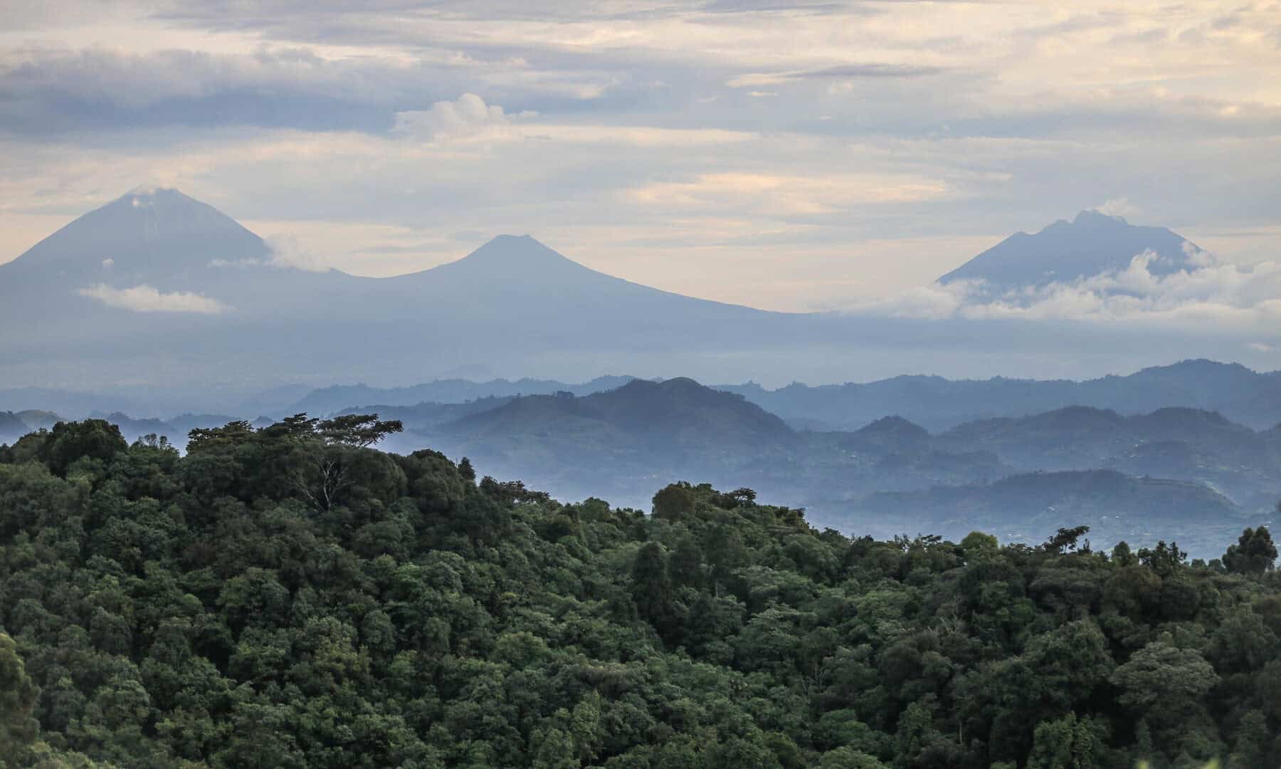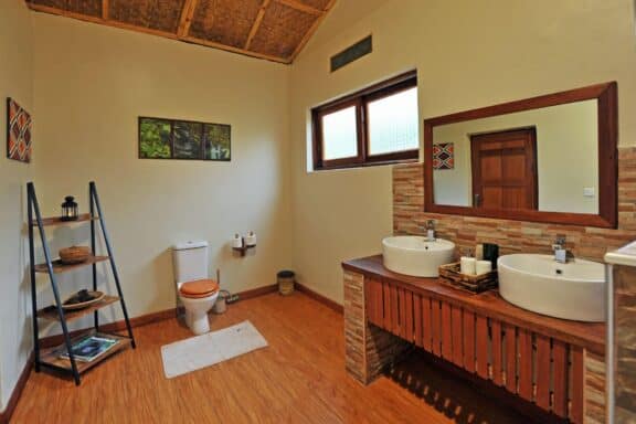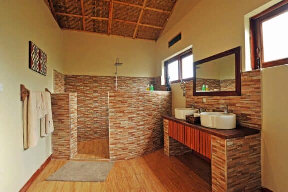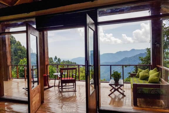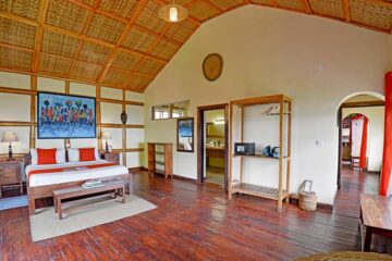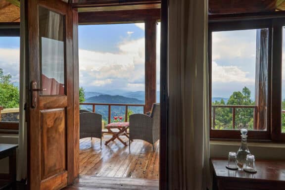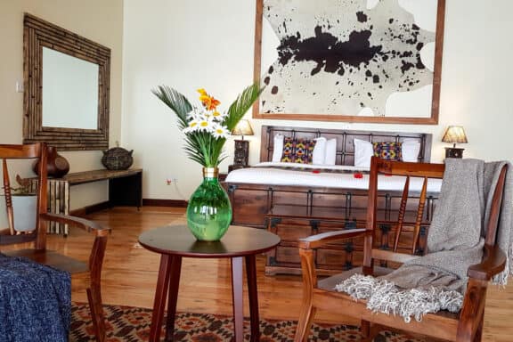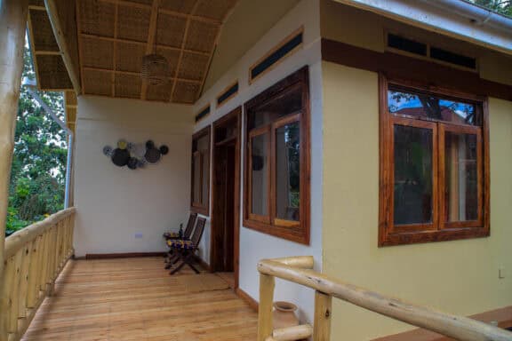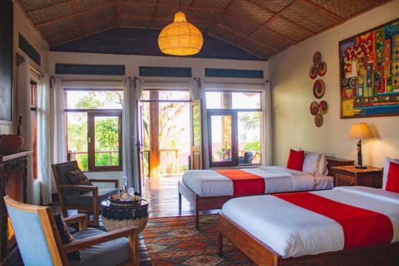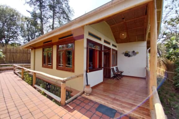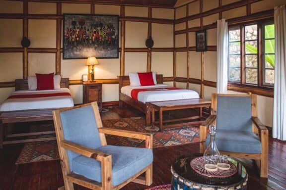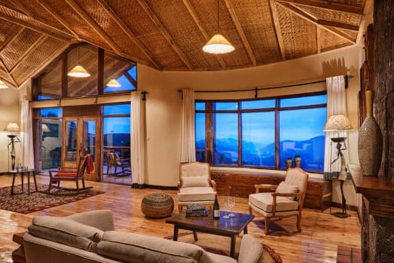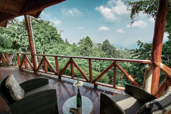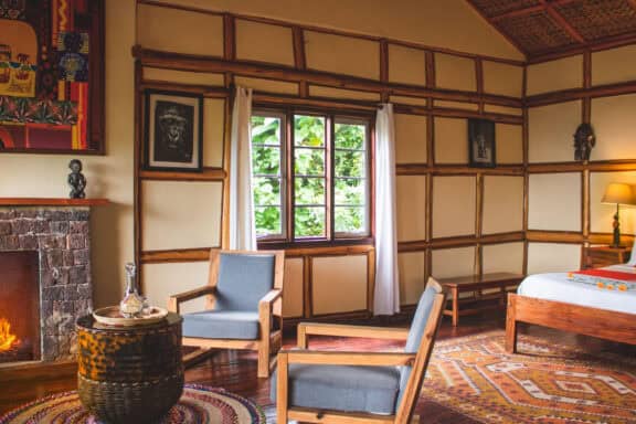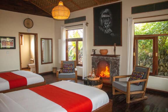 Locally styled furnishings grace the spacious rooms, and light fills the space from private viewing decks over the forest swath and beyond the entire Virunga Volcanoes chain.