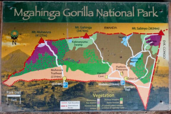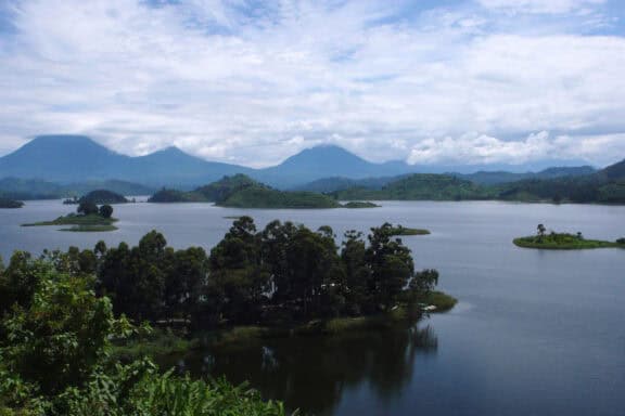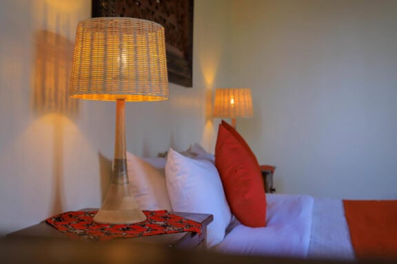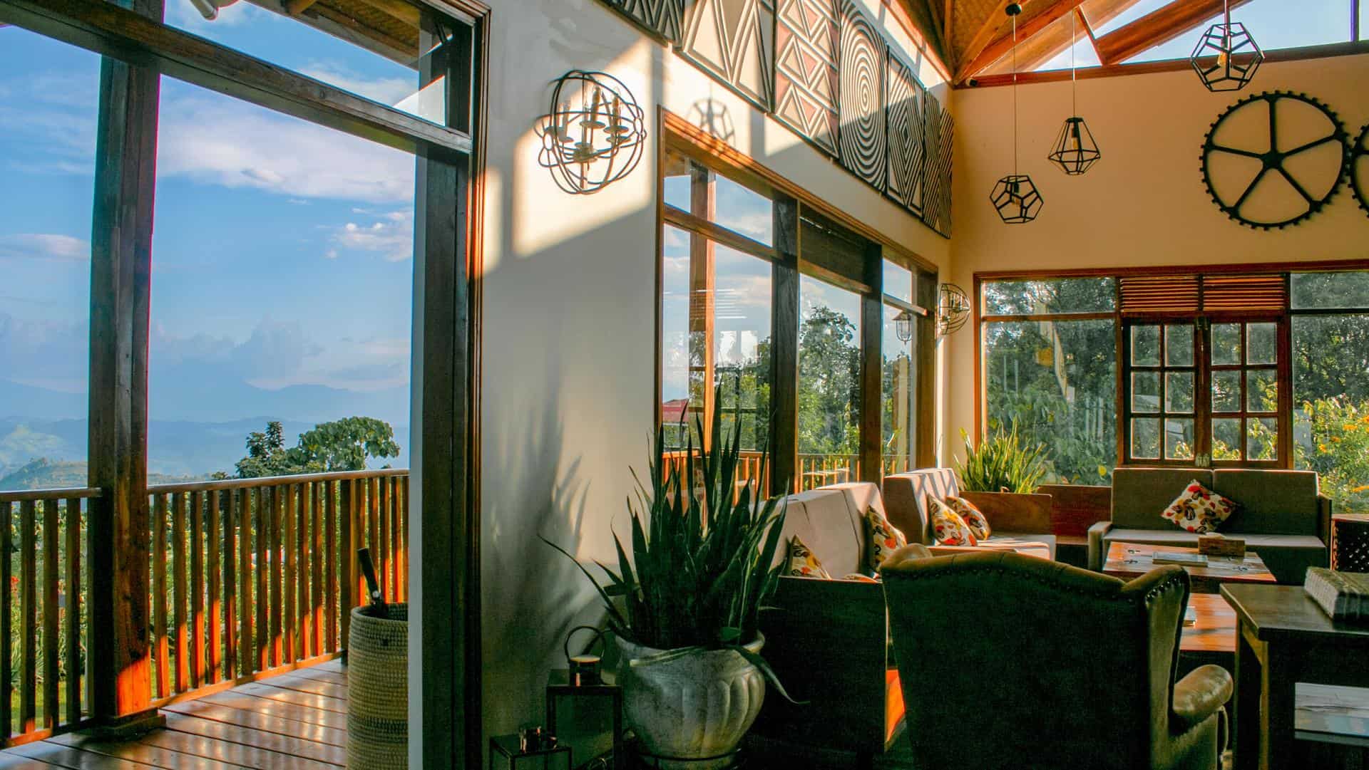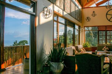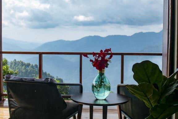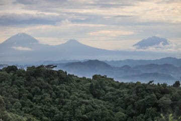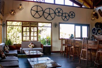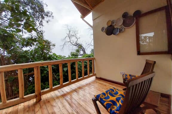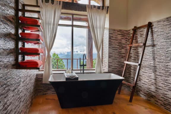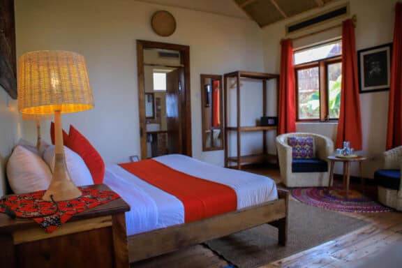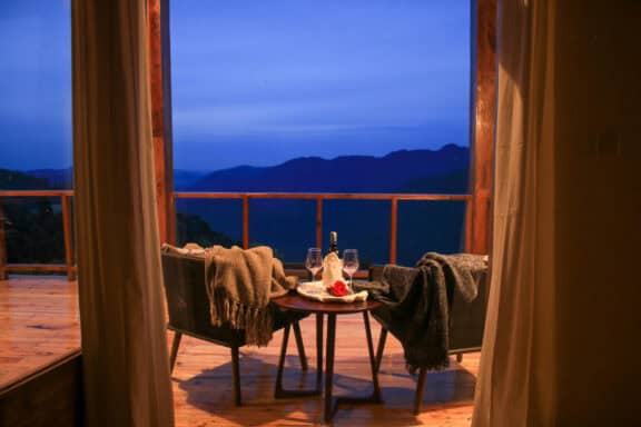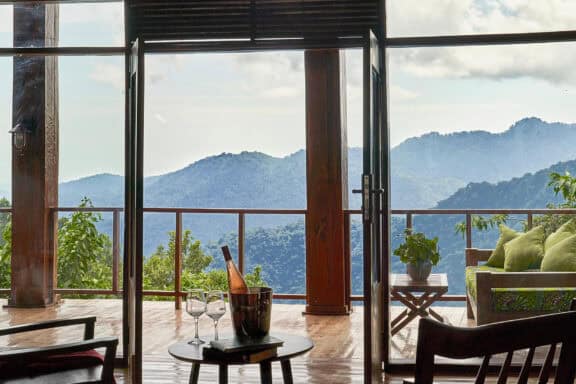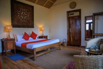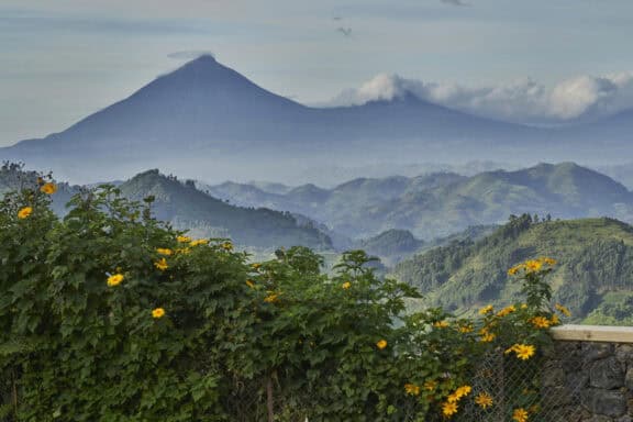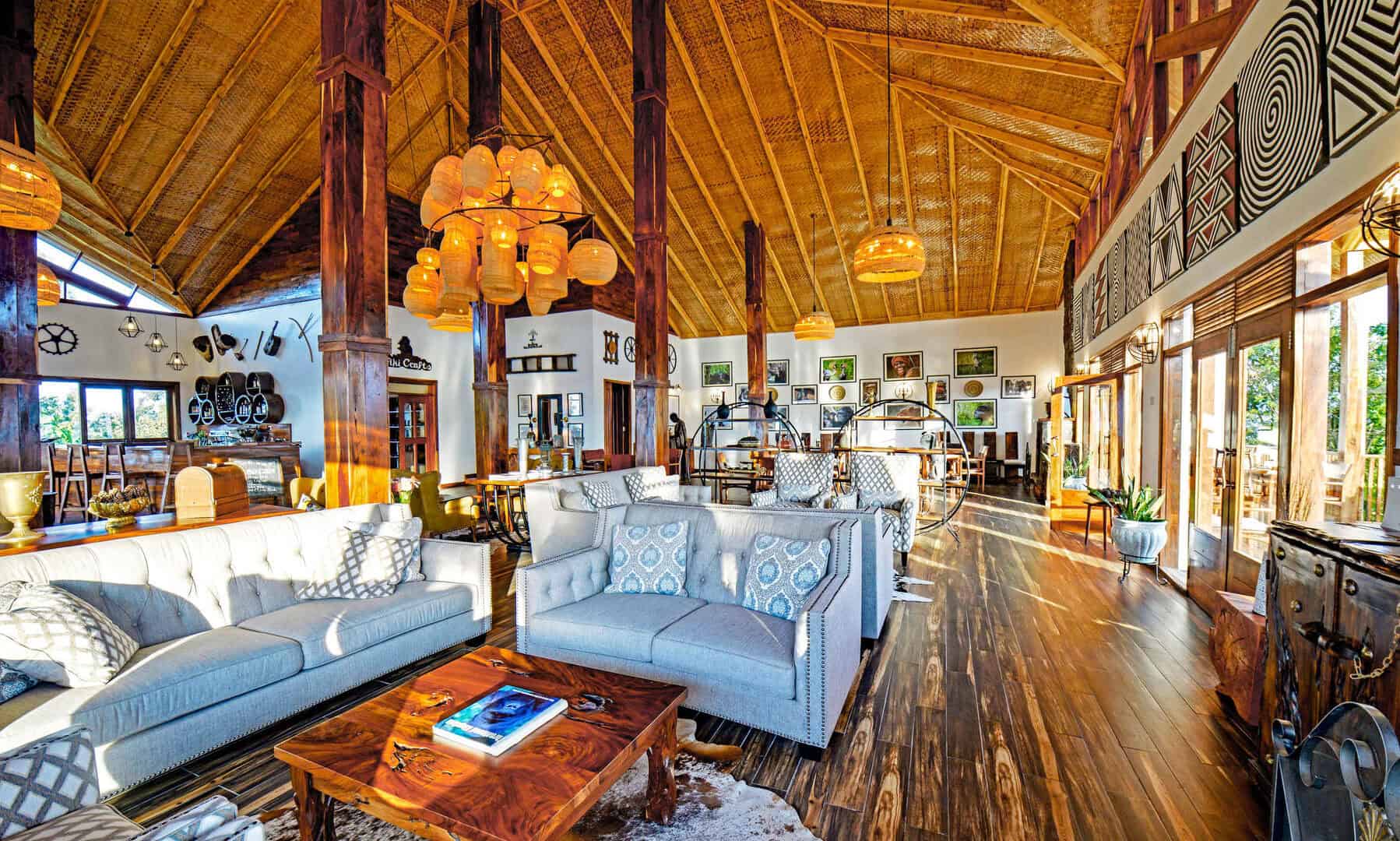 Locally styled furnishings grace the spacious rooms, and light fills the space from private viewing decks over the forest swath and beyond the entire Virunga Volcanoes chain.