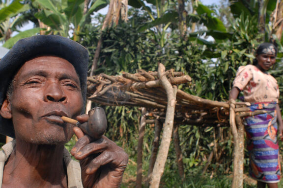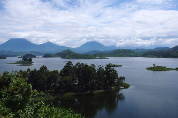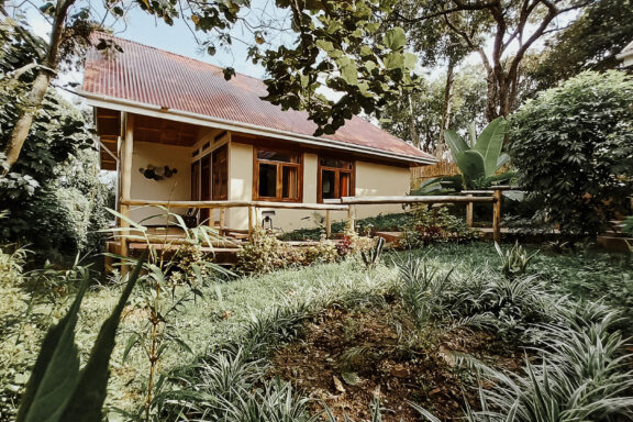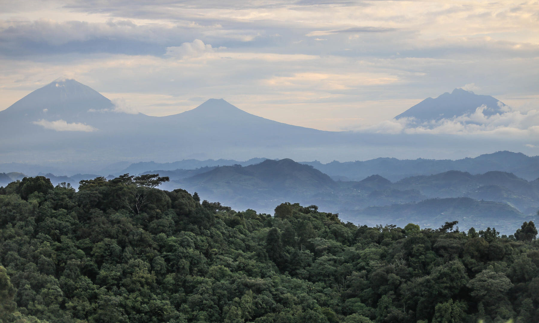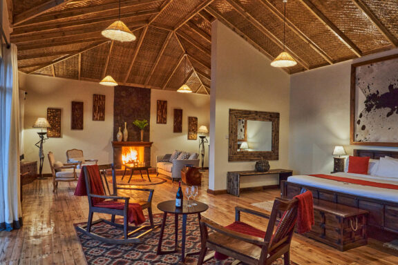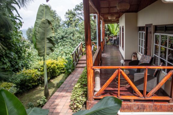 Locally styled furnishings grace the spacious rooms, and light fills the space from private viewing decks over the forest swath and beyond the entire Virunga Volcanoes chain.