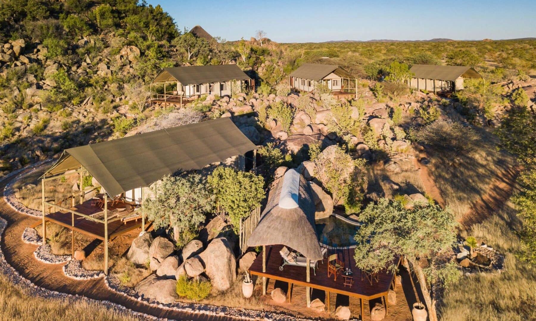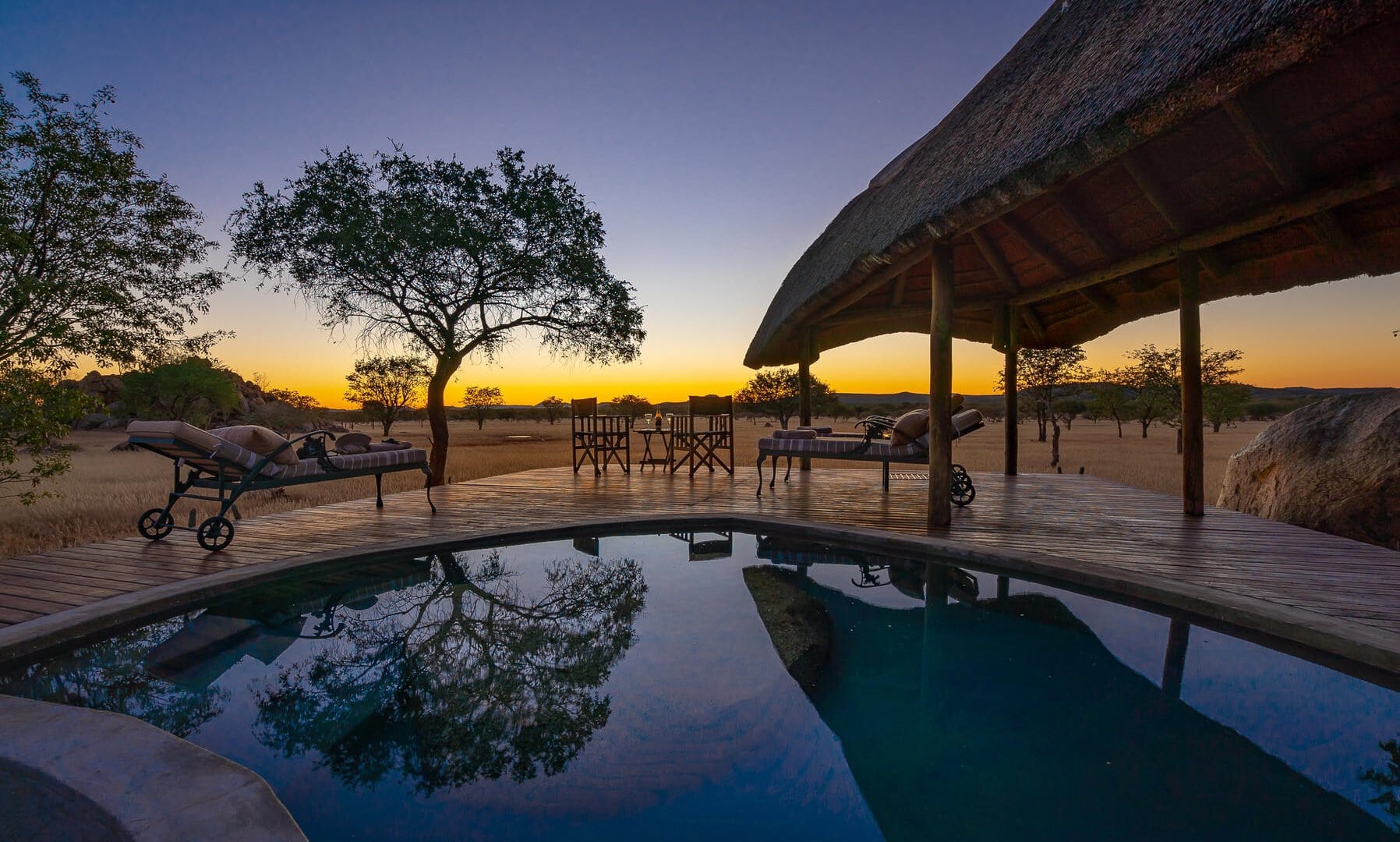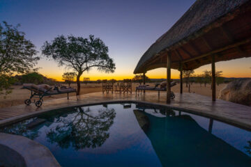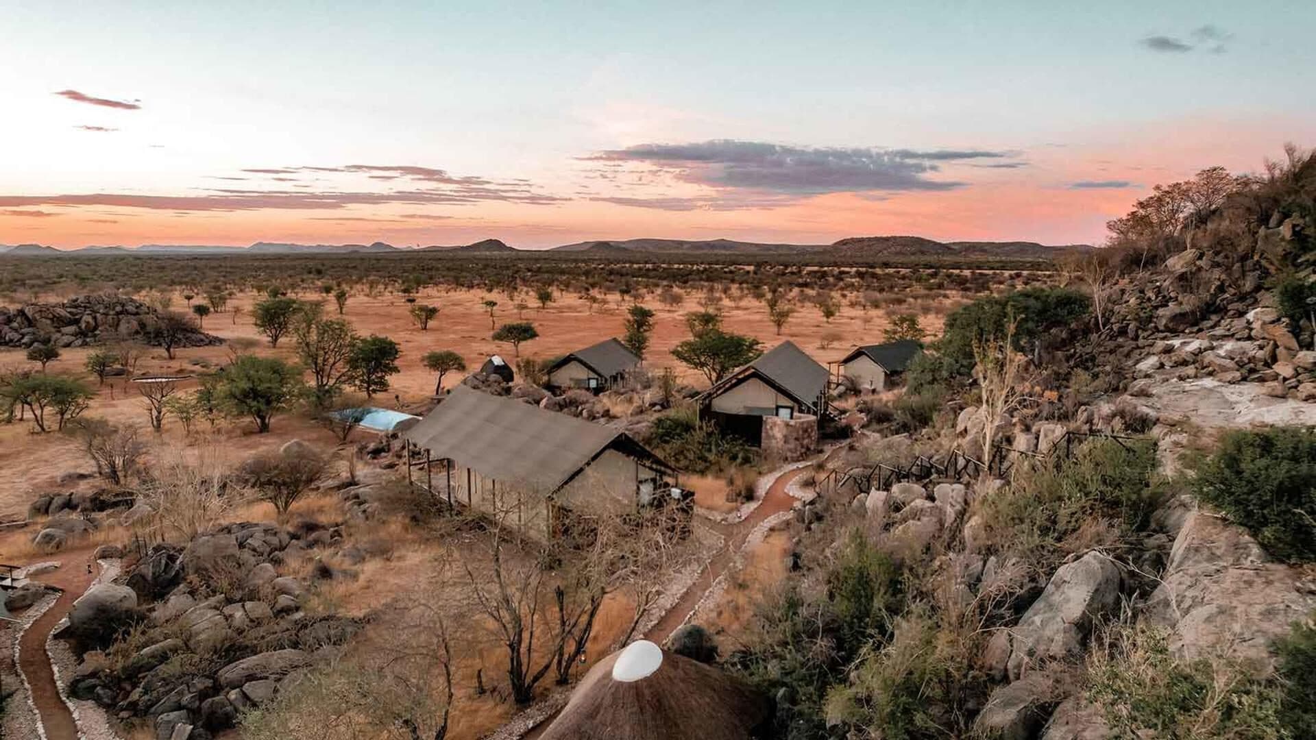 Designed and created to get guests as close to nature as they can get, the Ohorongo Tented Camp is intimate and tranquil. The wooden decks and thatched roofs reflect its authentic Namibian spirit, and the sustainable construction materials blend gracefully with the landscape’s granite monoliths. There is a swimming pool.