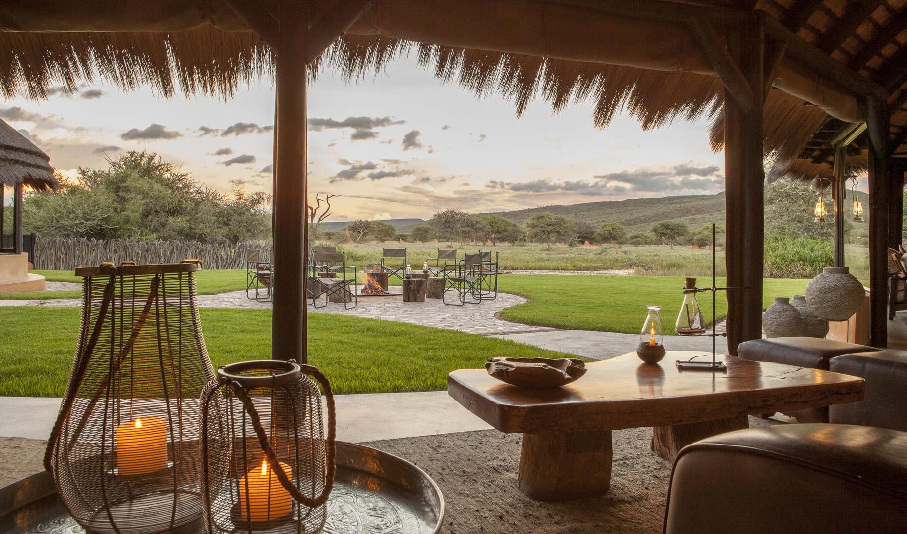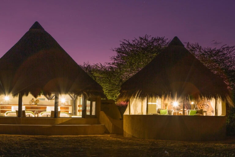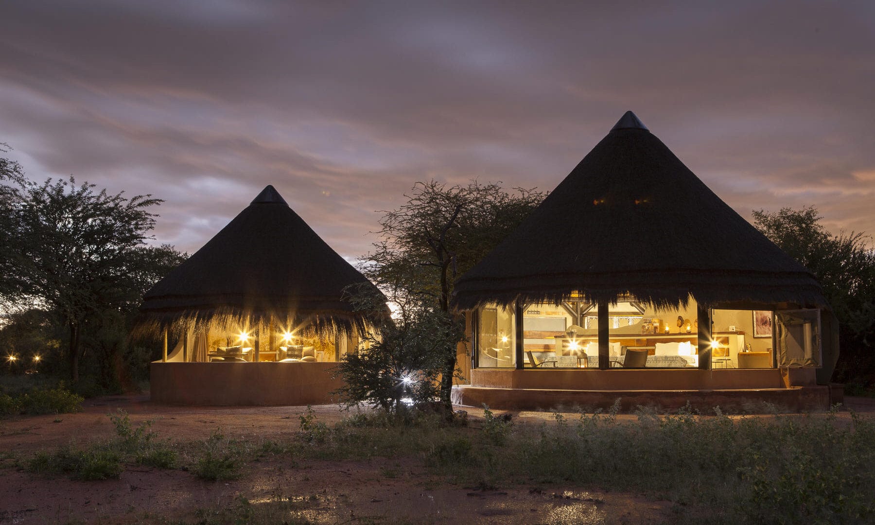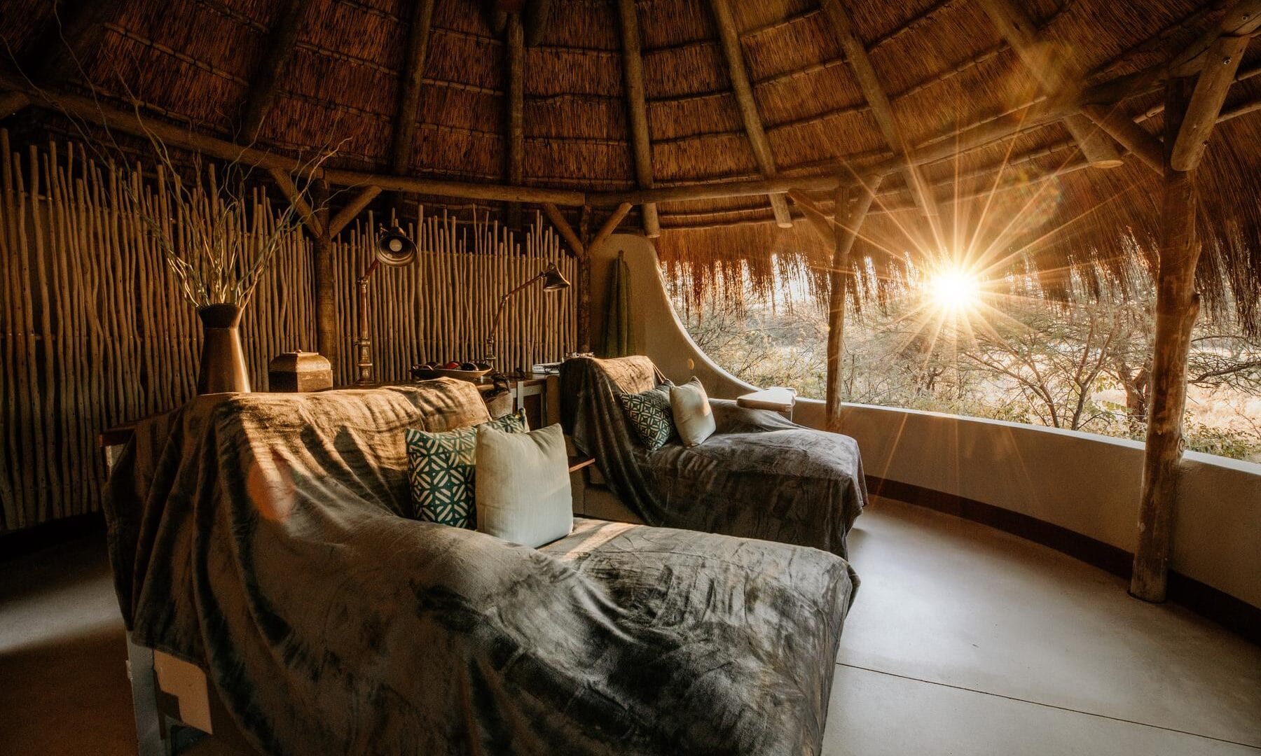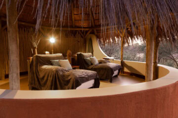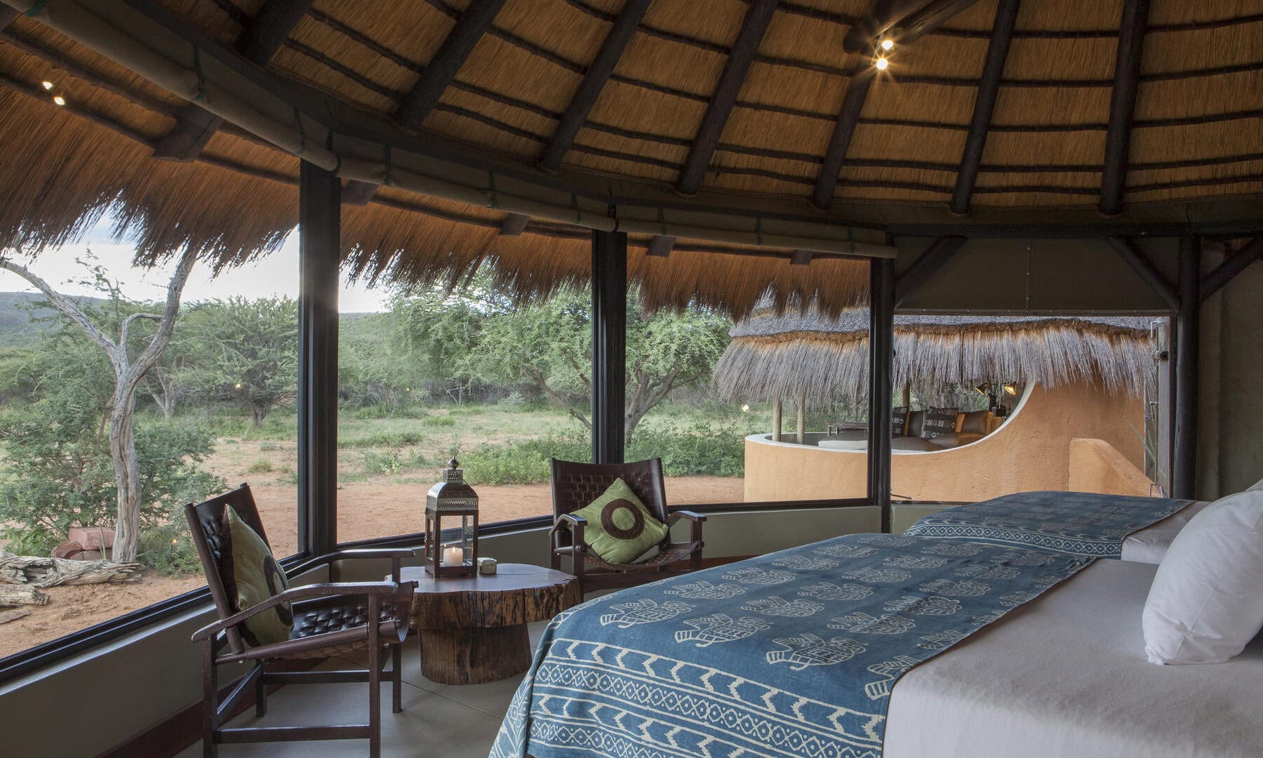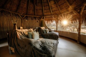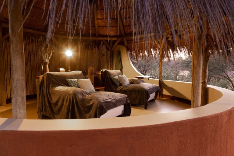 The Okonjima Luxury Bush Camp, located within the 2,000-hectare Okonjima Nature Reserve, offers a blend of luxury and nature. This camp includes 8 thatched, stylishly designed chalets, a junior suite, and a unique camelthorn pod-shaped lapa for reception, shopping, dining, and relaxation. Guests can enjoy a private swimming pool and both indoor and outdoor lounge areas.