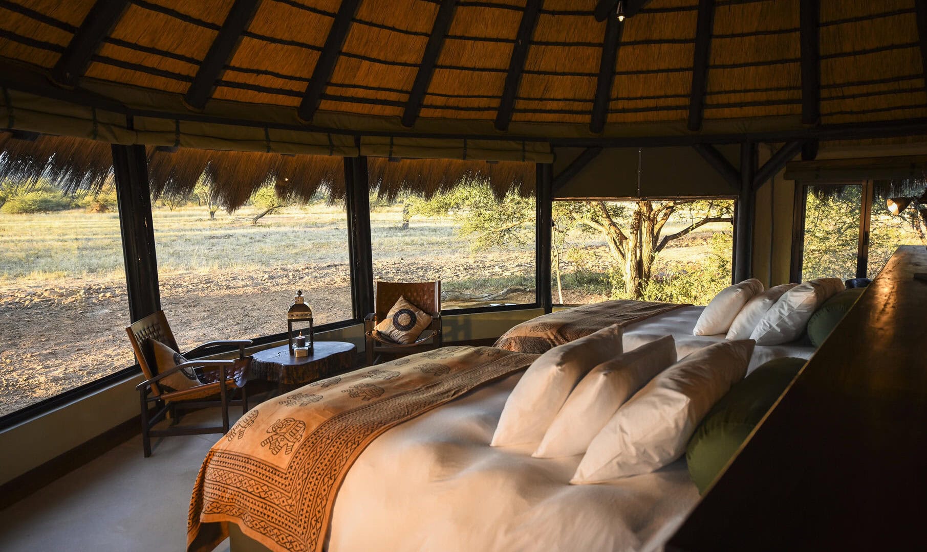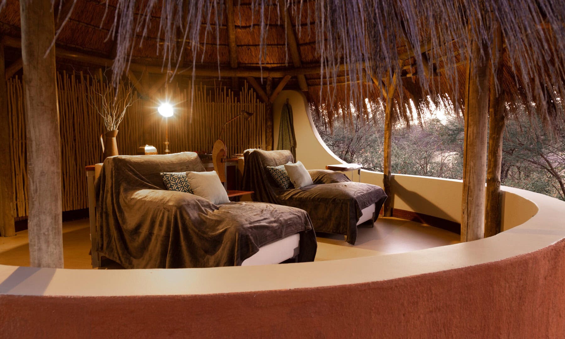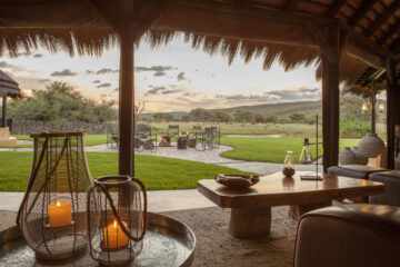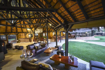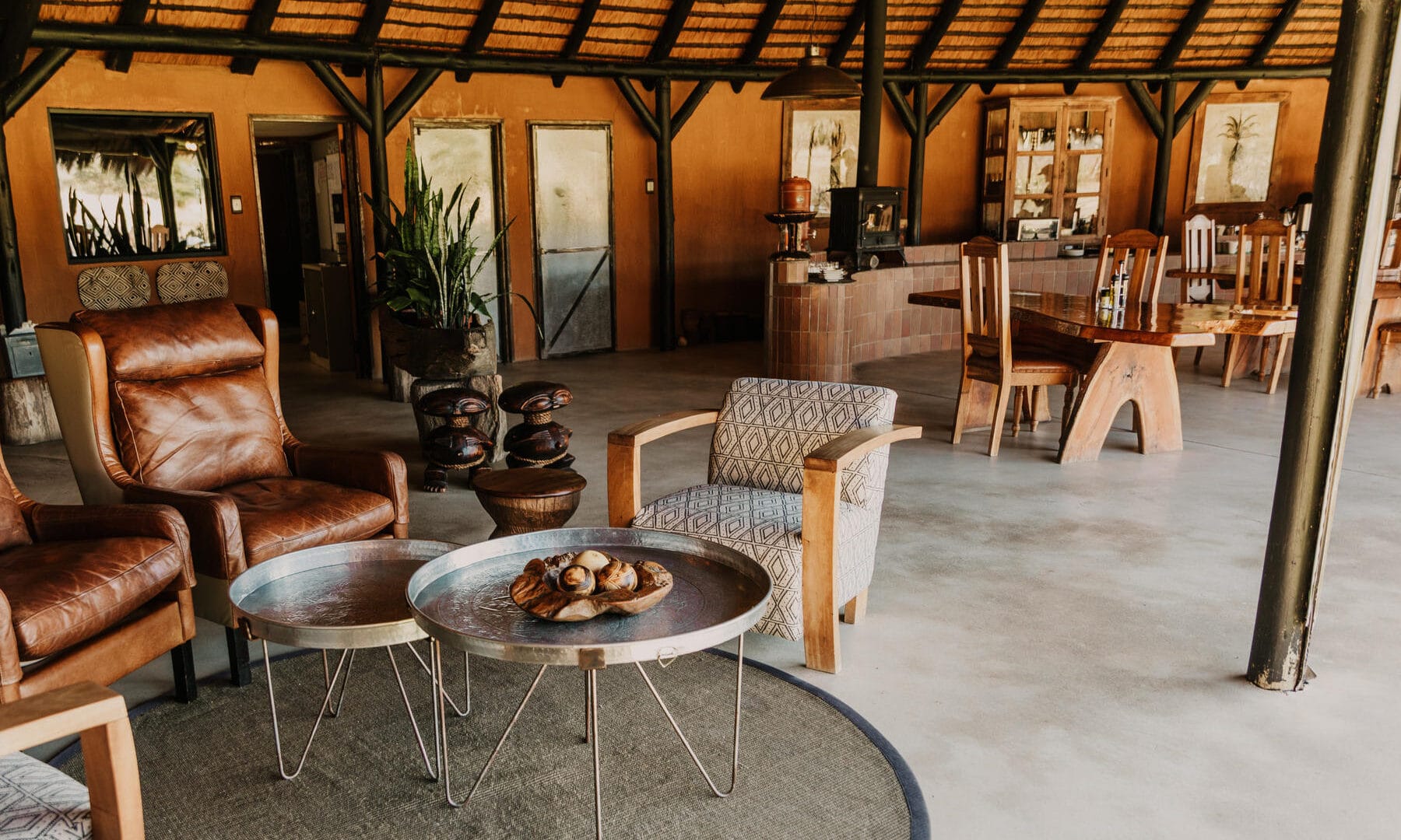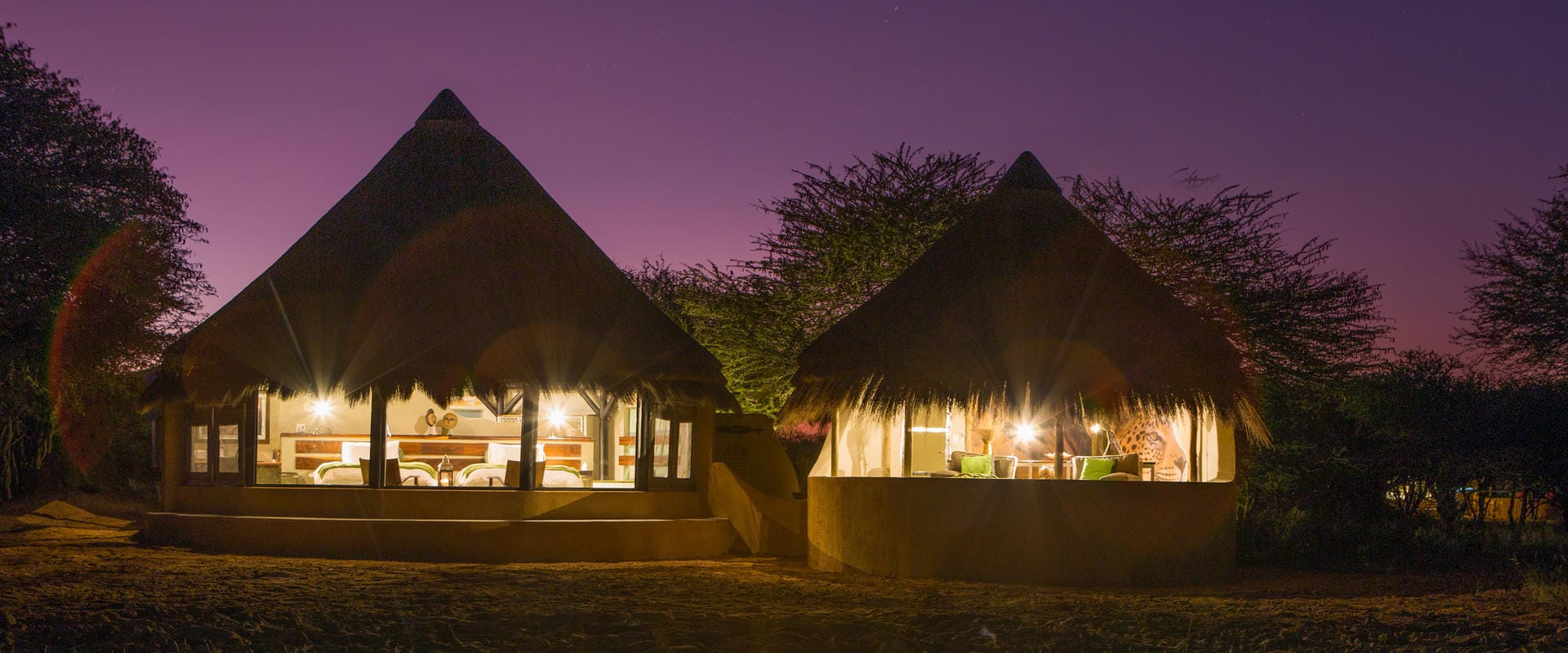 The Okonjima Luxury Bush Camp, located within the 2,000-hectare Okonjima Nature Reserve, offers a blend of luxury and nature. This camp includes 8 thatched, stylishly designed chalets, a junior suite, and a unique camelthorn pod-shaped lapa for reception, shopping, dining, and relaxation. Guests can enjoy a private swimming pool and both indoor and outdoor lounge areas.