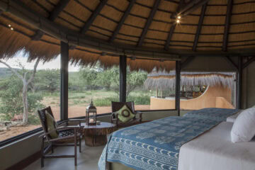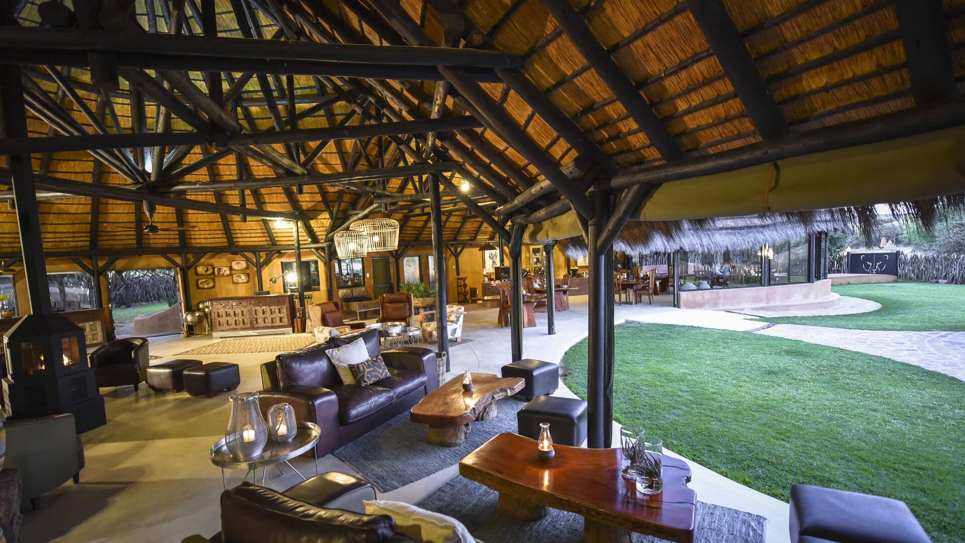The Okonjima Luxury Bush Camp, located within the 2,000-hectare Okonjima Nature Reserve, offers a blend of luxury and nature. This camp includes 8 thatched, stylishly designed chalets, a junior suite, and a unique camelthorn pod-shaped lapa for reception, shopping, dining, and relaxation. Guests can enjoy a private swimming pool and both indoor and outdoor lounge areas.