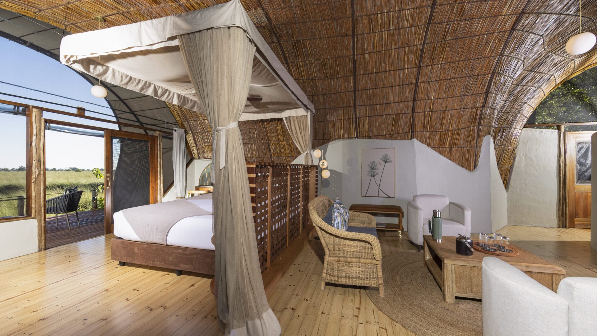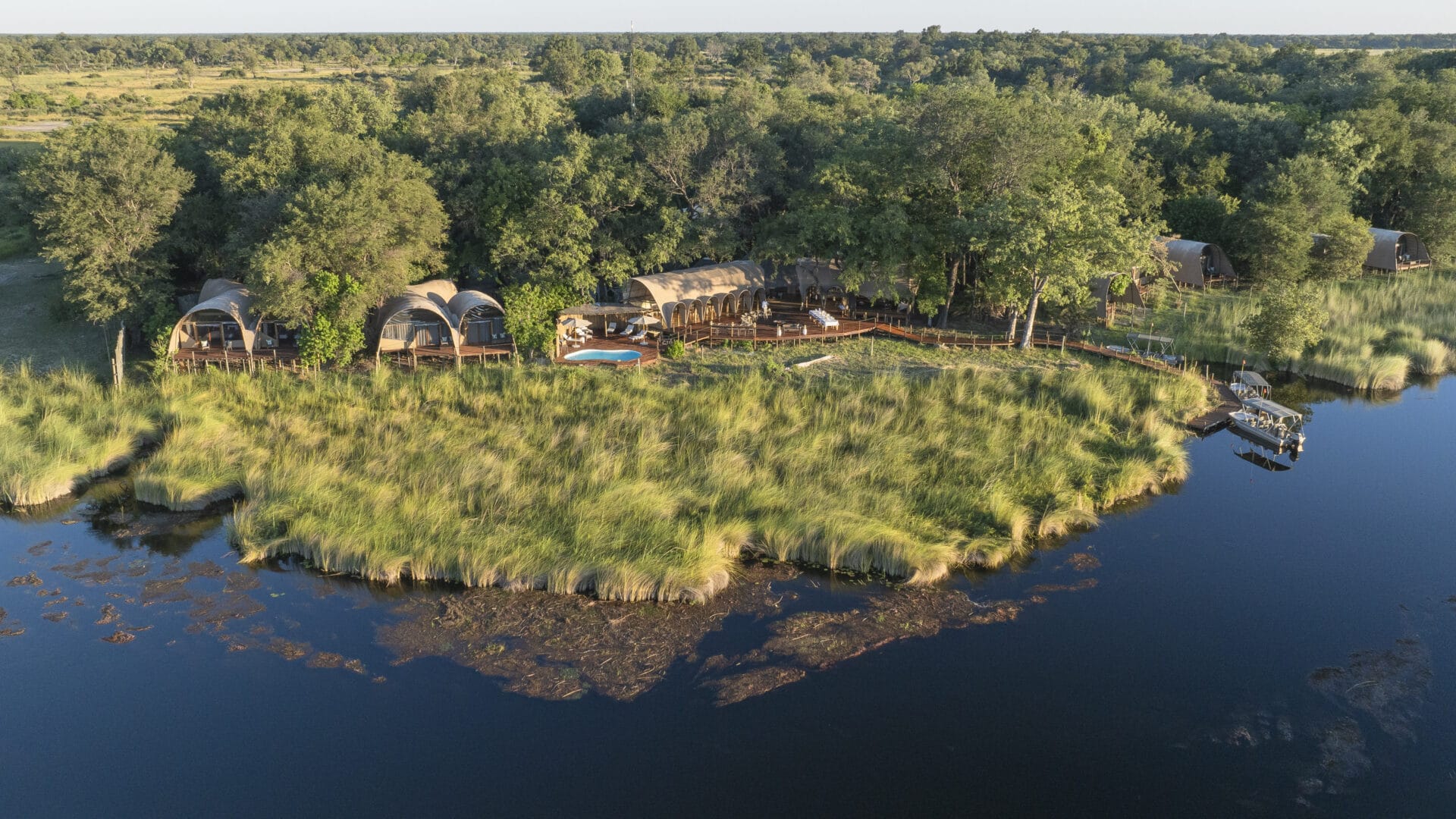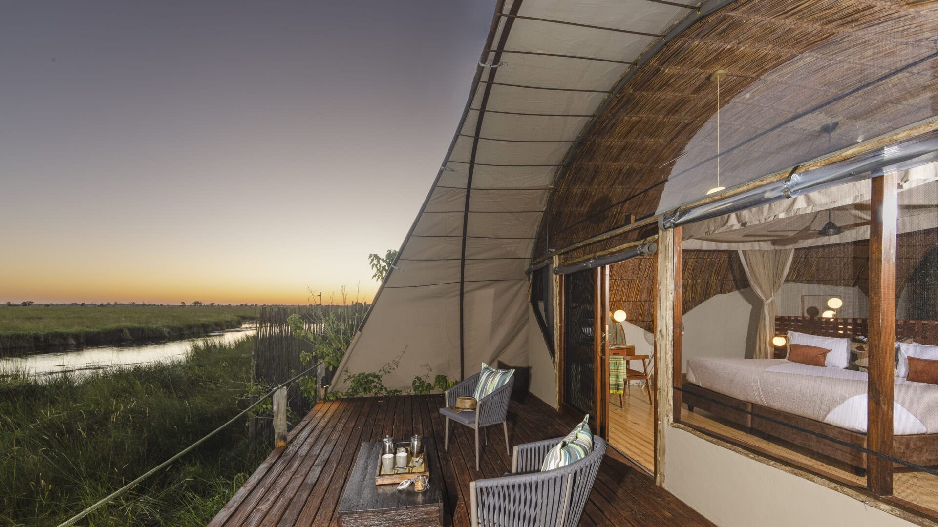 Overlooking the serene Maunachira River, known for its abundant birdlife and sandy banks, the camp comprises five spacious twin and double-bedded “Masasas” (ancient tribal word for house of reeds), each with en-suite bathrooms featuring both indoor and outdoor showers.