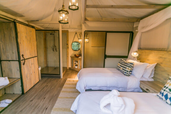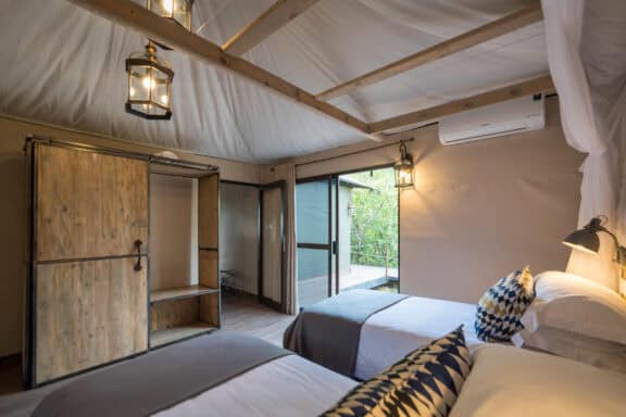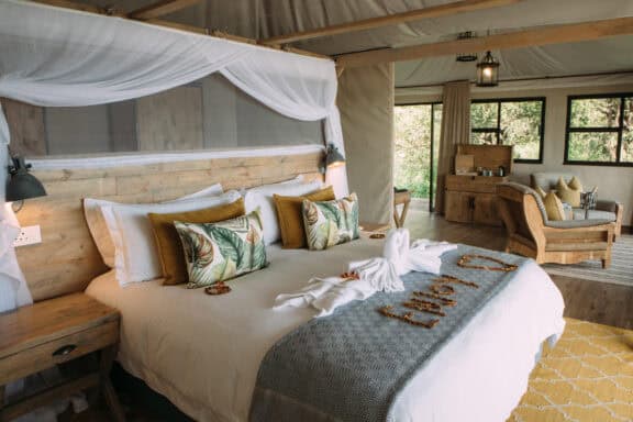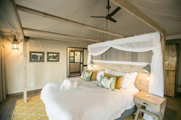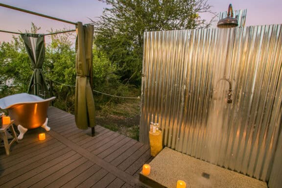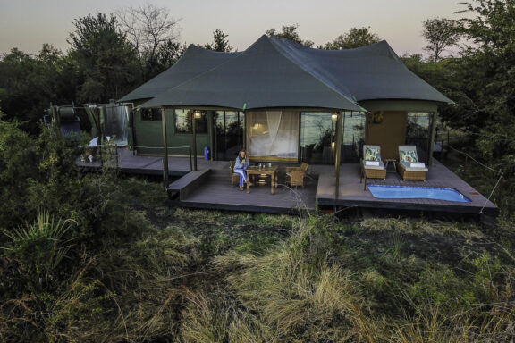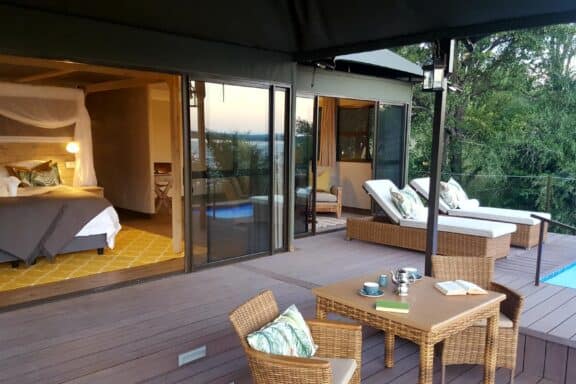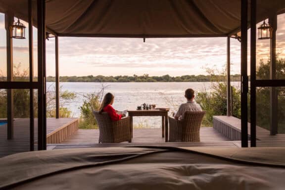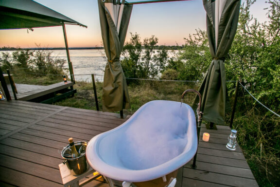 The spacious canvas en-suite rooms offer the perfect blend of modern luxury and authentic safari charm, featuring a private lounge, viewing deck, indoor and outdoor showers, plunge pool, and an outdoor bath with uninterrupted views of the Zambezi.
