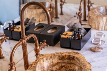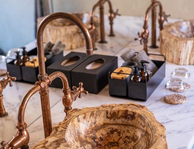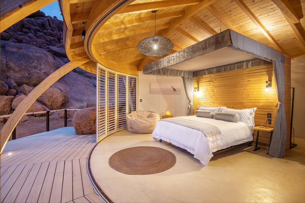 The camp’s six suites, hidden among the granite boulders, feature naturally ventilated interiors, partially open-air bathrooms, and communal areas designed to maximize the stunning vistas, with louvered shutters allowing for seamless integration with nature or privacy as desired.