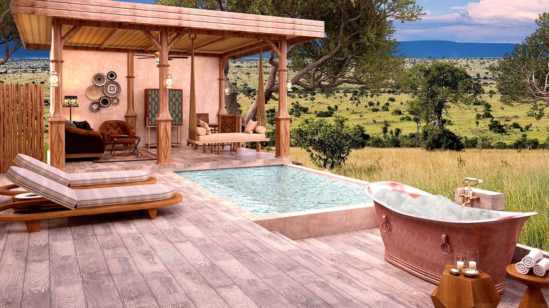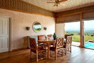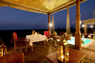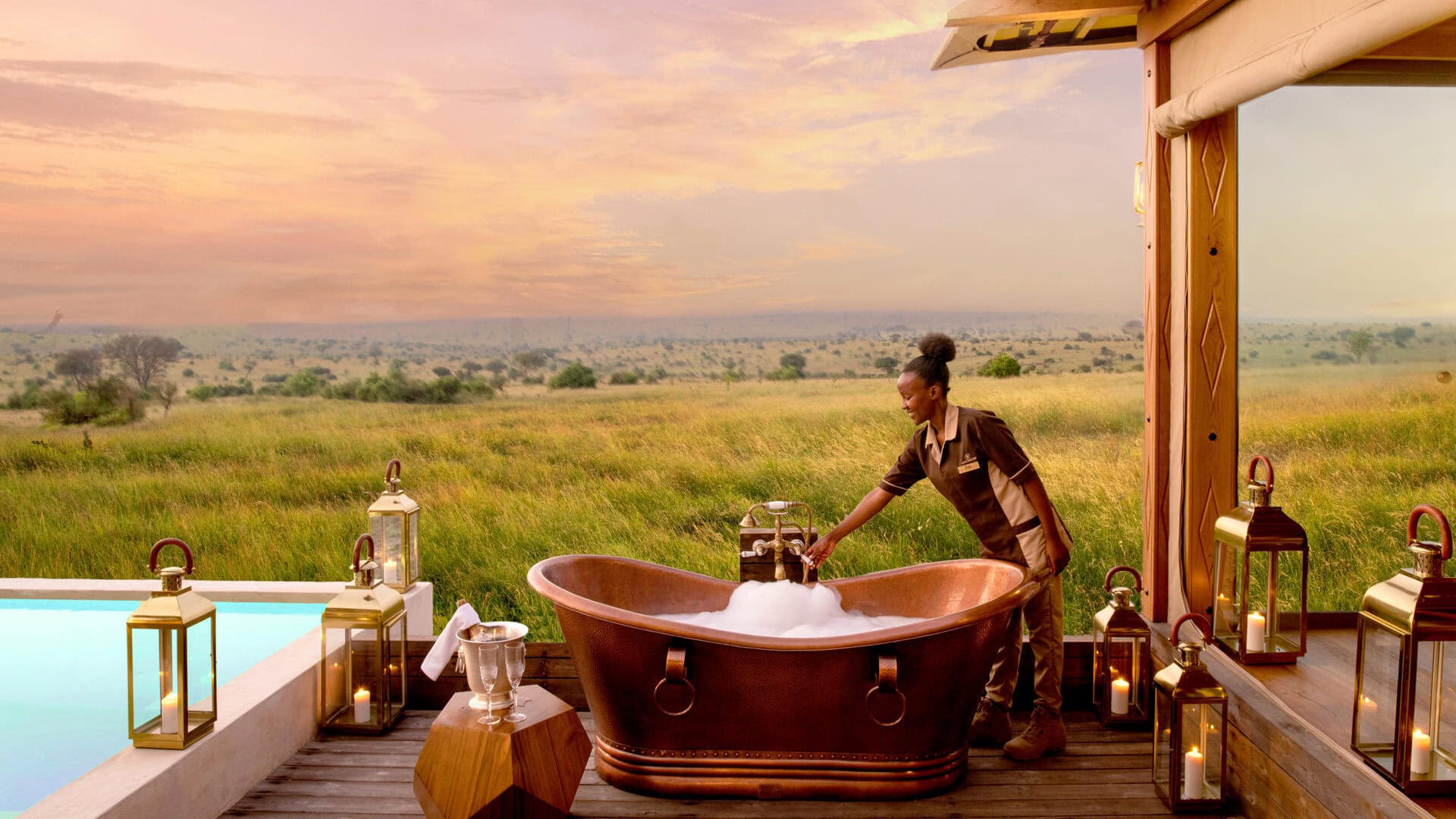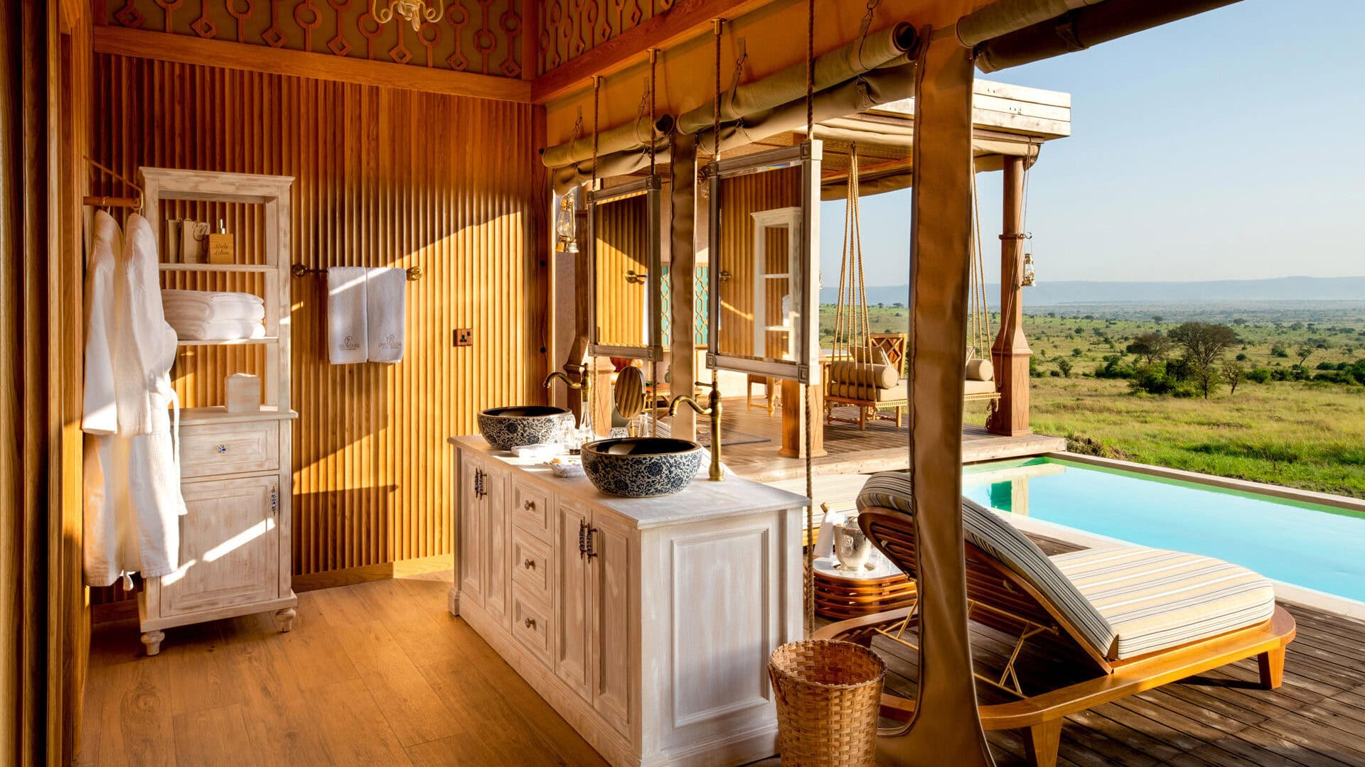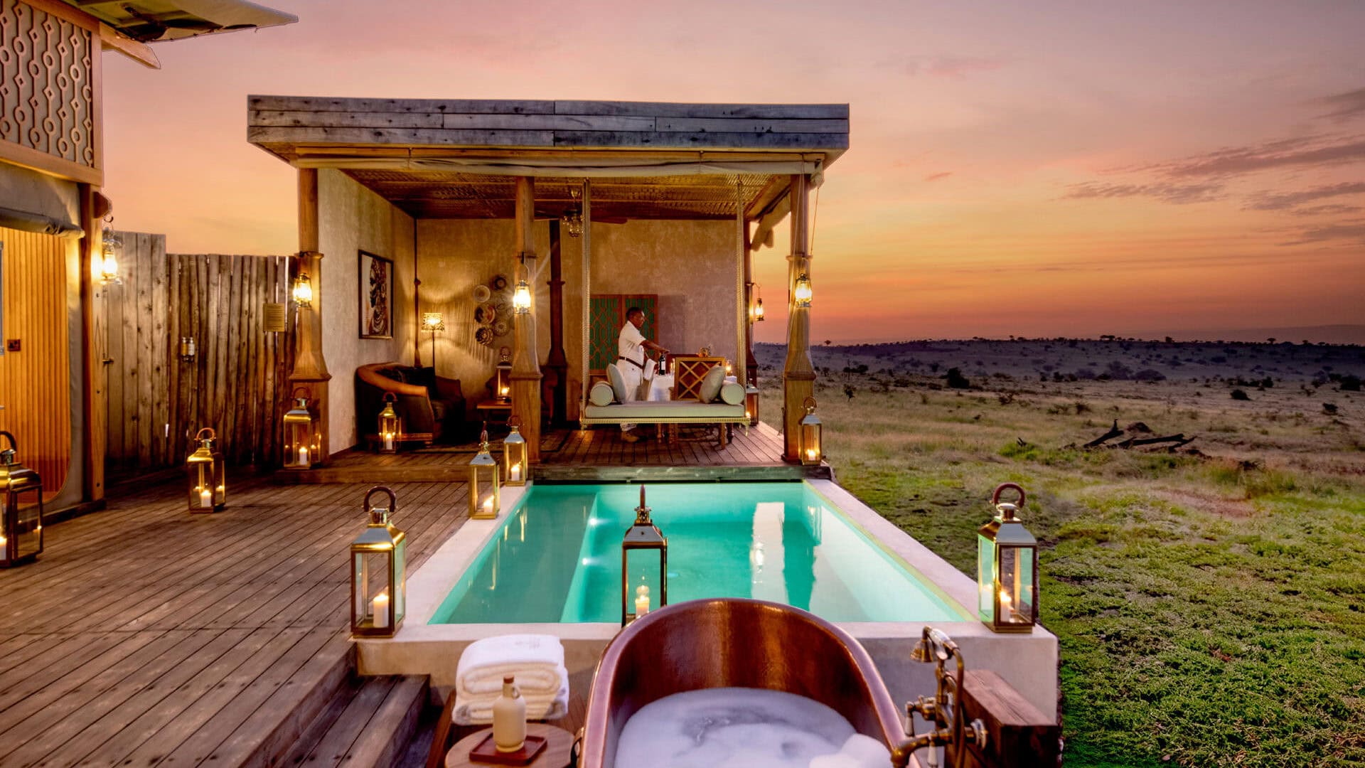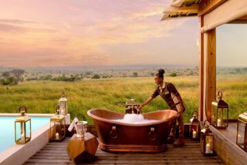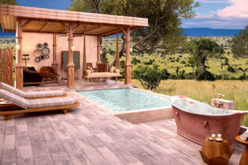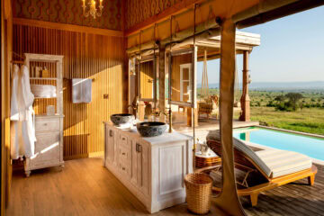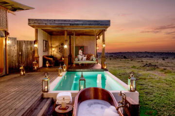 The lodge features seven luxurious villas, including a spacious two-bedroom family villa, each equipped with a private sun deck, heated pool, freestanding bathtub, and both indoor and outdoor showers. The Presidential Family Villa adds extra space and privacy with a living area, in-room bar, and copper bathtubs that open out to the sights and sounds of the bush.