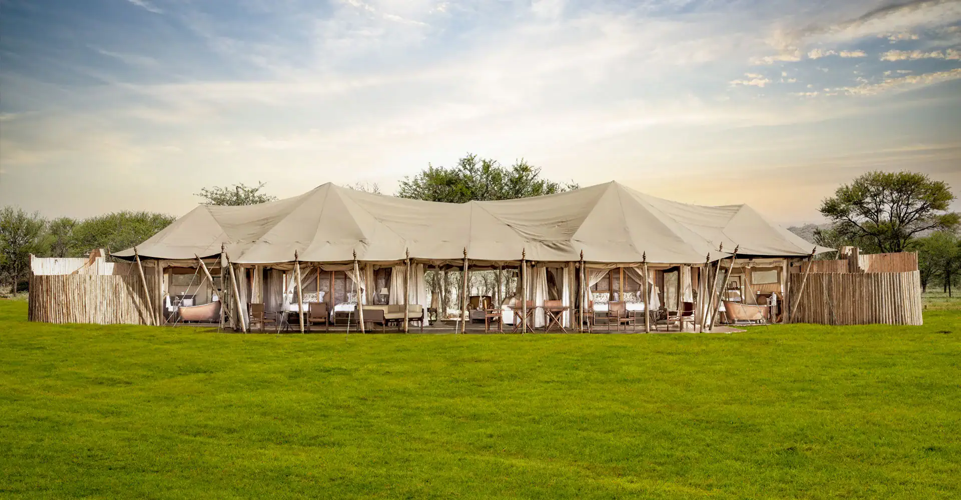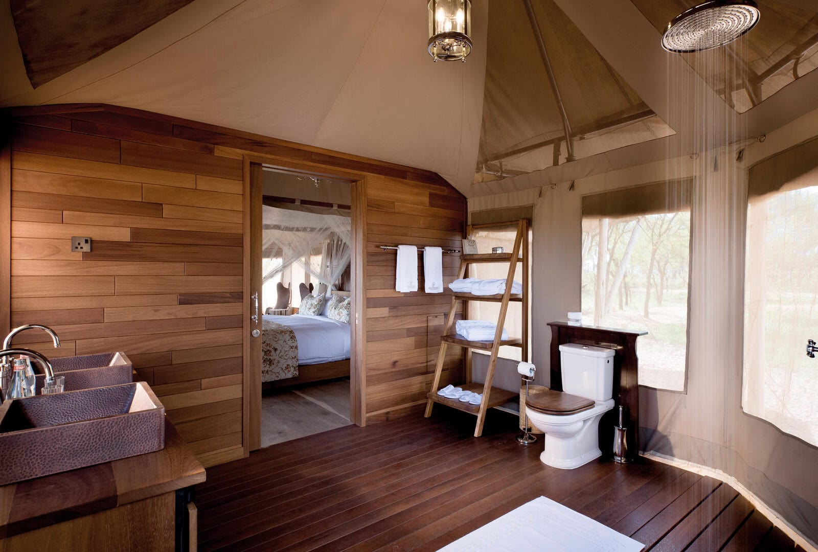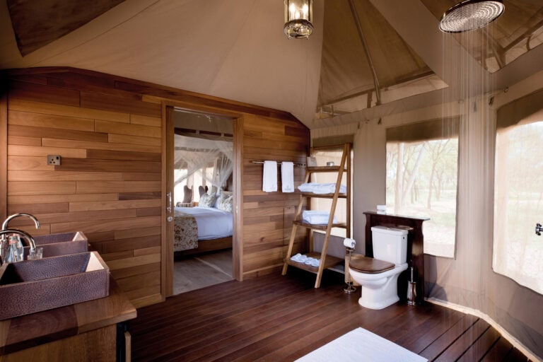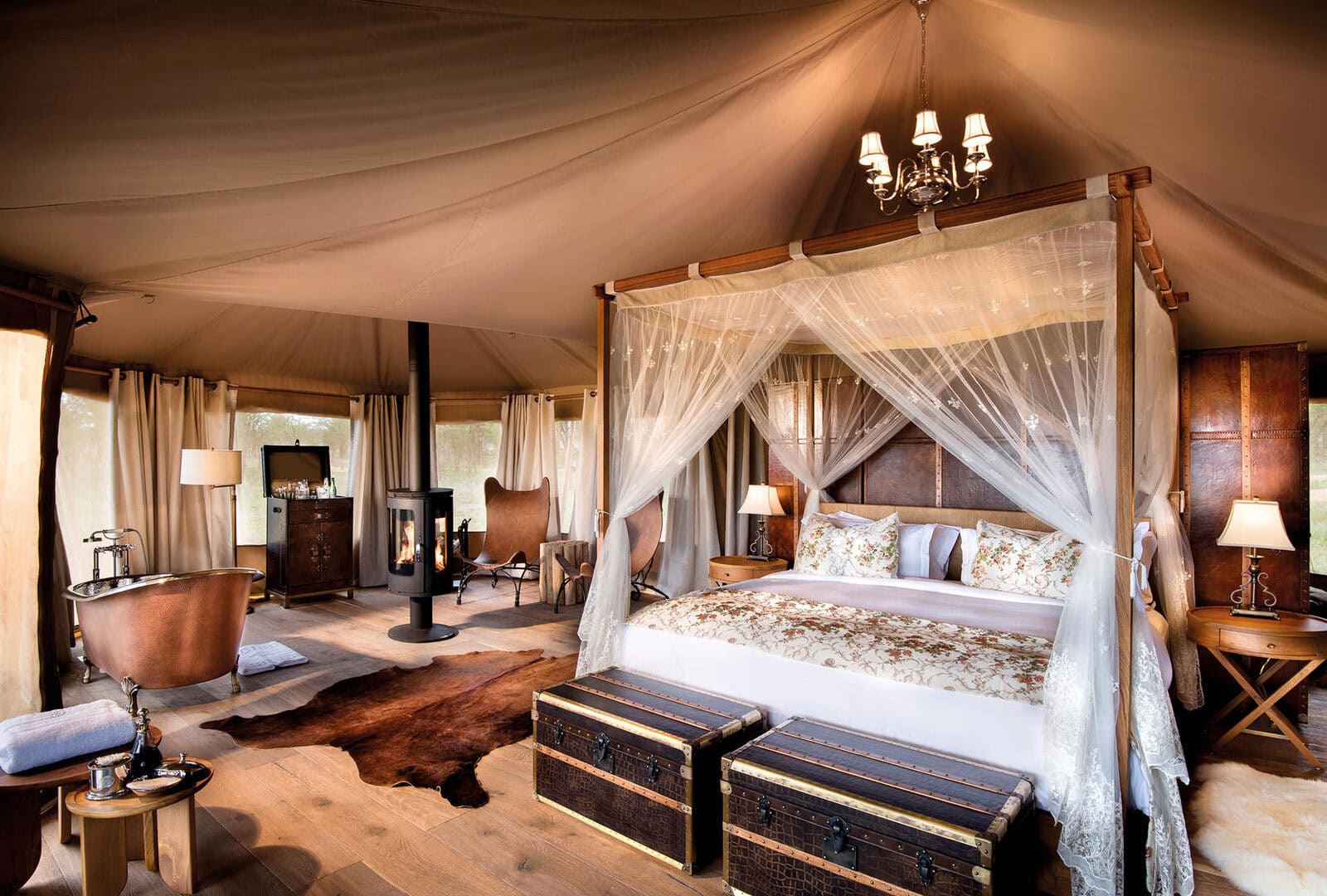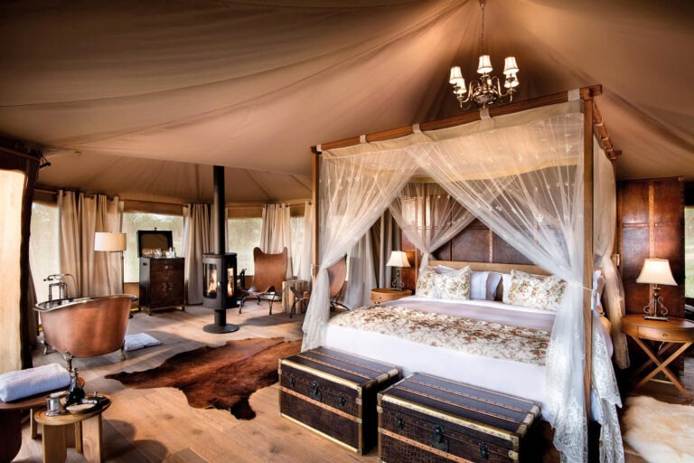 This elegant, tented lodge feels both expansive and private, with 14 suites that blend into the surrounding savannah. Each tent is designed with refined finishes and uninterrupted views, featuring indoor and outdoor showers, a freestanding copper bathtub, and a private shaded deck. Wood-burning stoves, in-room bars, and personalised butler service add to the sense of comfort and detail.