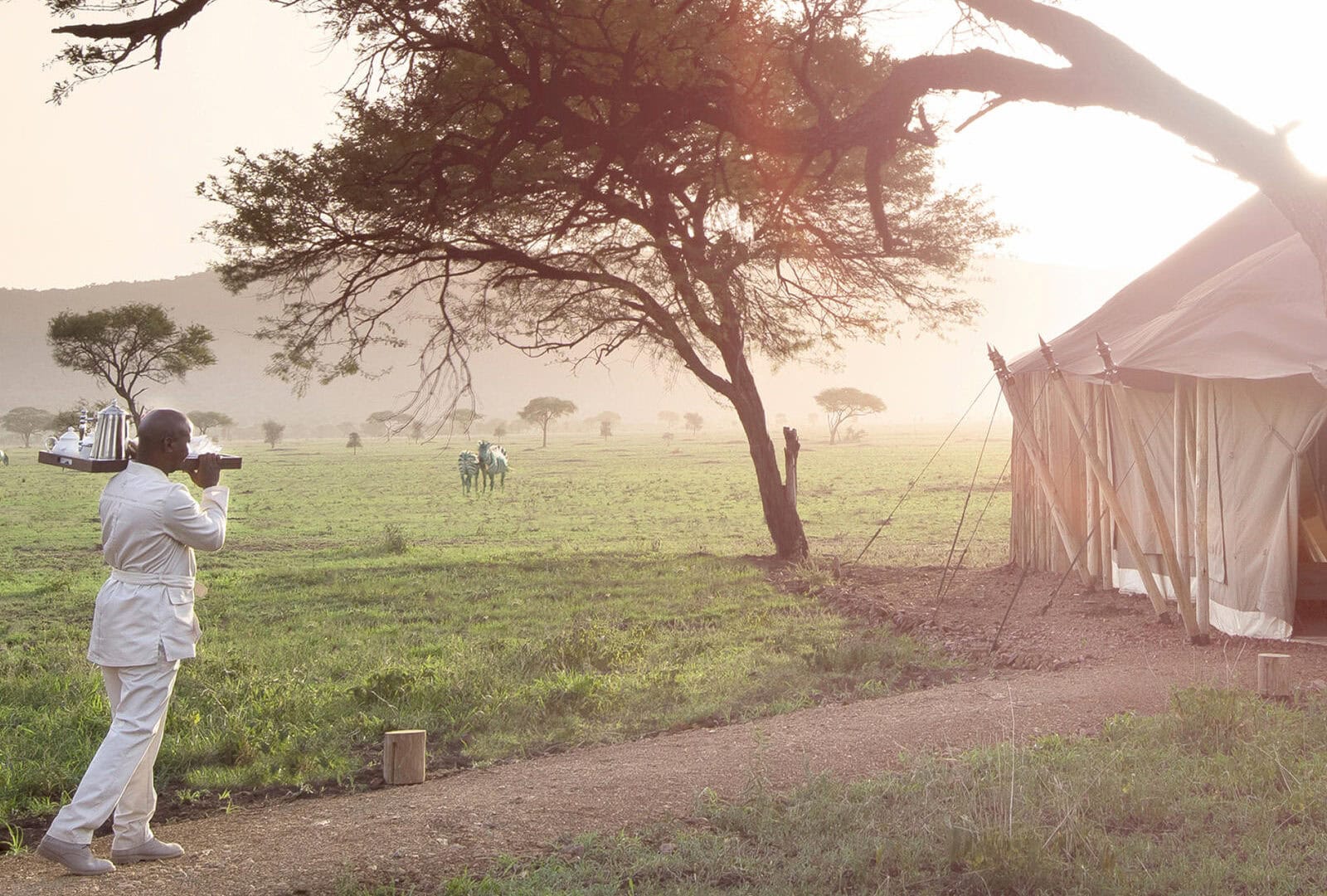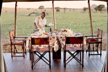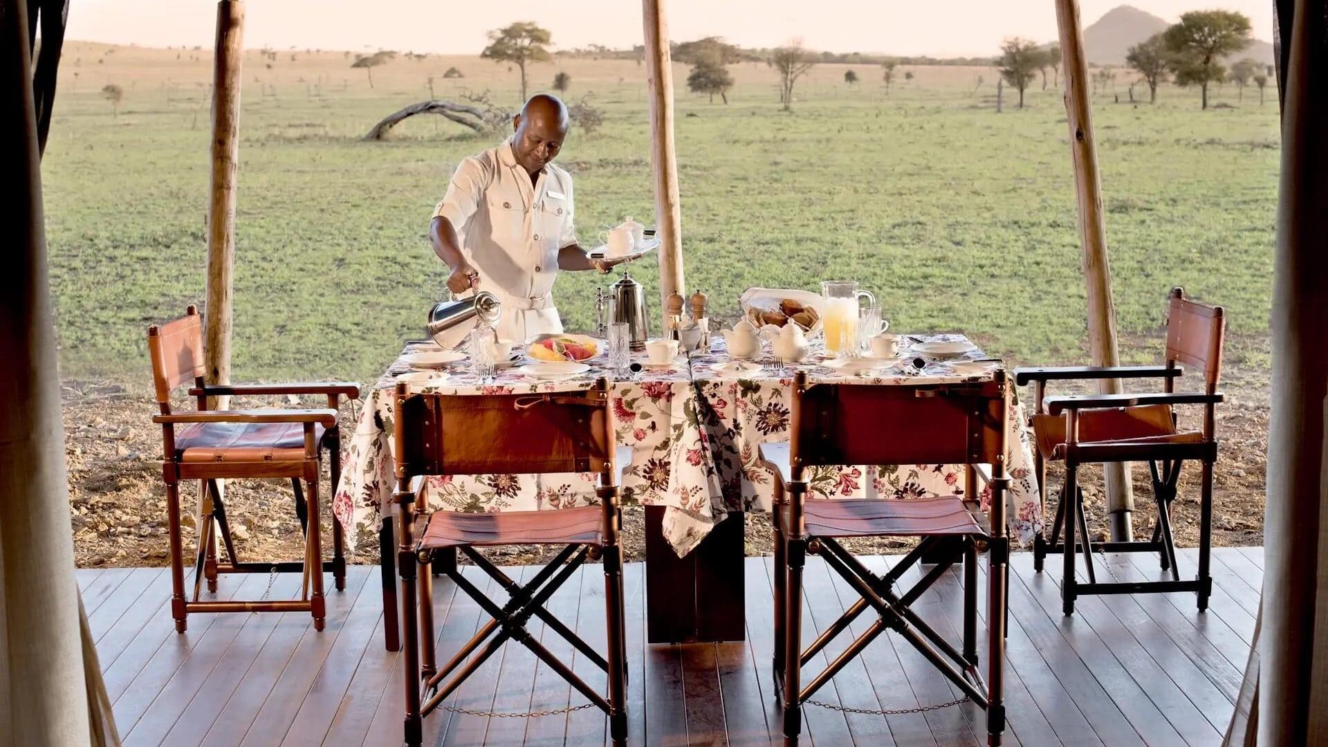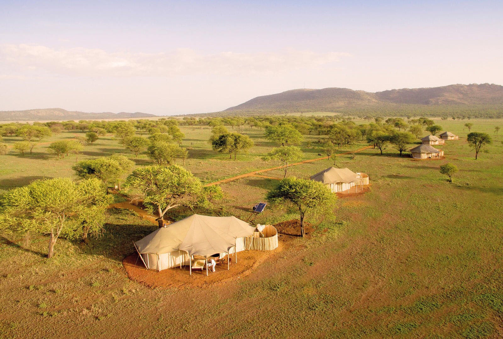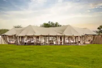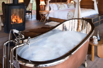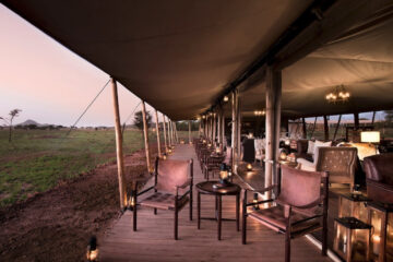 This elegant, tented lodge feels both expansive and private, with 14 suites that blend into the surrounding savannah. Each tent is designed with refined finishes and uninterrupted views, featuring indoor and outdoor showers, a freestanding copper bathtub, and a private shaded deck. Wood-burning stoves, in-room bars, and personalised butler service add to the sense of comfort and detail.