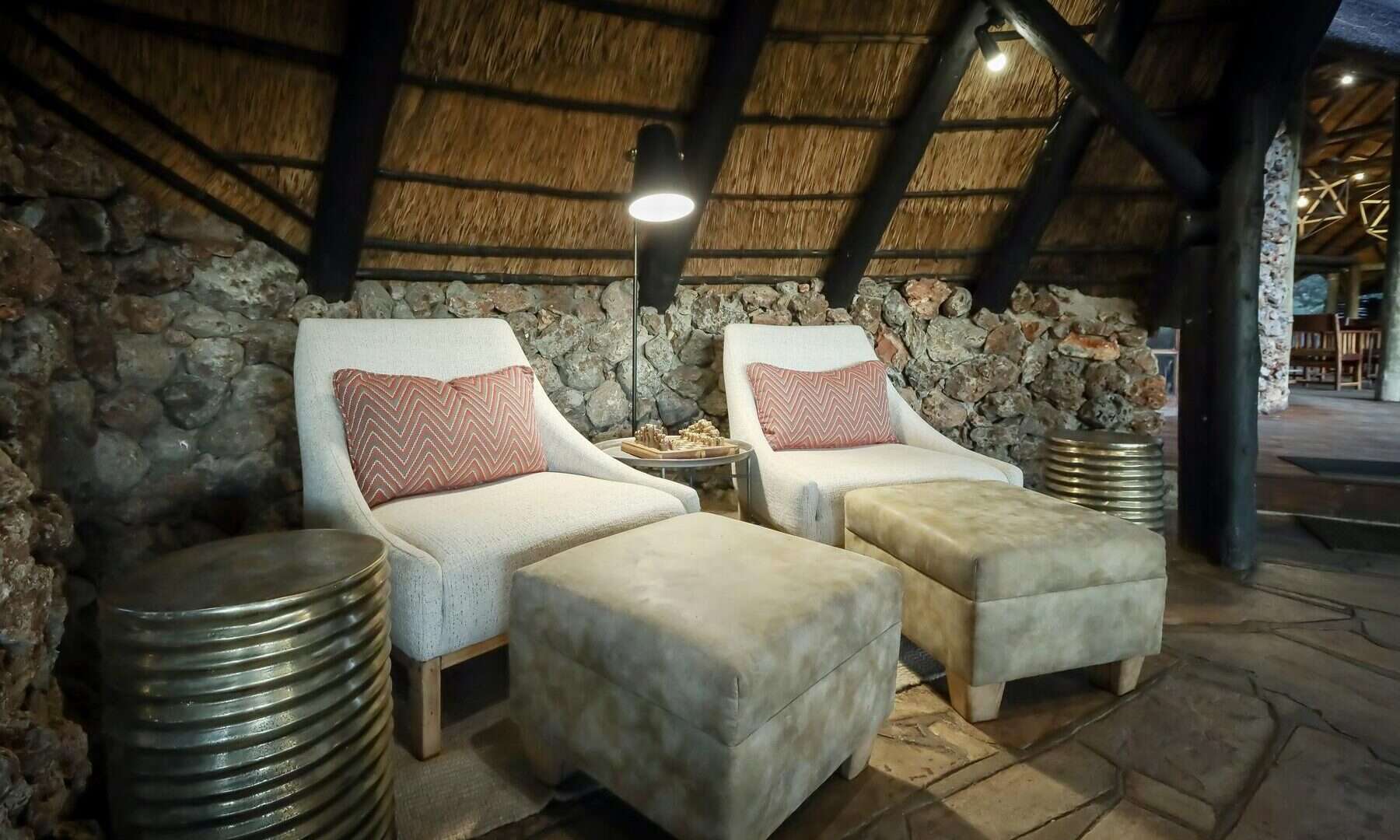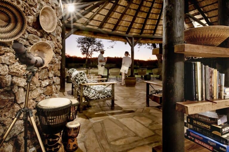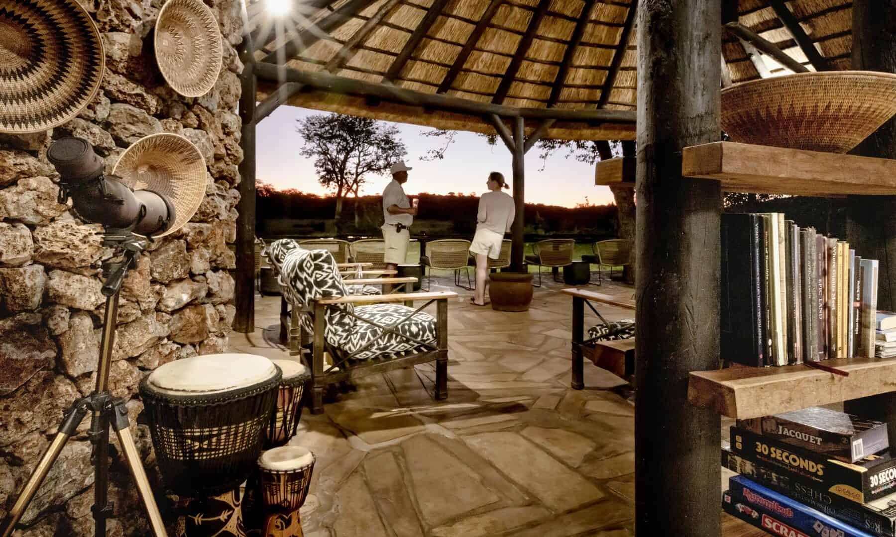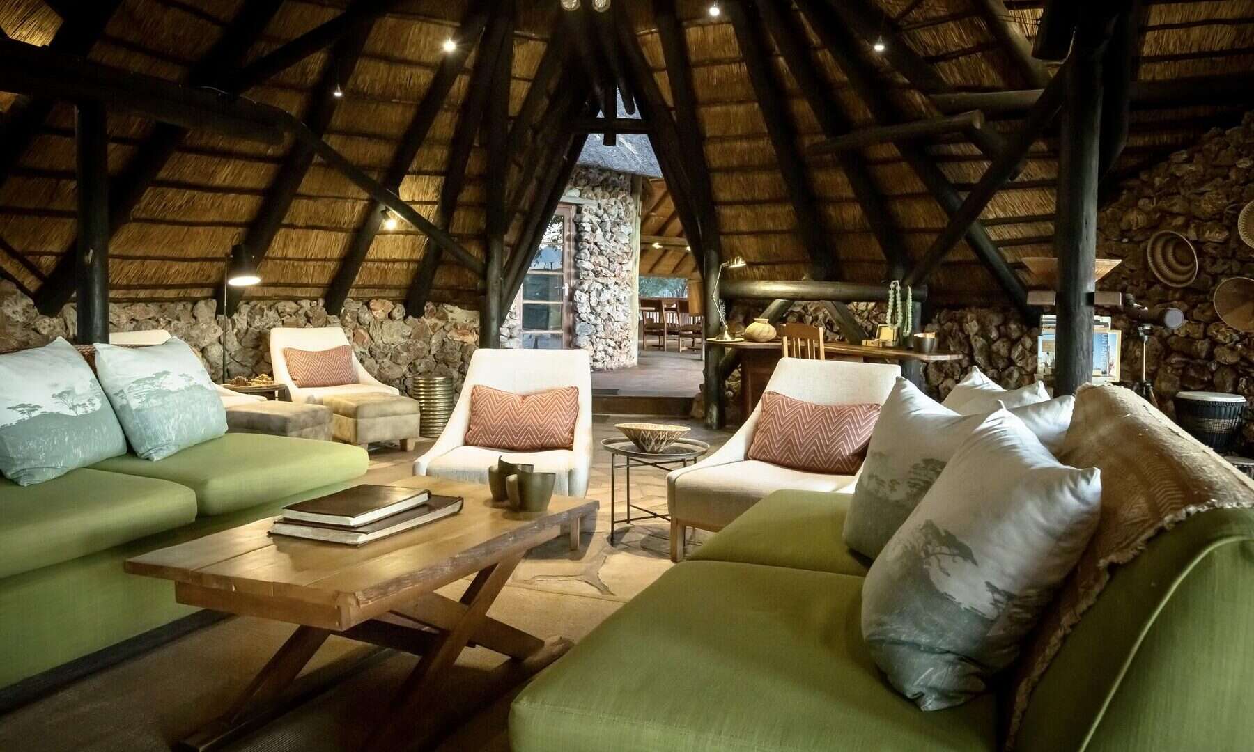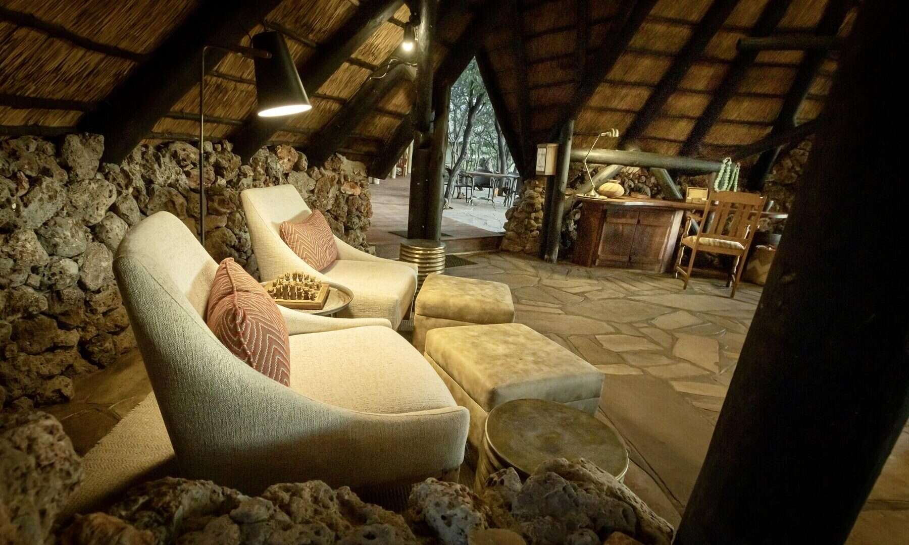 The main area, built of stone, canvas and thatch, fronts onto a much-frequented waterhole; watching wildlife coming to drink from here or from the swimming pool is a favourite pastime.