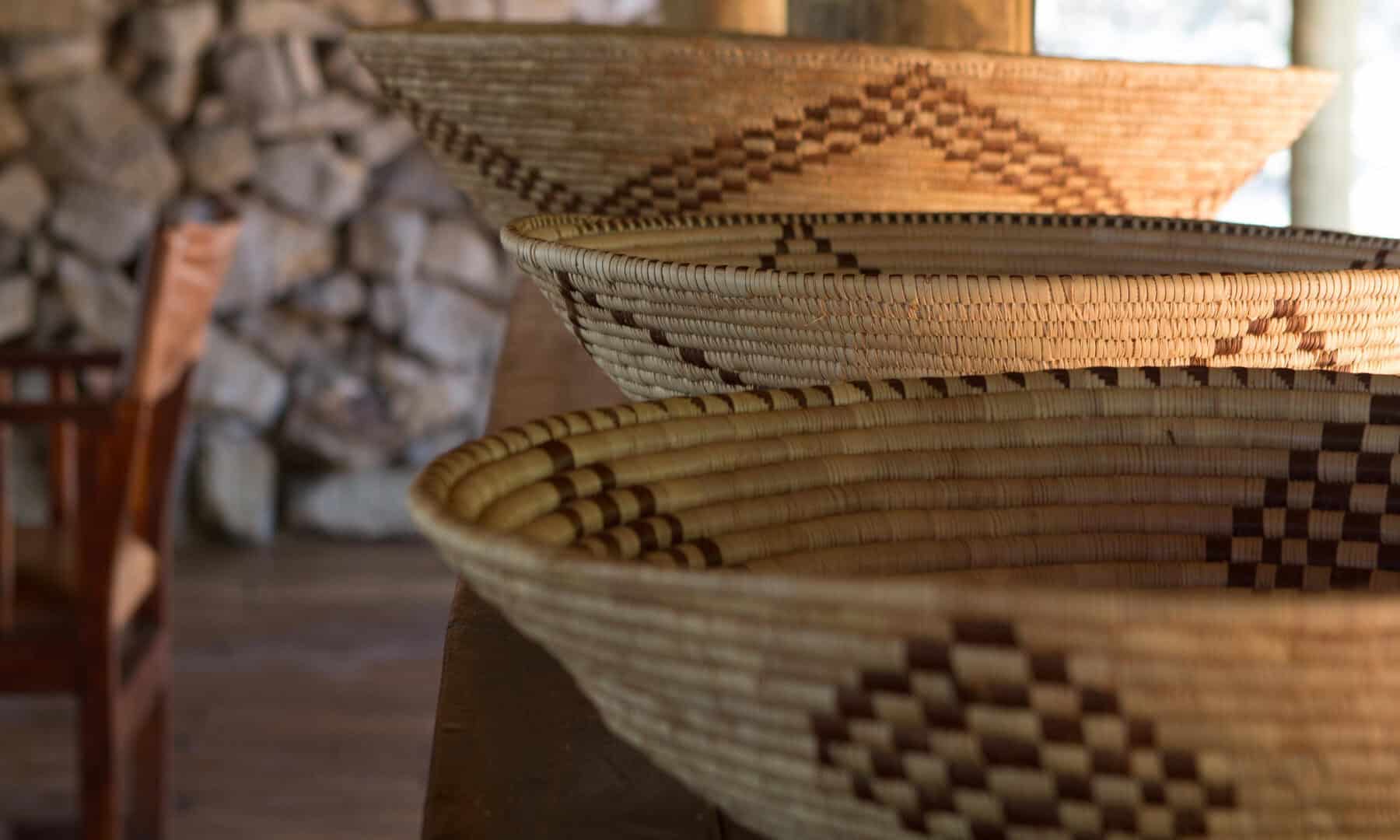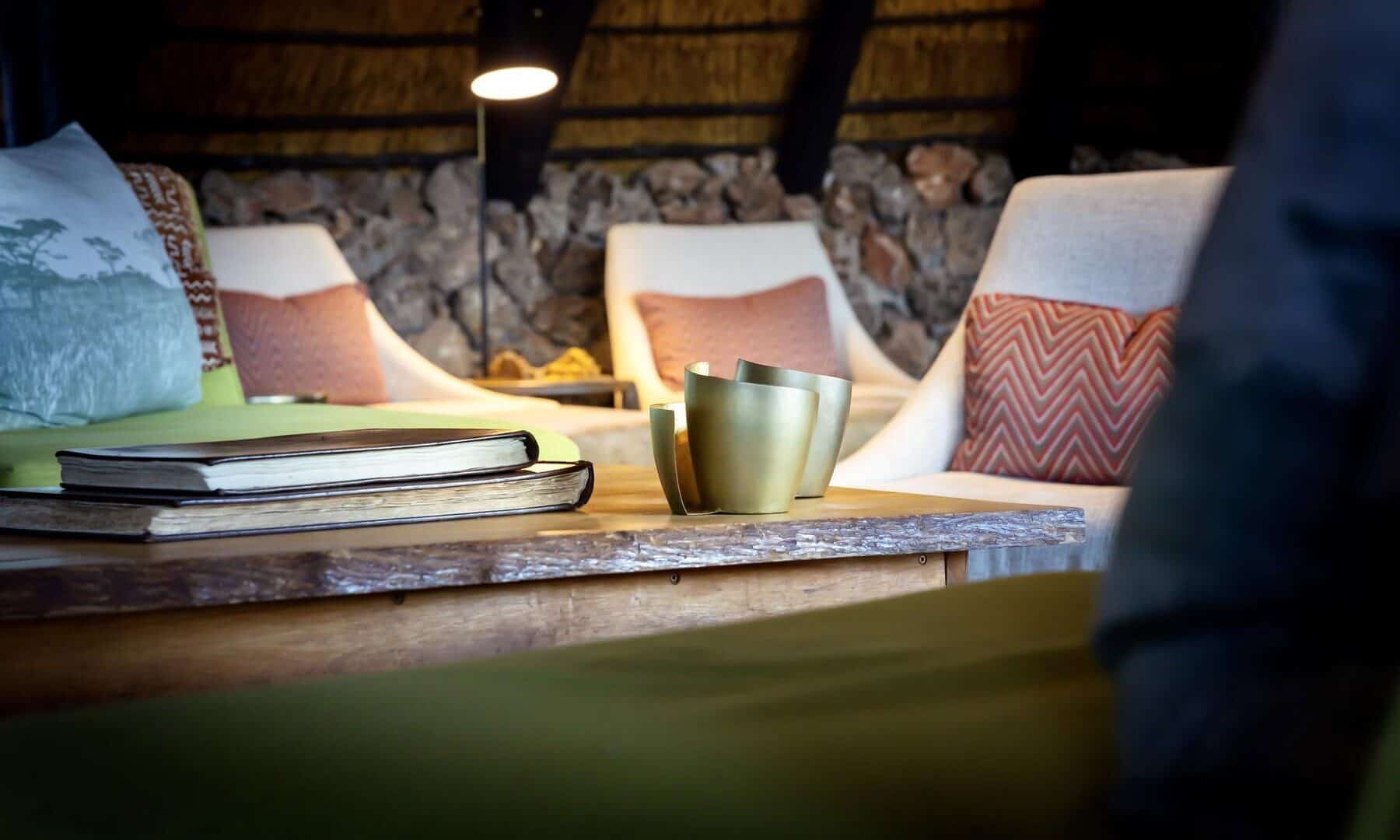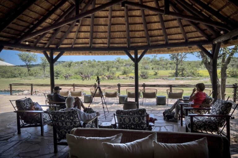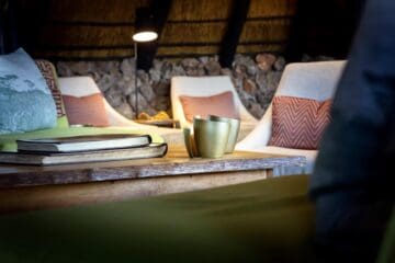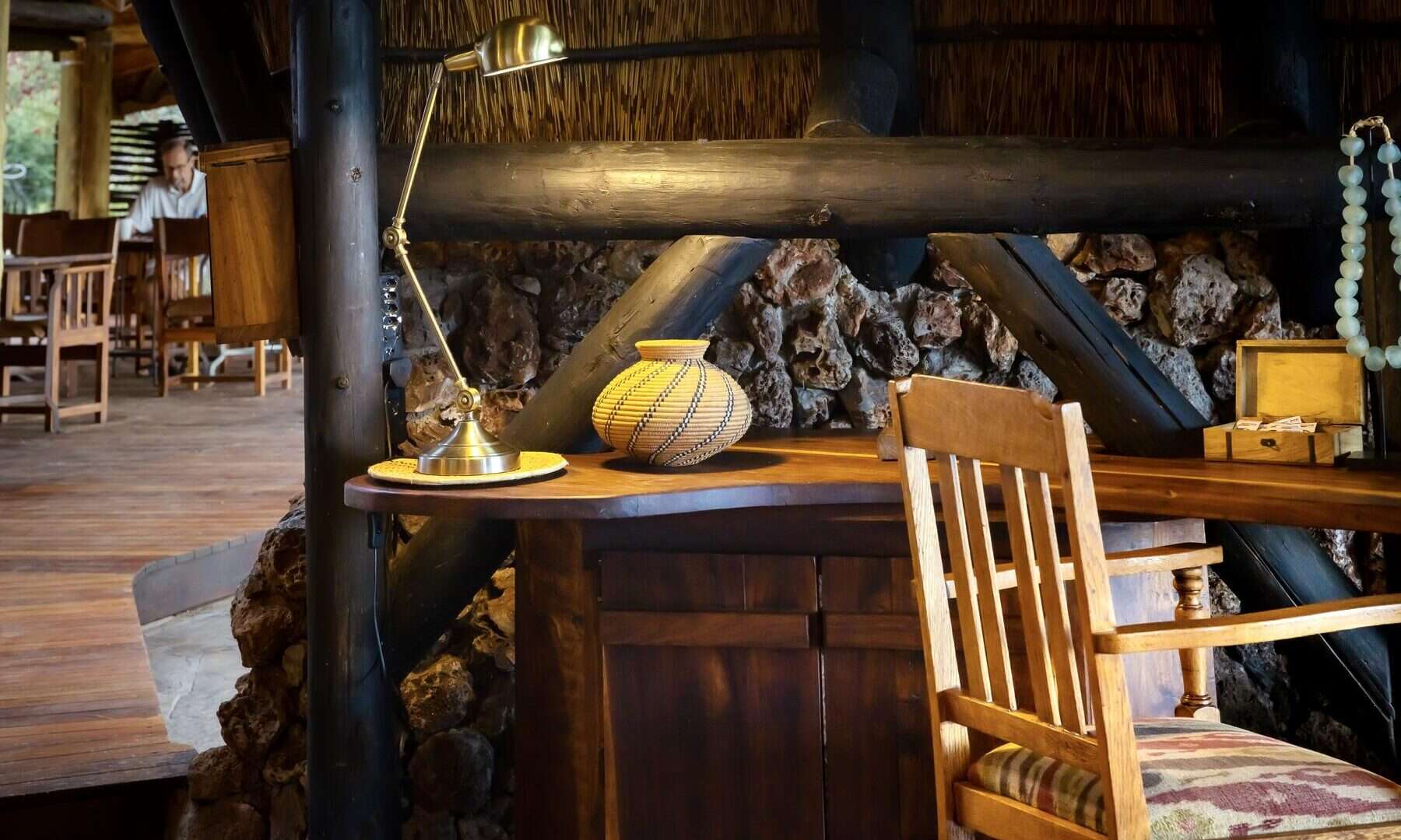 The main area, built of stone, canvas and thatch, fronts onto a much-frequented waterhole; watching wildlife coming to drink from here or from the swimming pool is a favourite pastime.